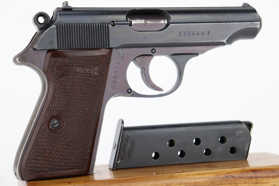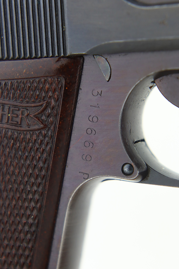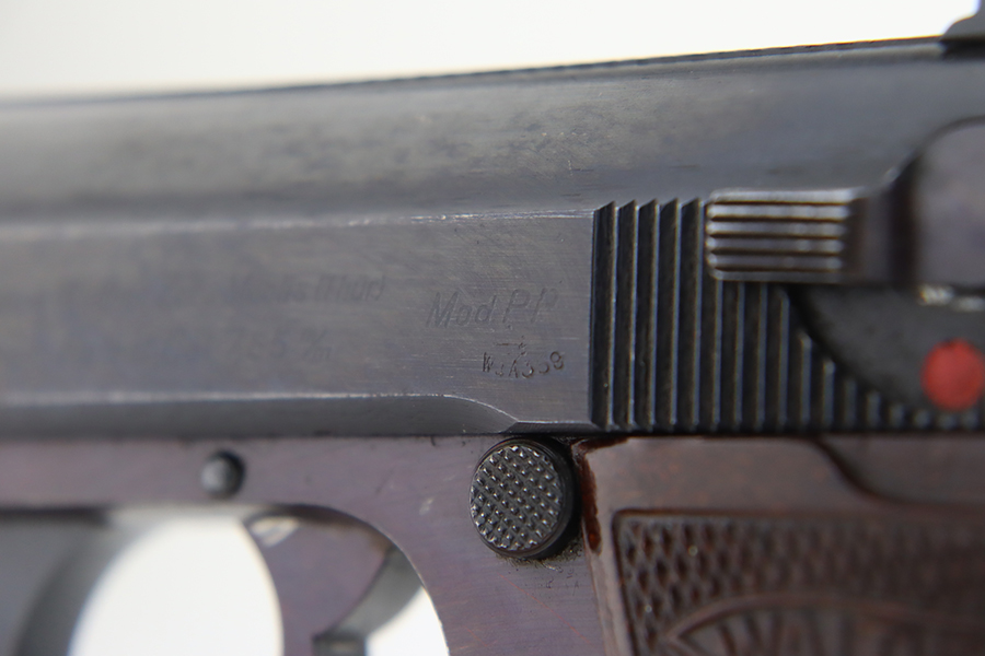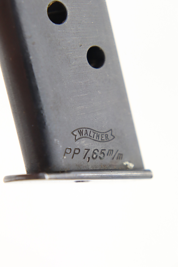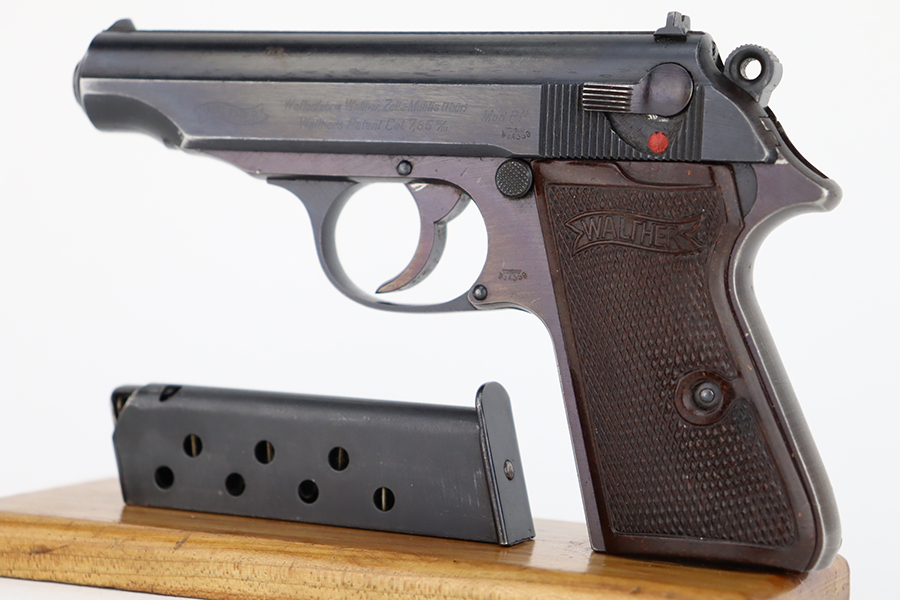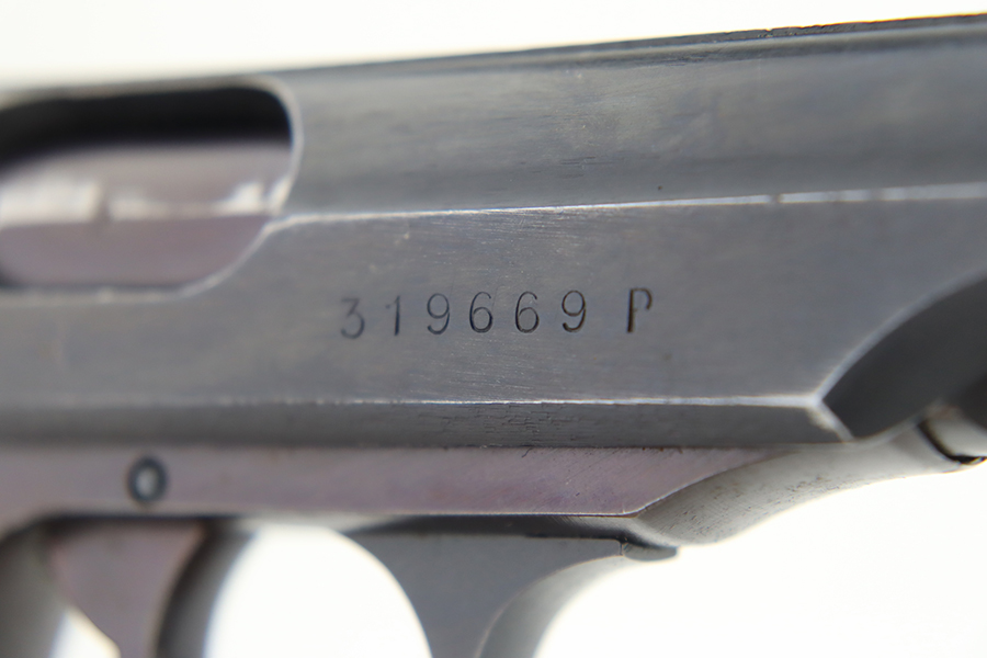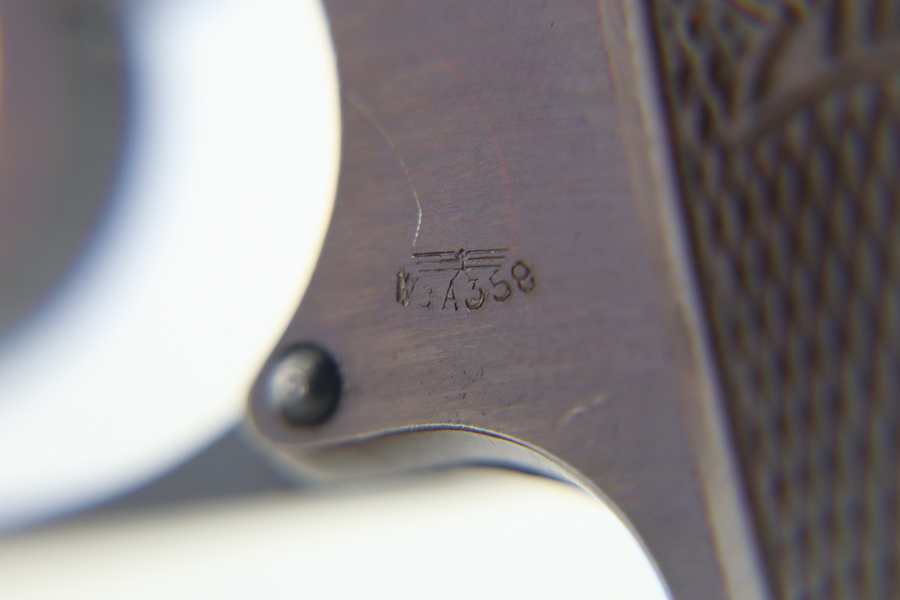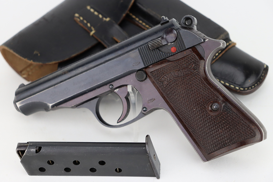 1/26/24 – This is an excellent example of a Walther PP issued to the Nazi military in 1943. All matching with the proper “Waffen 359” military acceptance proofs on the slide and frame. The bluing on the frame and barrel have a beautiful plum tint to it, which pairs nicely with its set of scarce red bakelite grips. It comes as a rig with a proper wartime magazine and a minty black leather holster. The gun has retained about 93% of its original finish with some minor thinning on the grip straps, very minor muzzle wear, and one tiny spot of wear on the left side of the slide. One tiny ding at the base of the back strap. Excellent grips. Minty bore.