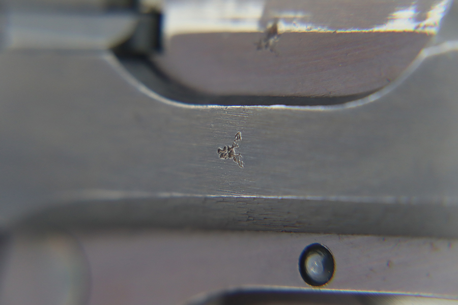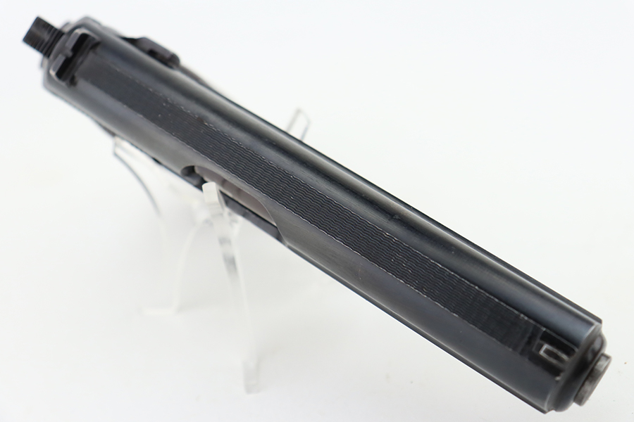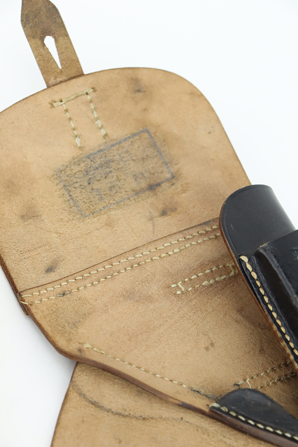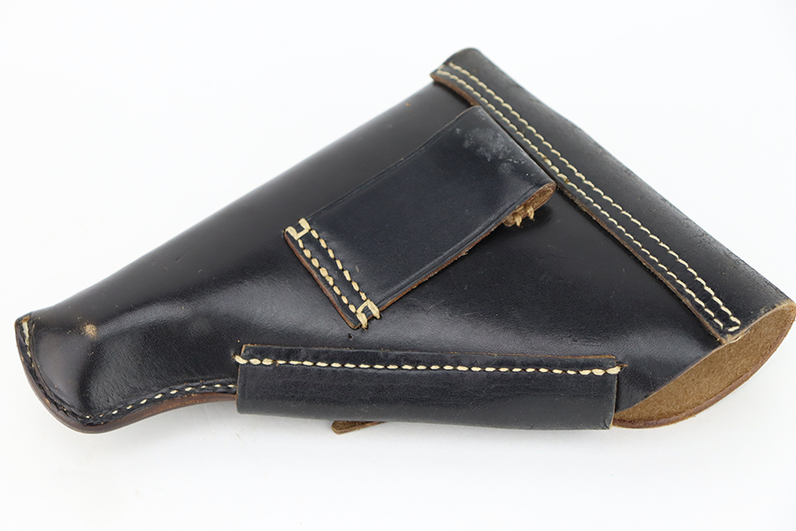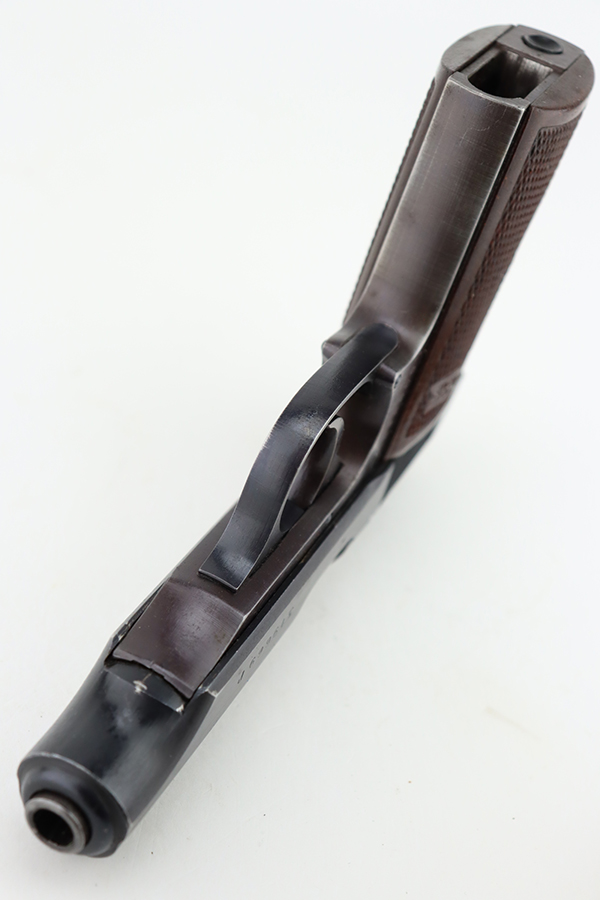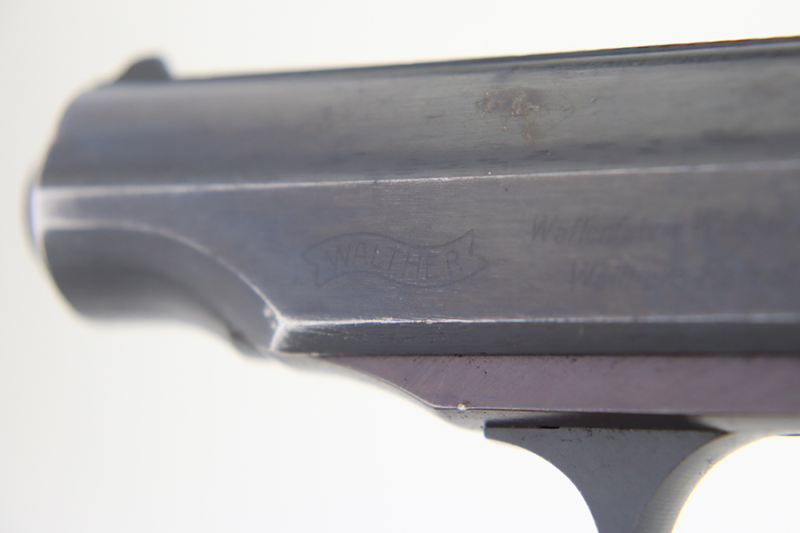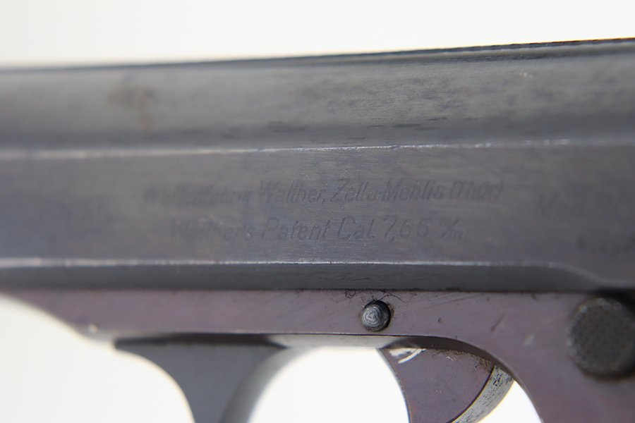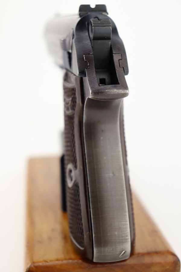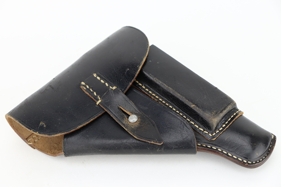 1/26/24 – This is an excellent example of a Walther PP issued to the Nazi military in 1943. All matching with the proper “Waffen 359” military acceptance proofs on the slide and frame. The bluing on the frame and barrel have a beautiful plum tint to it, which pairs nicely with its set of scarce red bakelite grips. It comes as a rig with a proper wartime magazine and a minty black leather holster. The gun has retained about 93% of its original finish with some minor thinning on the grip straps, very minor muzzle wear, and one tiny spot of wear on the left side of the slide. One tiny ding at the base of the back strap. Excellent grips. Minty bore.
