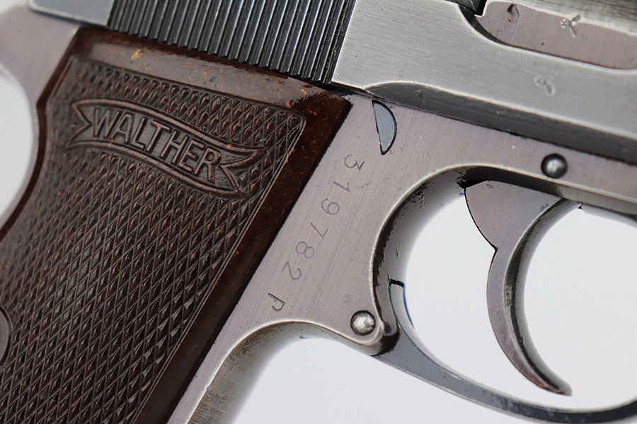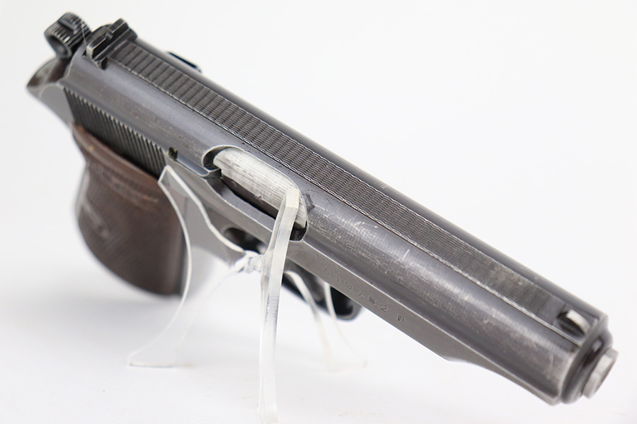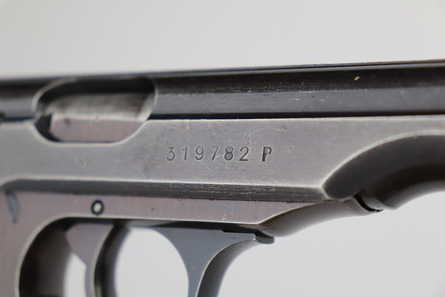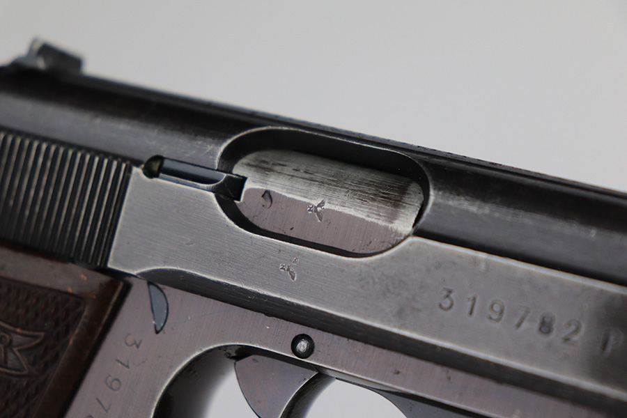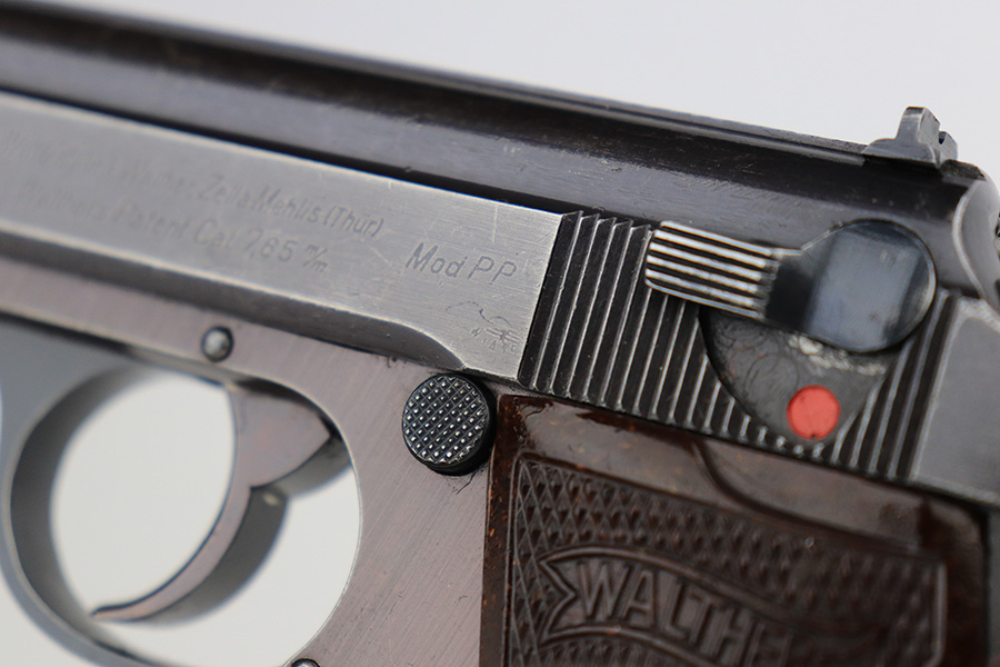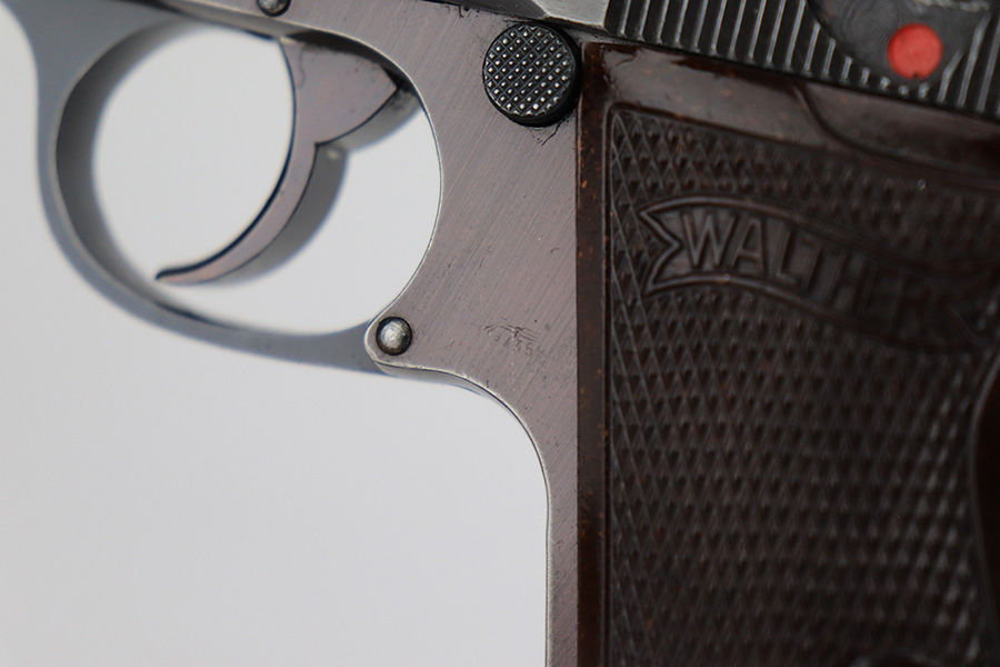 6/2/23 – This is a nice example of a Walther PP issued to the Nazi military in 1943. All matching with the proper “Waffen 359” military acceptance proofs on the slide and frame. Most of the bluing on this gun has a nice plum tint to it, which pairs nicely with its set of scarce red bakelite grips. The gun has retained roughly 75% of its finish. The majority of the wear is on the grip straps, but there is thinning along both sides of the slide, and general high edge wear. Tiny scratches and handling marks along both sides of the slide as well. Comes with a period-correct wartime magazine. Mint bore.