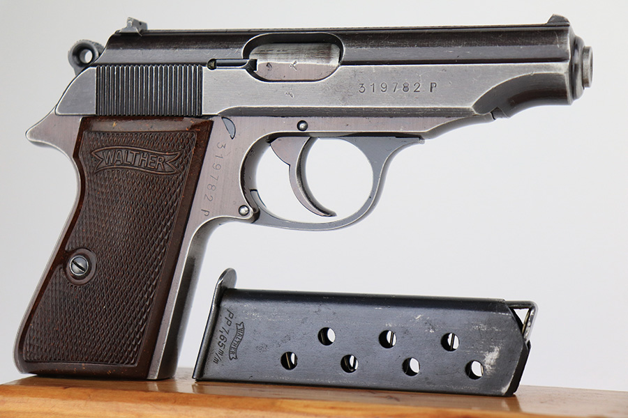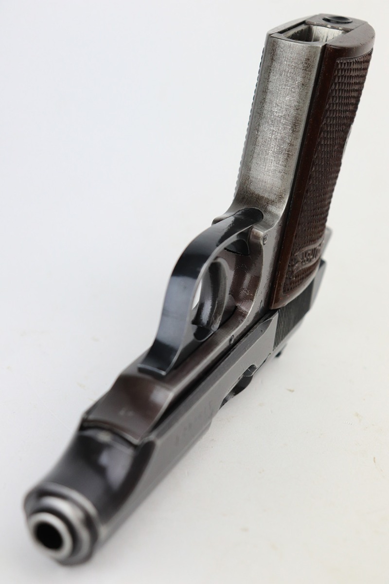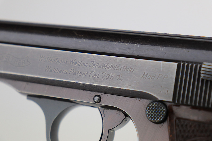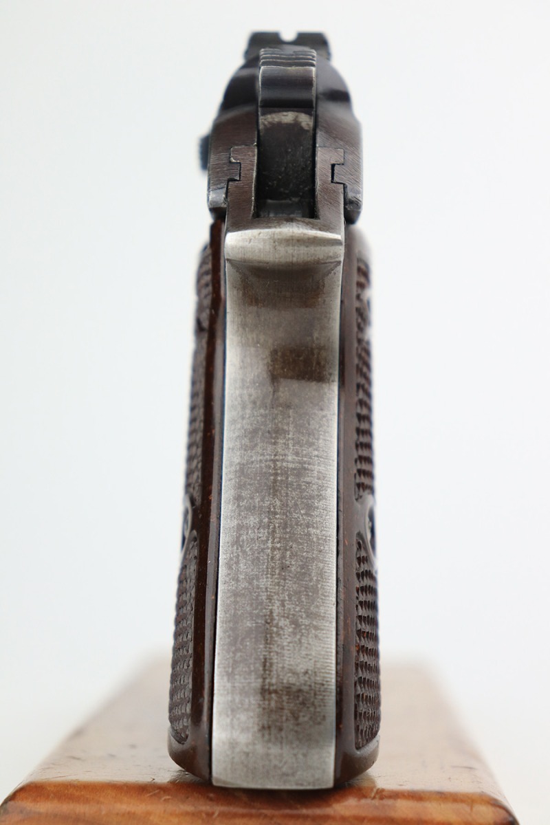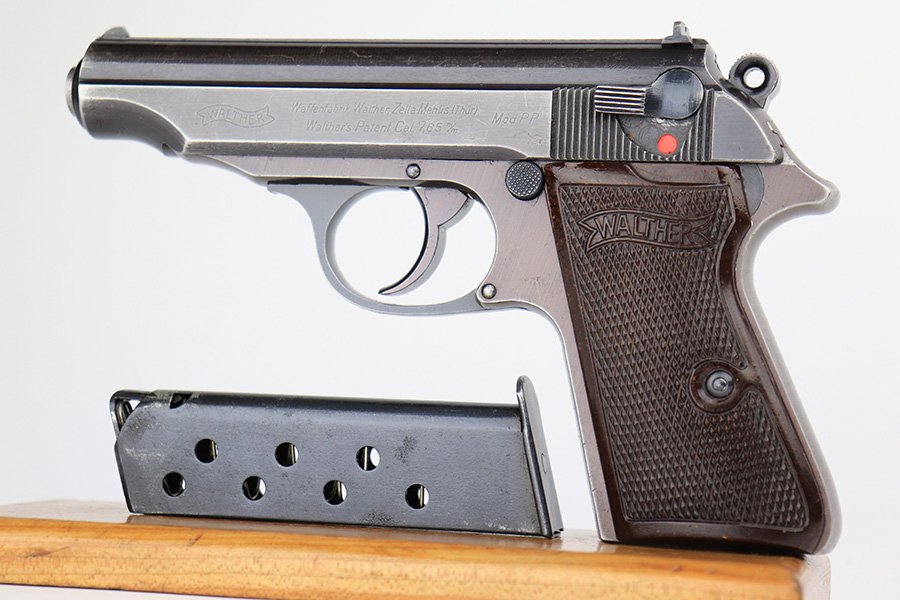 6/2/23 – This is a nice example of a Walther PP issued to the Nazi military in 1943. All matching with the proper “Waffen 359” military acceptance proofs on the slide and frame. Most of the bluing on this gun has a nice plum tint to it, which pairs nicely with its set of scarce red bakelite grips. The gun has retained roughly 75% of its finish. The majority of the wear is on the grip straps, but there is thinning along both sides of the slide, and general high edge wear. Tiny scratches and handling marks along both sides of the slide as well. Comes with a period-correct wartime magazine. Mint bore.