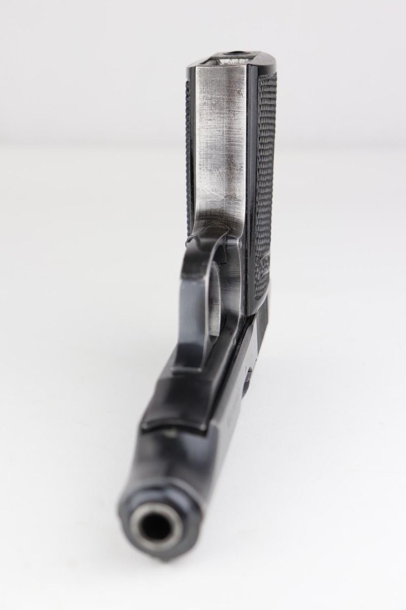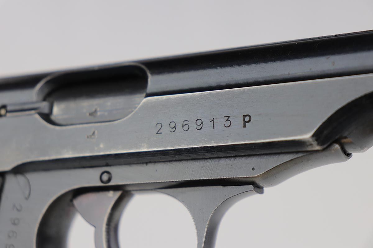7/14/21 – This is a nice example of a Walther PP issued to the Nazi military in 1943. It is all matching and has the proper “Waffen 359” military proofs. This one has a very unique factory error. The “p” in these PP serial numbers was applied after the numbers, that has been proven. This one has a “p” that was applied backwards. it has retained roughly 75% of its original wartime finish. Most of the finish loss is on the straps, where there is also spotty oxidation. There is spotty wear along both sides of the slide, concentrated mostly around the high edges and around the muzzle. Comes with excellent grips and a proper wartime magazine. Mint bore.