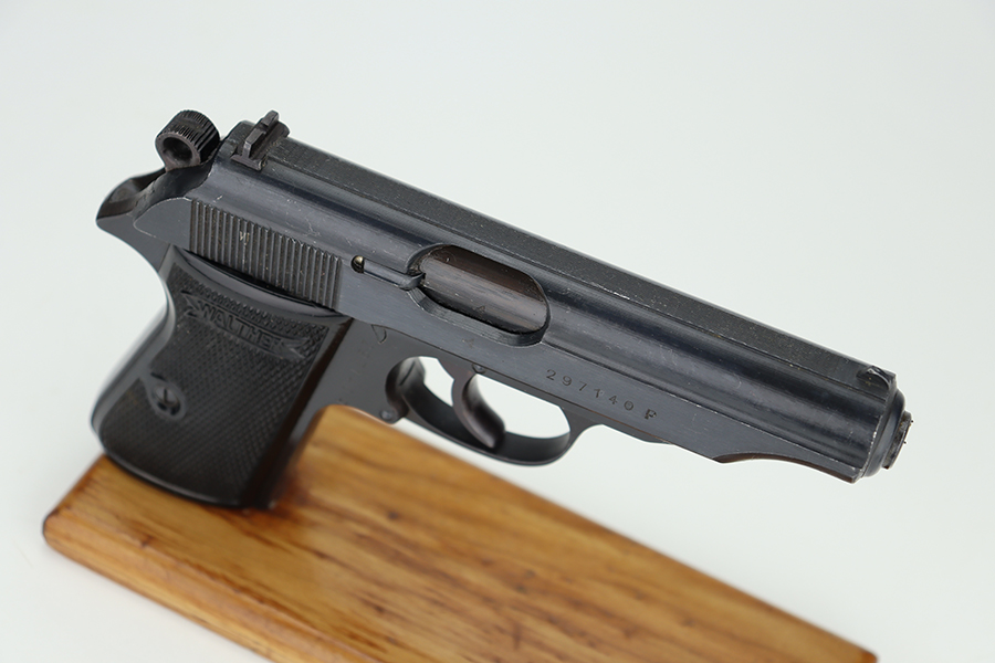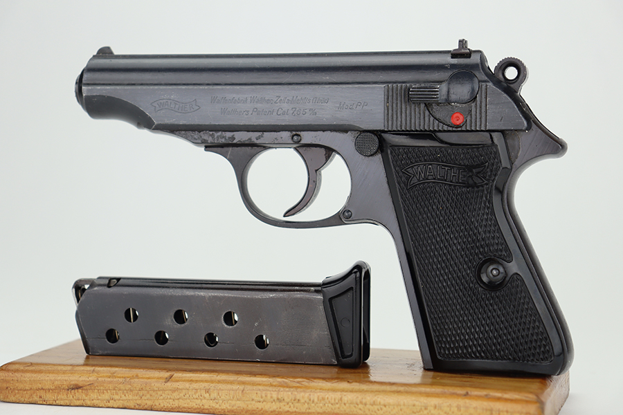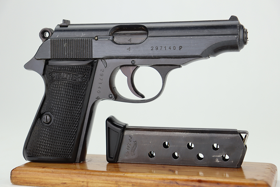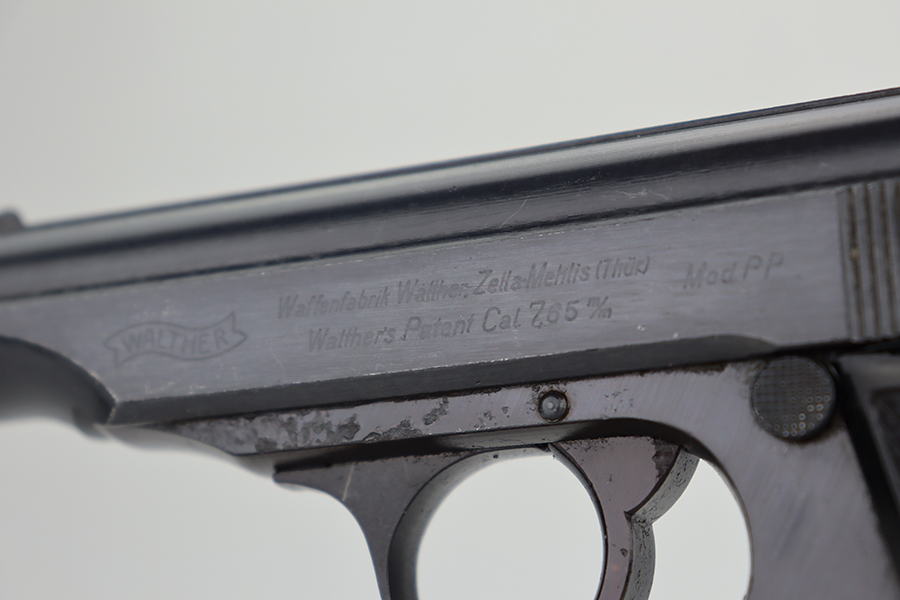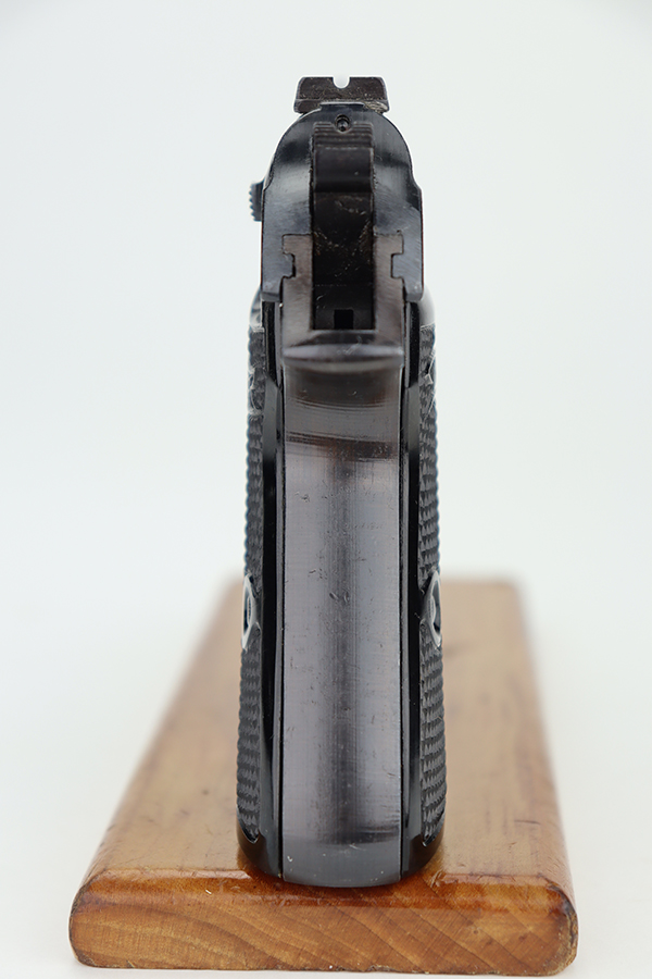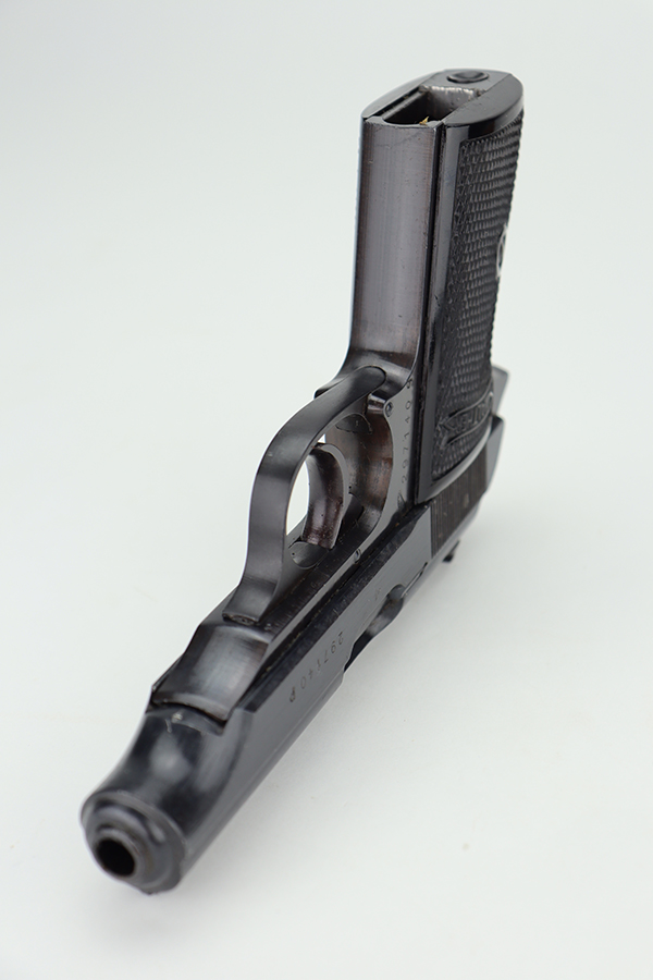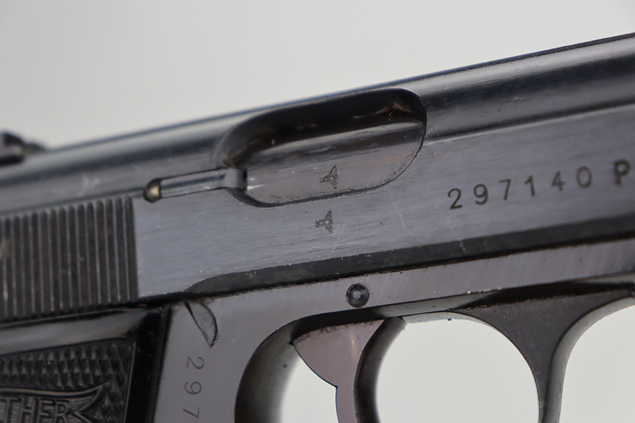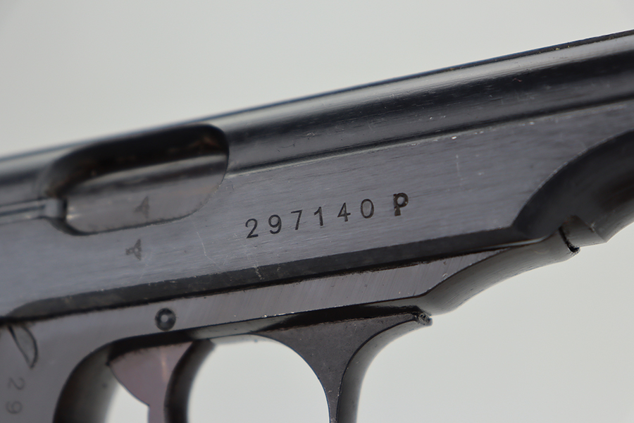 6/24/24 – This is a minty example of a Walther PP sold in the commercial market in 1943. All matching and “Eagle N” proofed. This one has a very unique factory error. The “p” in these PP serial numbers was applied after the numbers, that has been proven. This one has a “p” that was applied backwards. It has retained virtually all of its original wartime finish. However, there is what looks like pitting at the left front of the frame. We believe this is actually just a series of casting flaws, not actual pitting. Fitted with period-correct black bakelite grips. Comes with a wartime magazine that has a post-war finger extension. Mint bore.