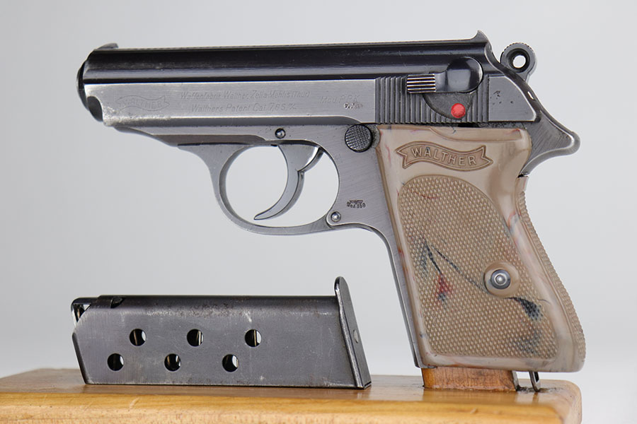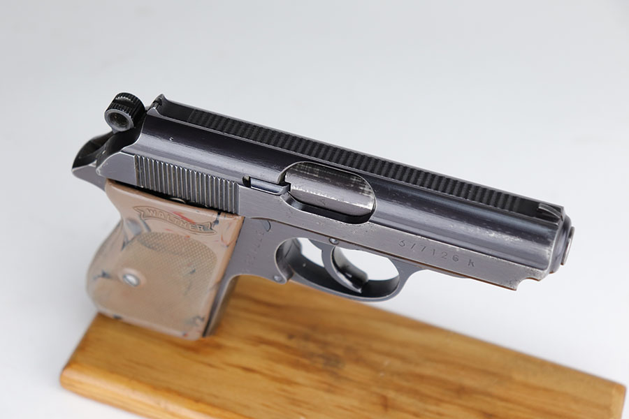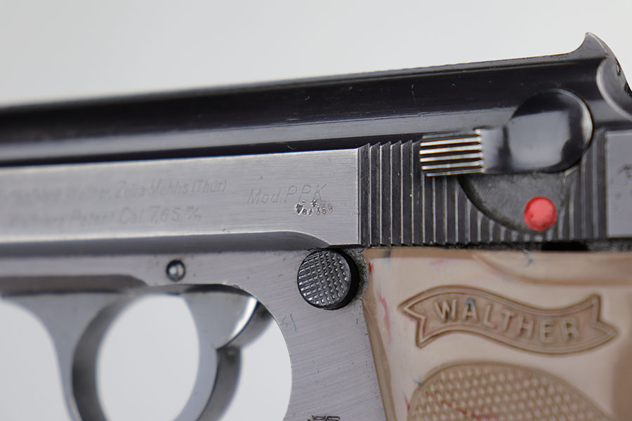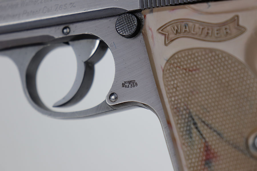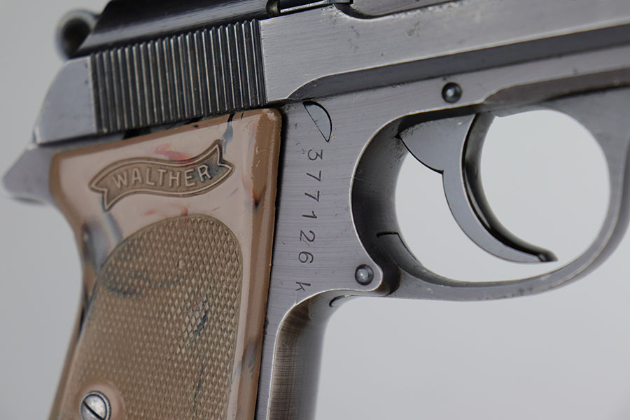 12/1/20 – This is a very nice example of a Walther PPK issued to the Nazi military in 1942-43. It is all matching and has the proper “Waffen 359” Nazi military acceptance proofs. It also has a beautiful and scarce grey Walther grip. This particular gun has retained somewhere between 85-90% of its original bluing. There is thinning on the front strap and wear around the muzzle and high edges of the slide. There are areas of minor pitting most noticeable near the muzzle. It comes with a proper wartime magazine. The bore is minty – shiny with strong rifling.