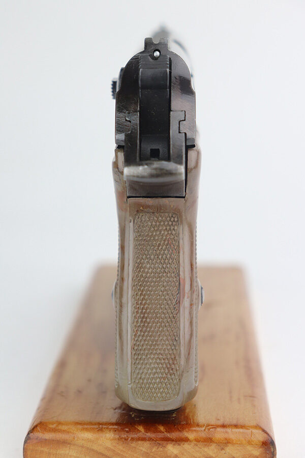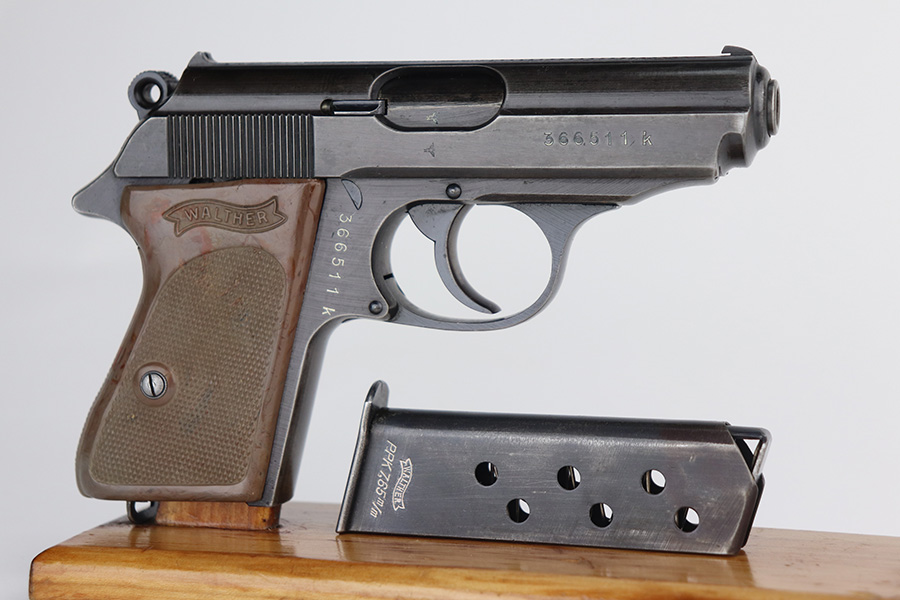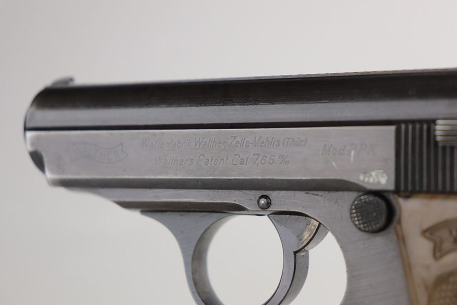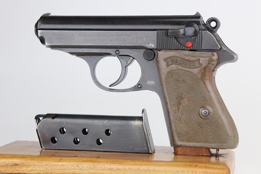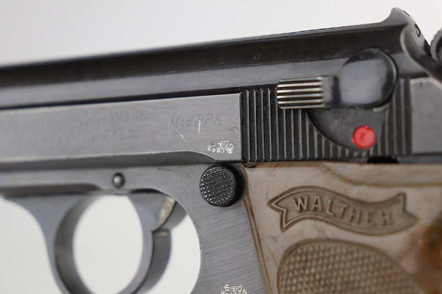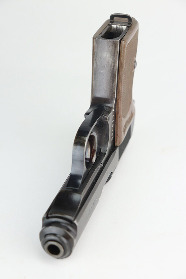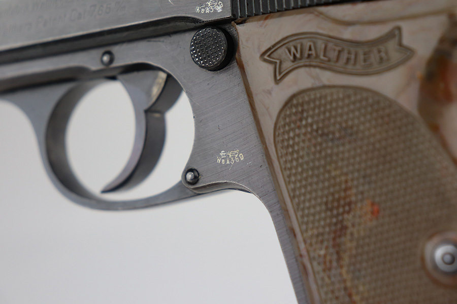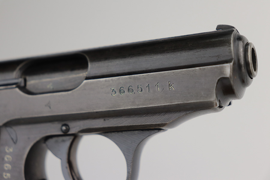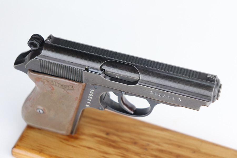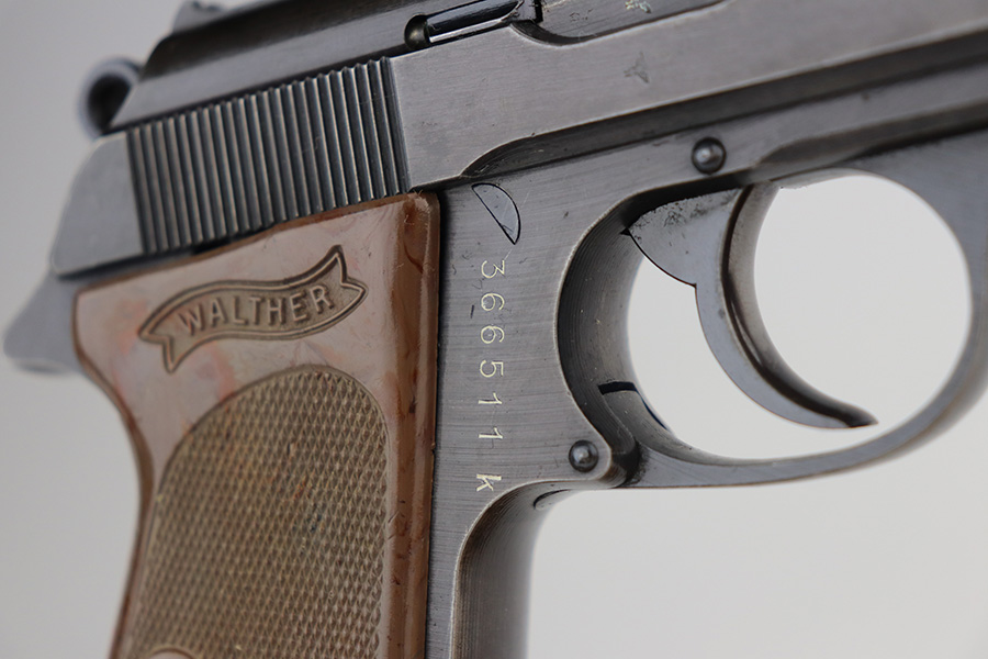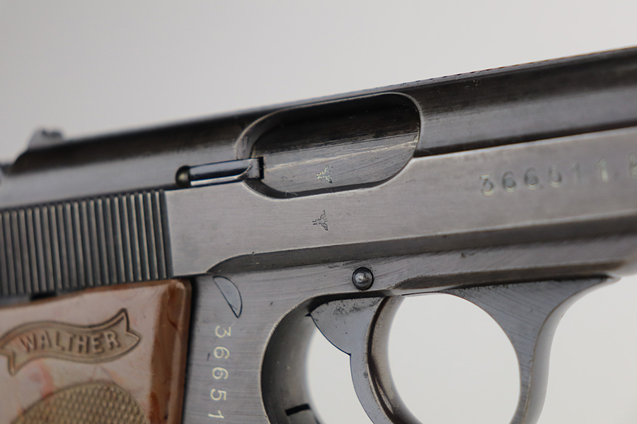 8/2/21 – This is a very nice example of a Walther PPK issued to the Nazi military in 1942. It is all matching and has the proper “Waffen 359” military proofs. These guns are difficult to rate because the wartime military finishes can appear naturally thin. In any case, we believe it has retained roughly 75-80% of its original finish. There is very minor wear along the high edges in general and around the muzzle. Thinning on the front strap and both sides of the slide. Spotty discoloration and oxidation in the same areas. Comes with a really nice brownish-grey grip – hairline crack on the right side. Also comes with a proper wartime magazine. Mint bore.