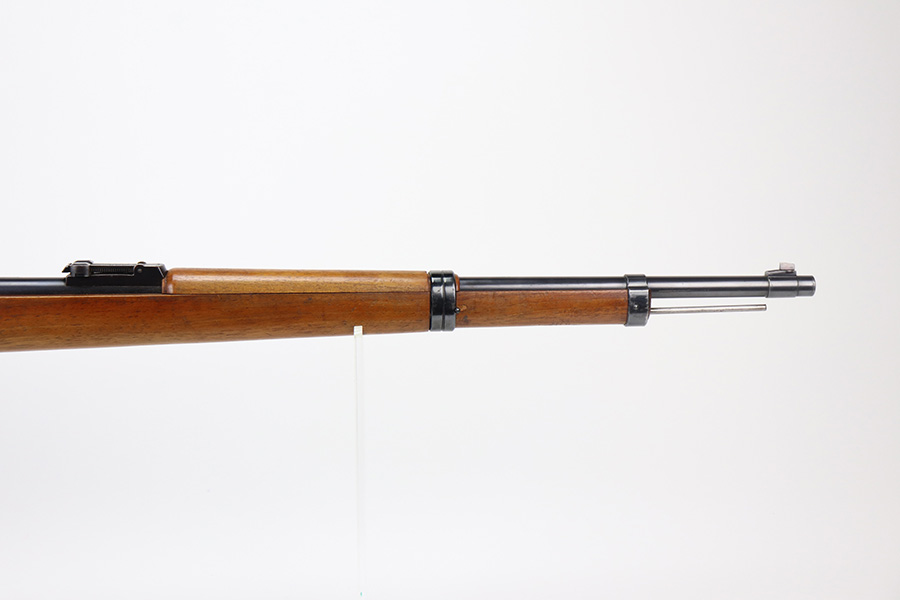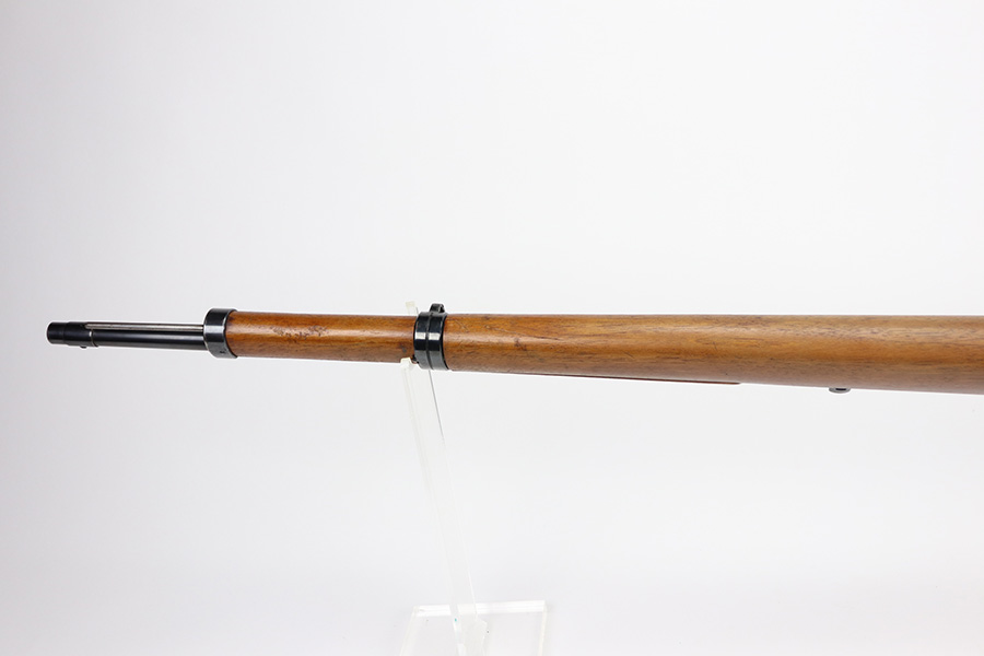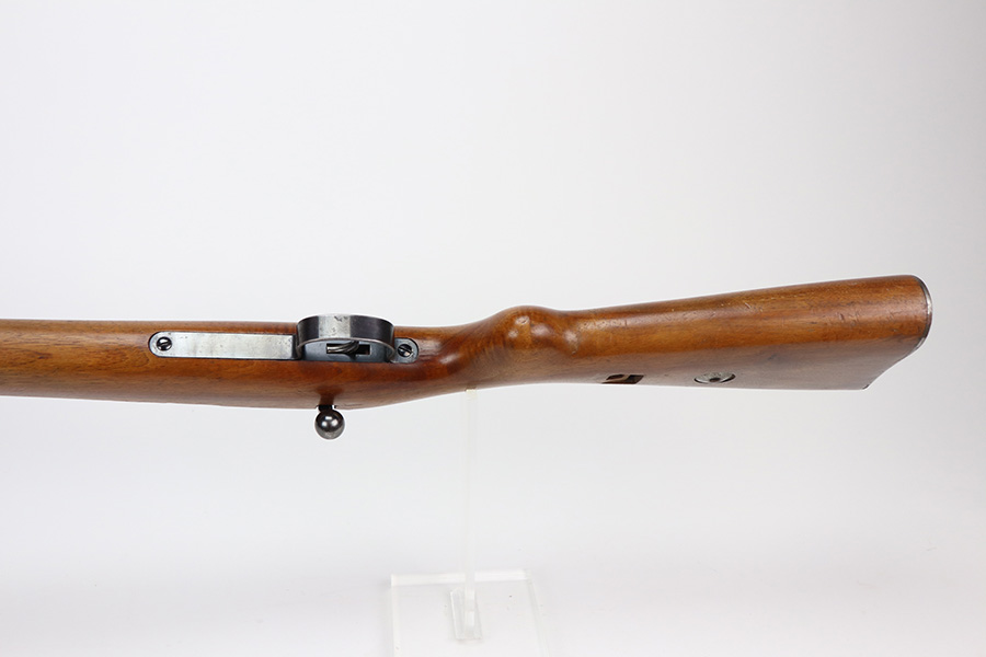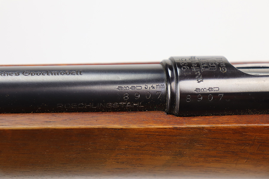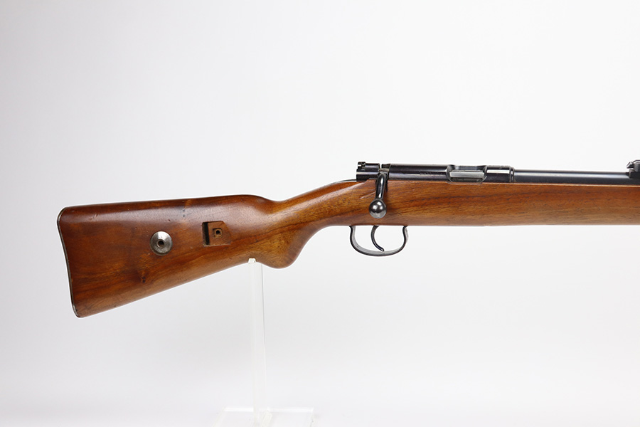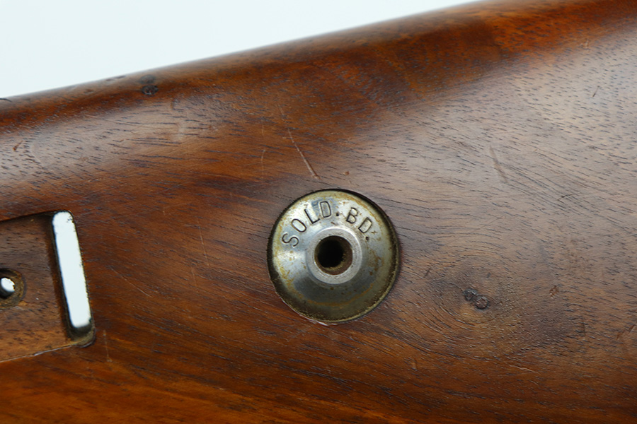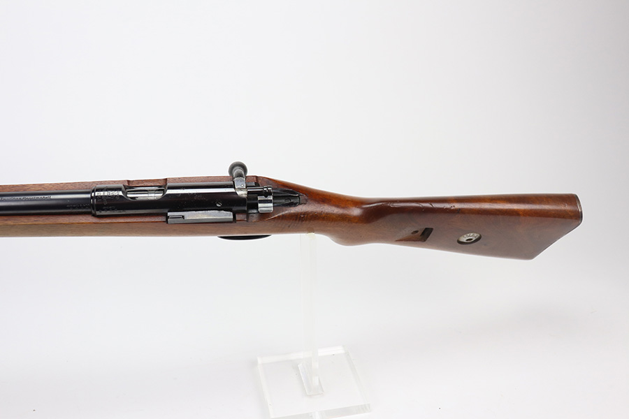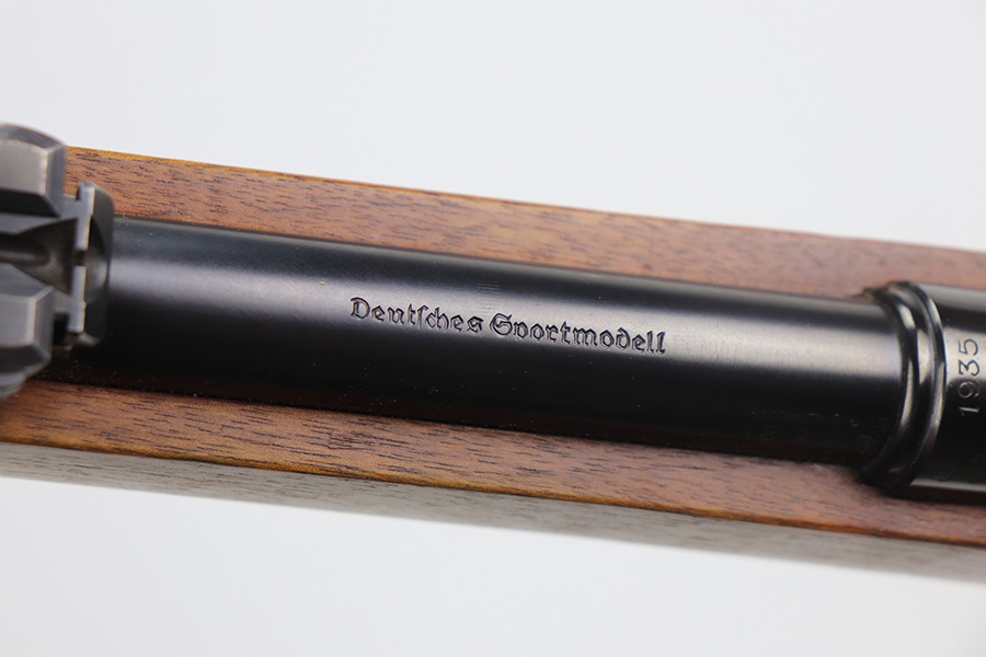 5/11/21 – This is a minty example of a DSM training rifle made by Waffenstadt in 1935. The gun is all matching and has the proper “Crown B U” proofs. There is a “SOLD BD” marking on the metal fitting on the butt stock. This stands for “Soldaten Bund” or German Veteran’s Association. The gun has retained almost all of its high-polish bluing with very minor freckling on the top of the receiver and minor wear on the bolt handle. The stock is minty with very minor bruising here and there. Mint bore.