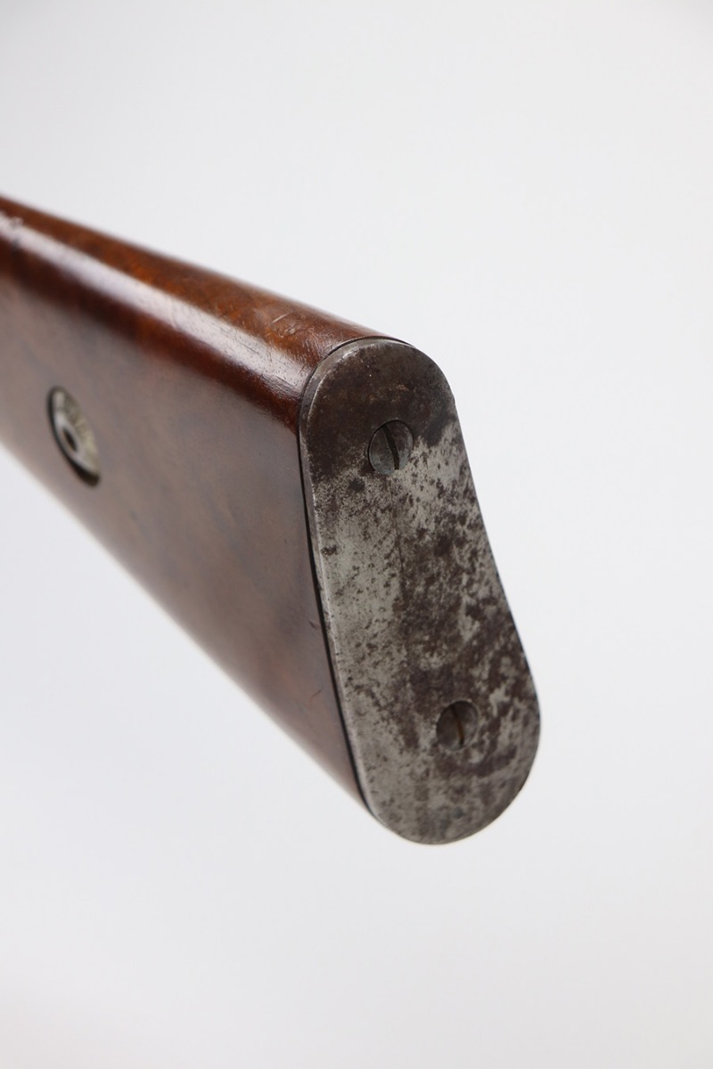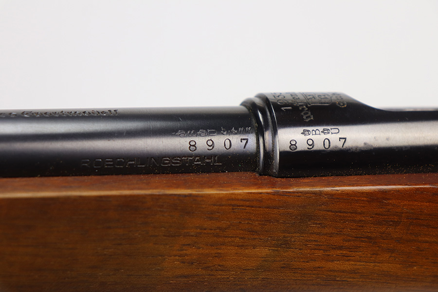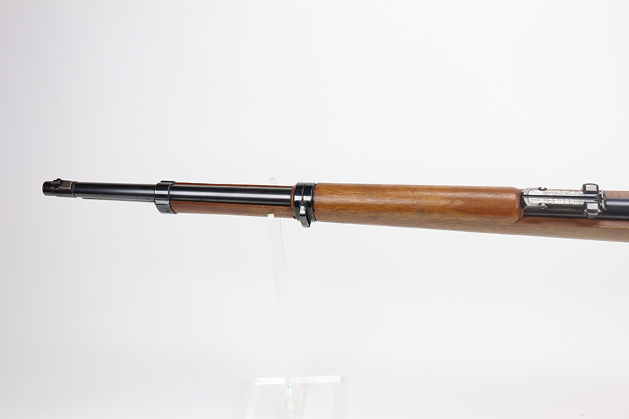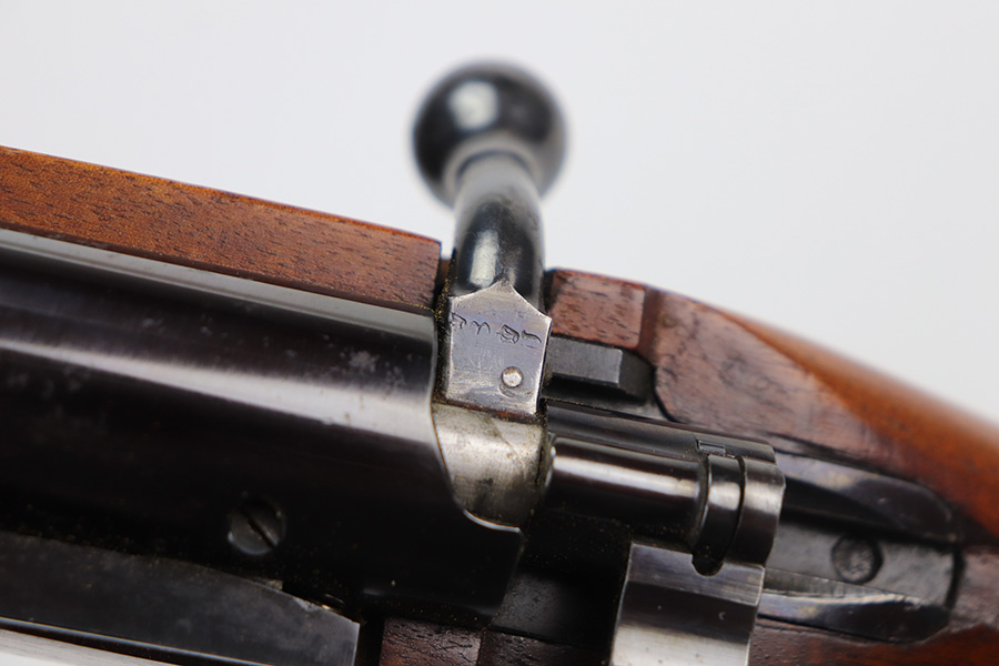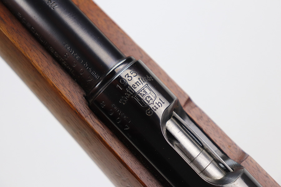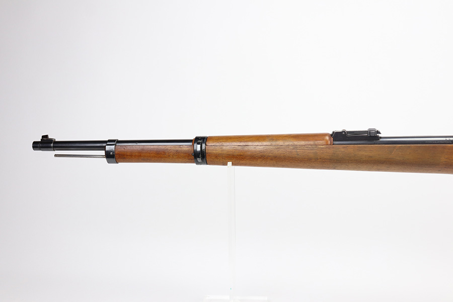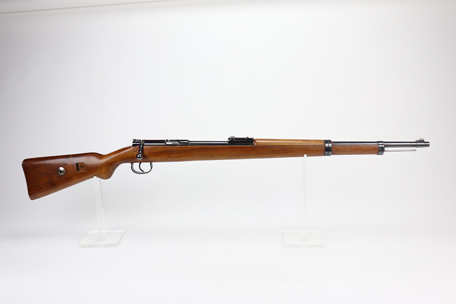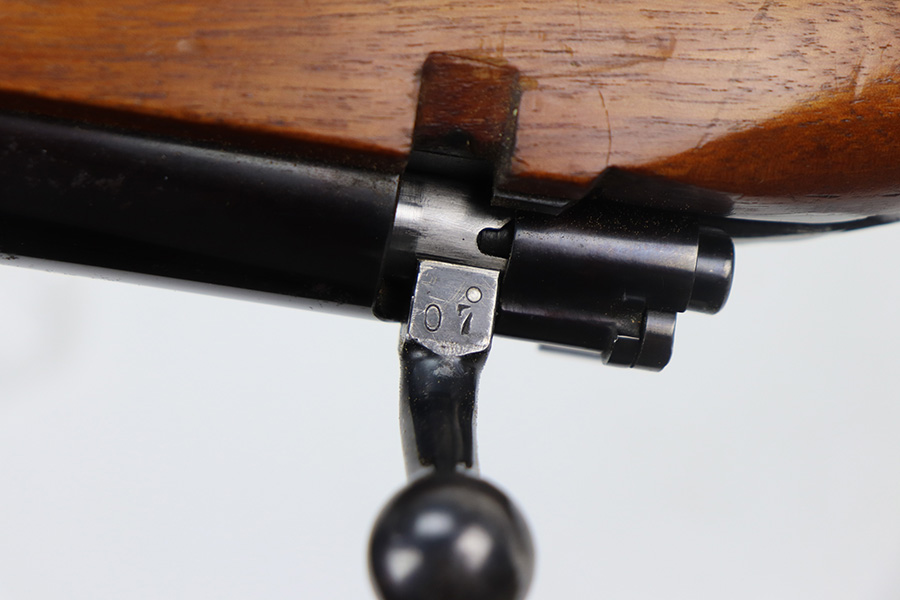 5/11/21 – This is a minty example of a DSM training rifle made by Waffenstadt in 1935. The gun is all matching and has the proper “Crown B U” proofs. There is a “SOLD BD” marking on the metal fitting on the butt stock. This stands for “Soldaten Bund” or German Veteran’s Association. The gun has retained almost all of its high-polish bluing with very minor freckling on the top of the receiver and minor wear on the bolt handle. The stock is minty with very minor bruising here and there. Mint bore.
