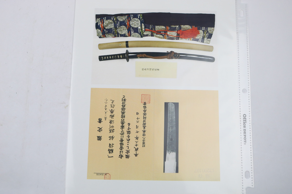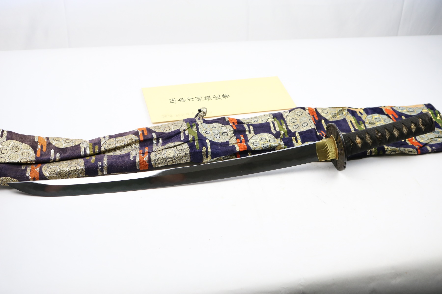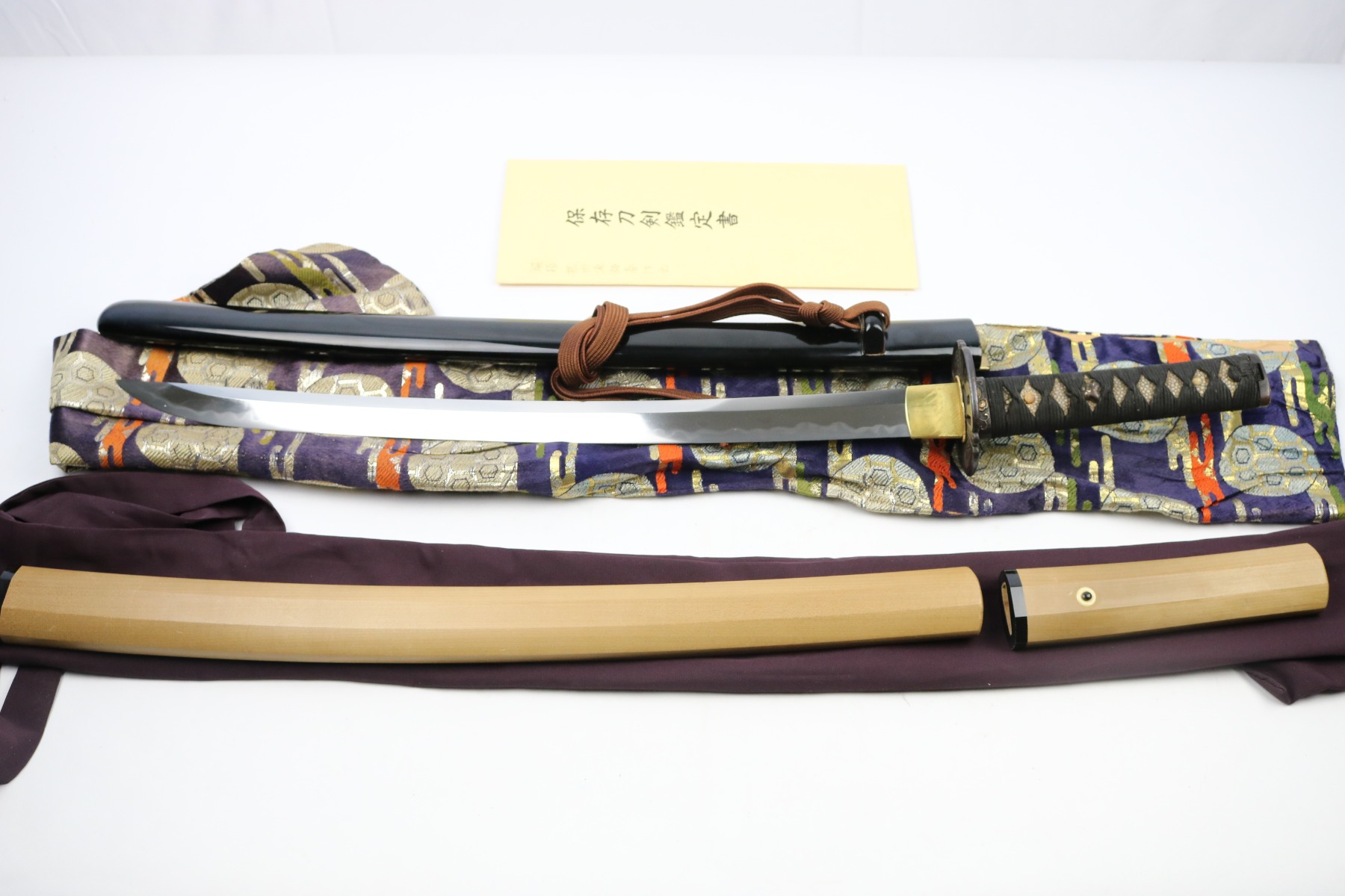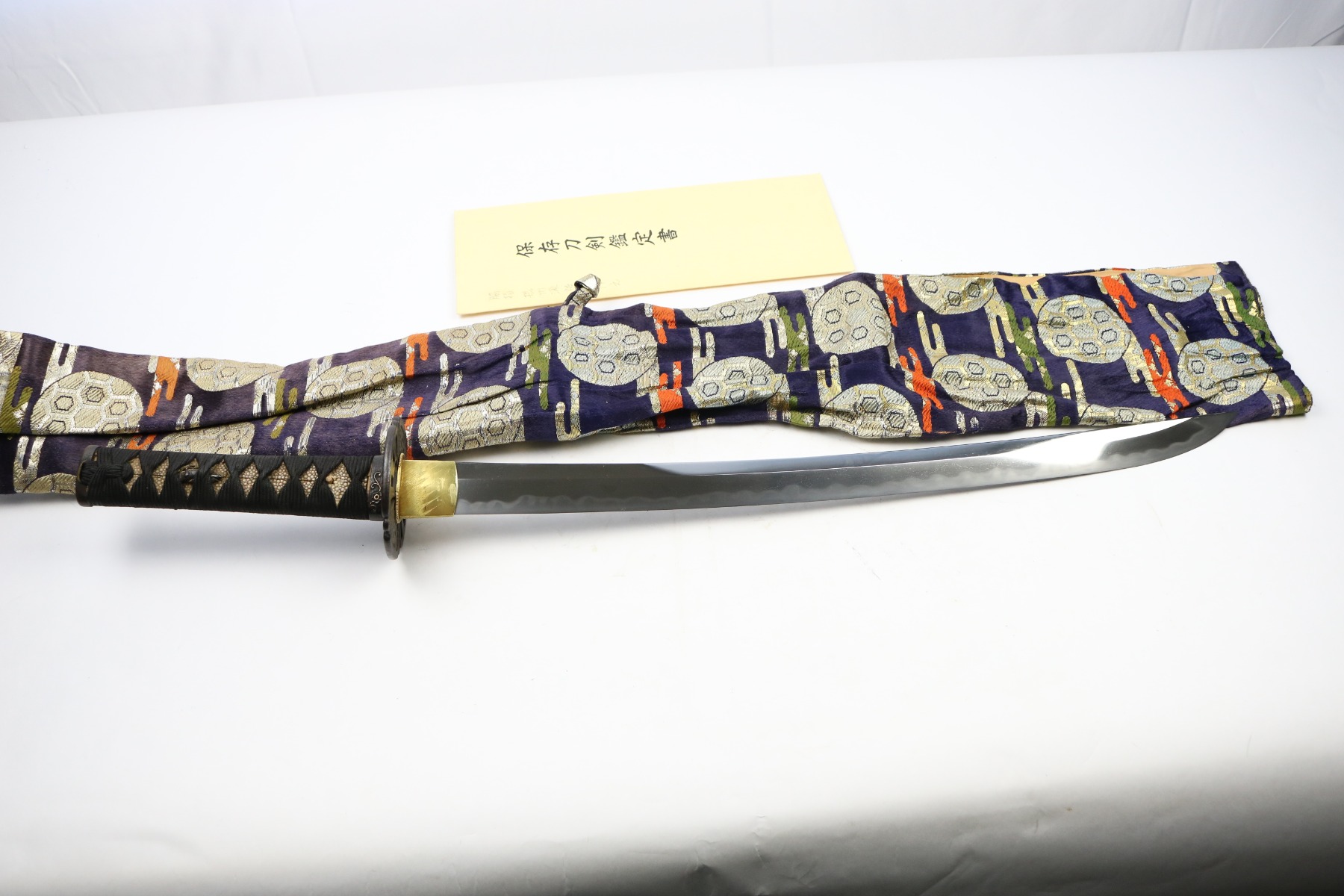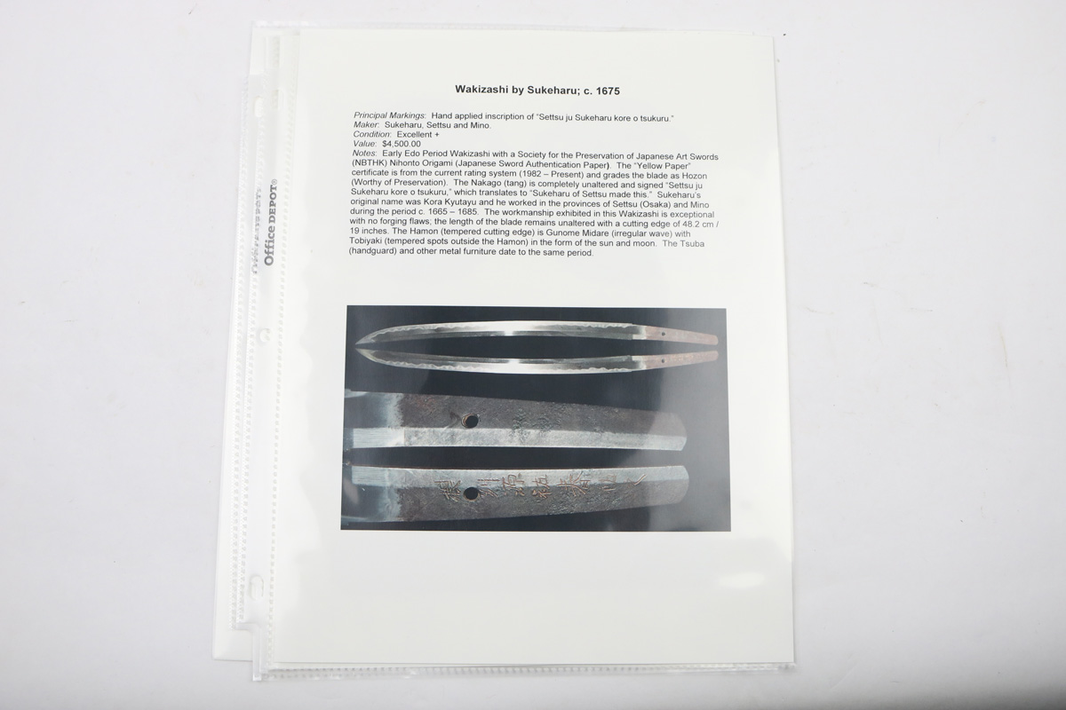 7/17/18 – This is an original hand made Wakizashi blade by Sukeharu. Estimated date of production is 1675. There is a hand-applied inscription of “Settsu ju Sukeharu kore o tsukuru.” on the blade under the handle (tang). The blade comes with the original holding wrap/cloth along with the storage scabbard and storage blade. The workmanship is exceptional with no forging flaws; the length of the cutting edge is 48.2 cm / 19 inches. The tempered cutting edge is the irregular wave pattern iwth tempered spots outside of the cutting edge in the form of the sun and moon. The handguard and other metal furniture date the same period. The fittings are most likely from a later time period. Comes with a “Society for Preservation of Japanese Art Swords” yellow authentication paper. The “yellow paper” certificate is from the current rating system put in place in 1982, and grades the blade as Hozon (meaning worthy of preservation). Guaranteed all original and authentic. We will ship in a protective soft case (worth keeping for preservation). Also included are additional documents and write-up from the 1990s when this was bought by a previous collector from an expert in Canada.