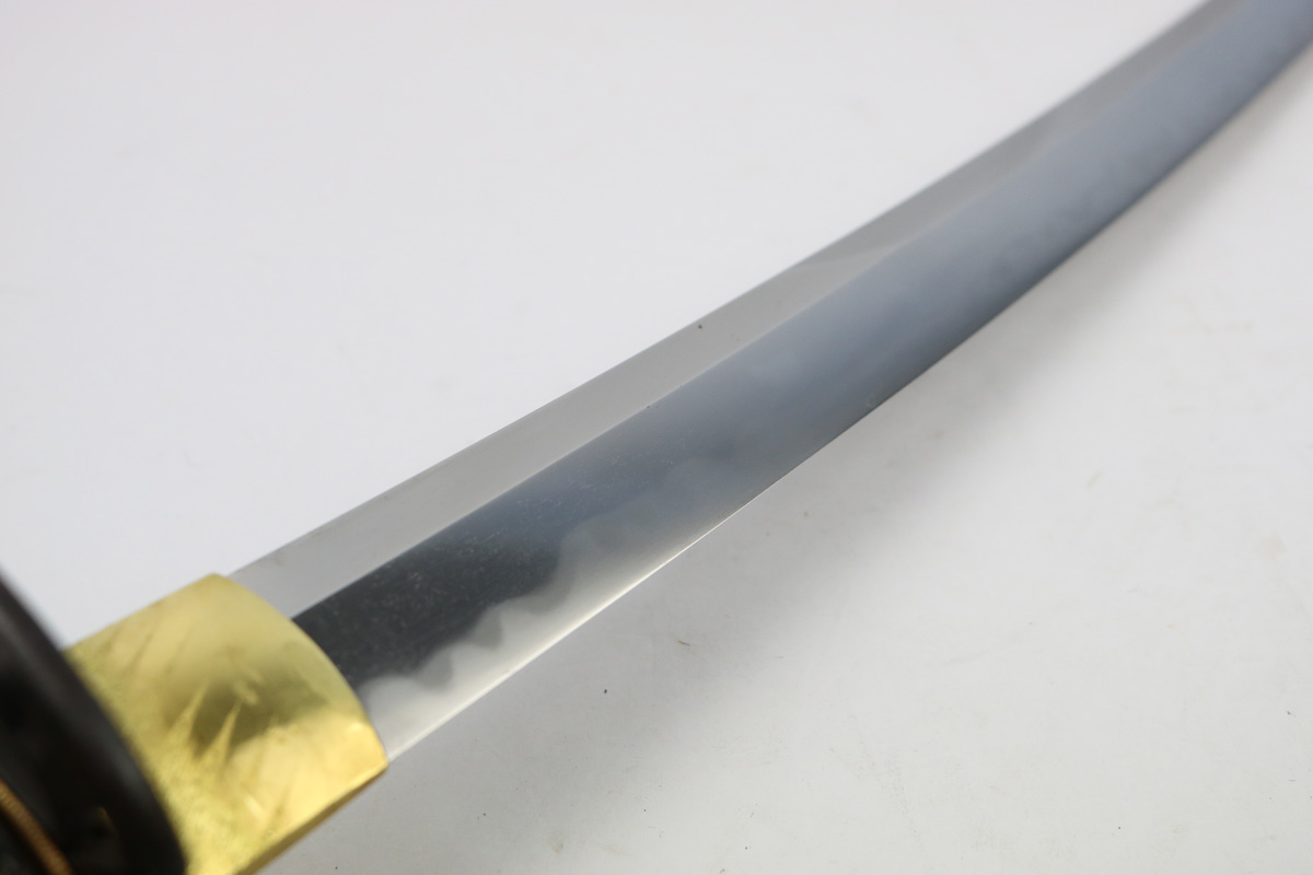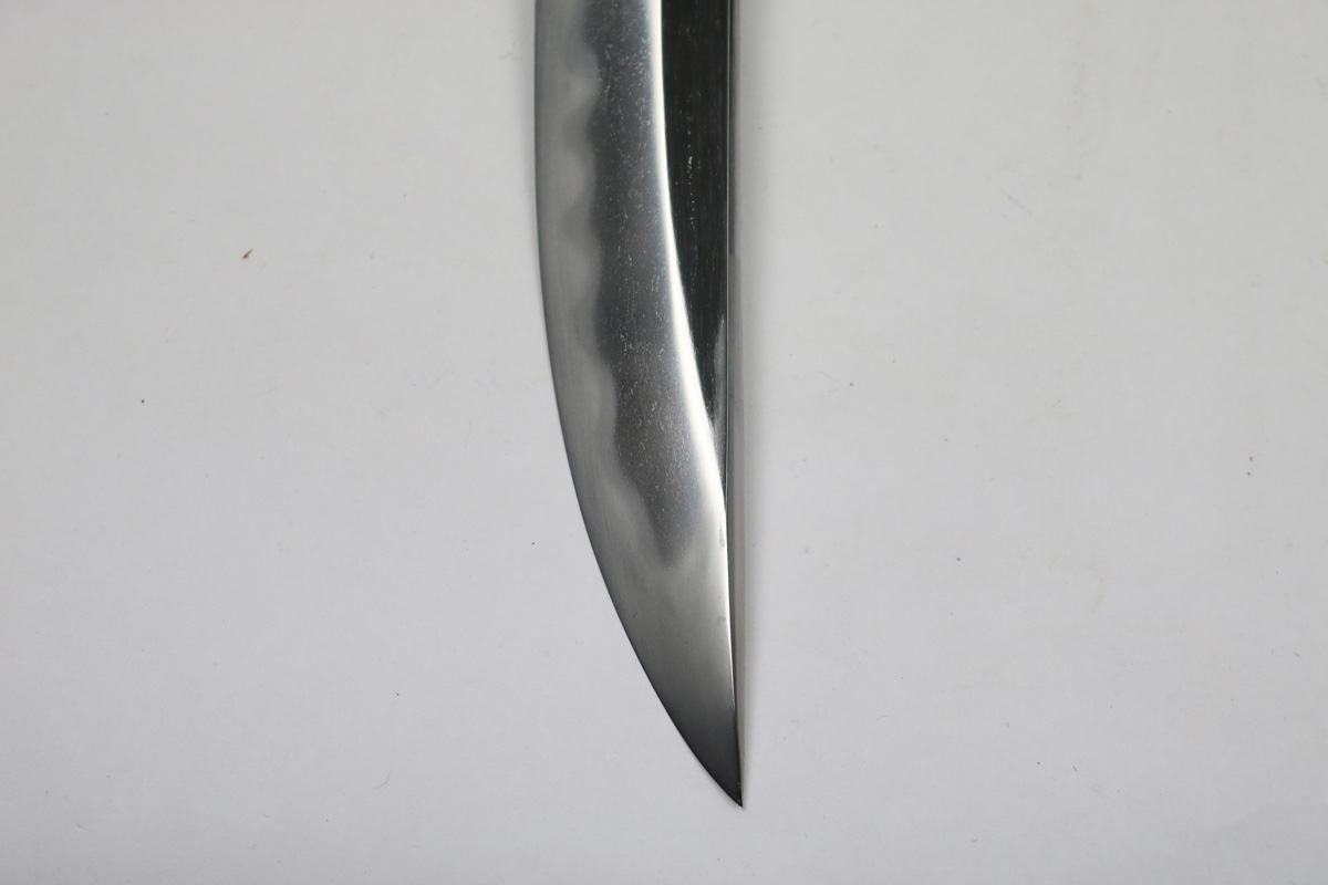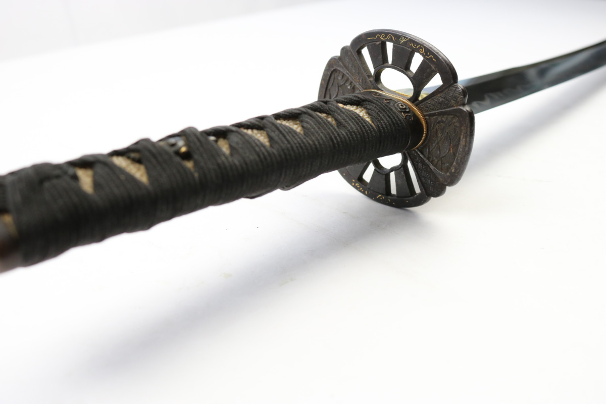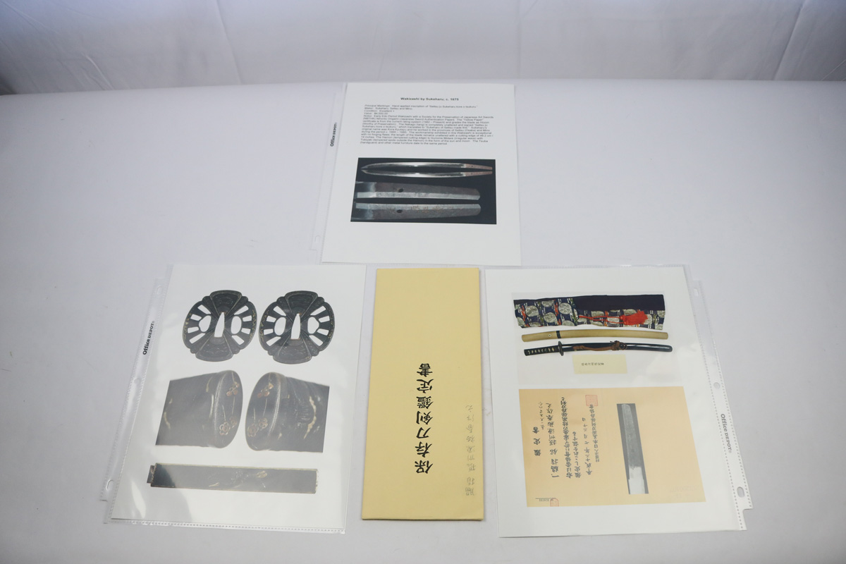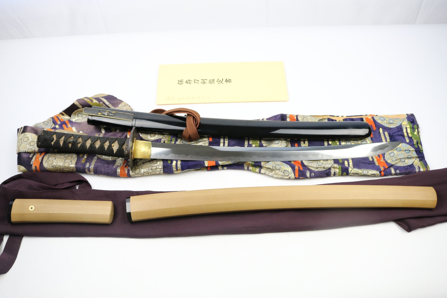7/17/18 – This is an original hand made Wakizashi blade by Sukeharu. Estimated date of production is 1675. There is a hand-applied inscription of “Settsu ju Sukeharu kore o tsukuru.” on the blade under the handle (tang). The blade comes with the original holding wrap/cloth along with the storage scabbard and storage blade. The workmanship is exceptional with no forging flaws; the length of the cutting edge is 48.2 cm / 19 inches. The tempered cutting edge is the irregular wave pattern iwth tempered spots outside of the cutting edge in the form of the sun and moon. The handguard and other metal furniture date the same period. The fittings are most likely from a later time period. Comes with a “Society for Preservation of Japanese Art Swords” yellow authentication paper. The “yellow paper” certificate is from the current rating system put in place in 1982, and grades the blade as Hozon (meaning worthy of preservation). Guaranteed all original and authentic. We will ship in a protective soft case (worth keeping for preservation). Also included are additional documents and write-up from the 1990s when this was bought by a previous collector from an expert in Canada.