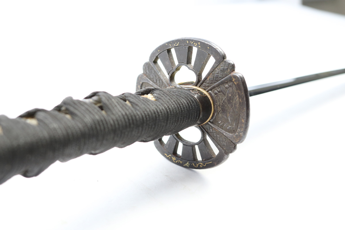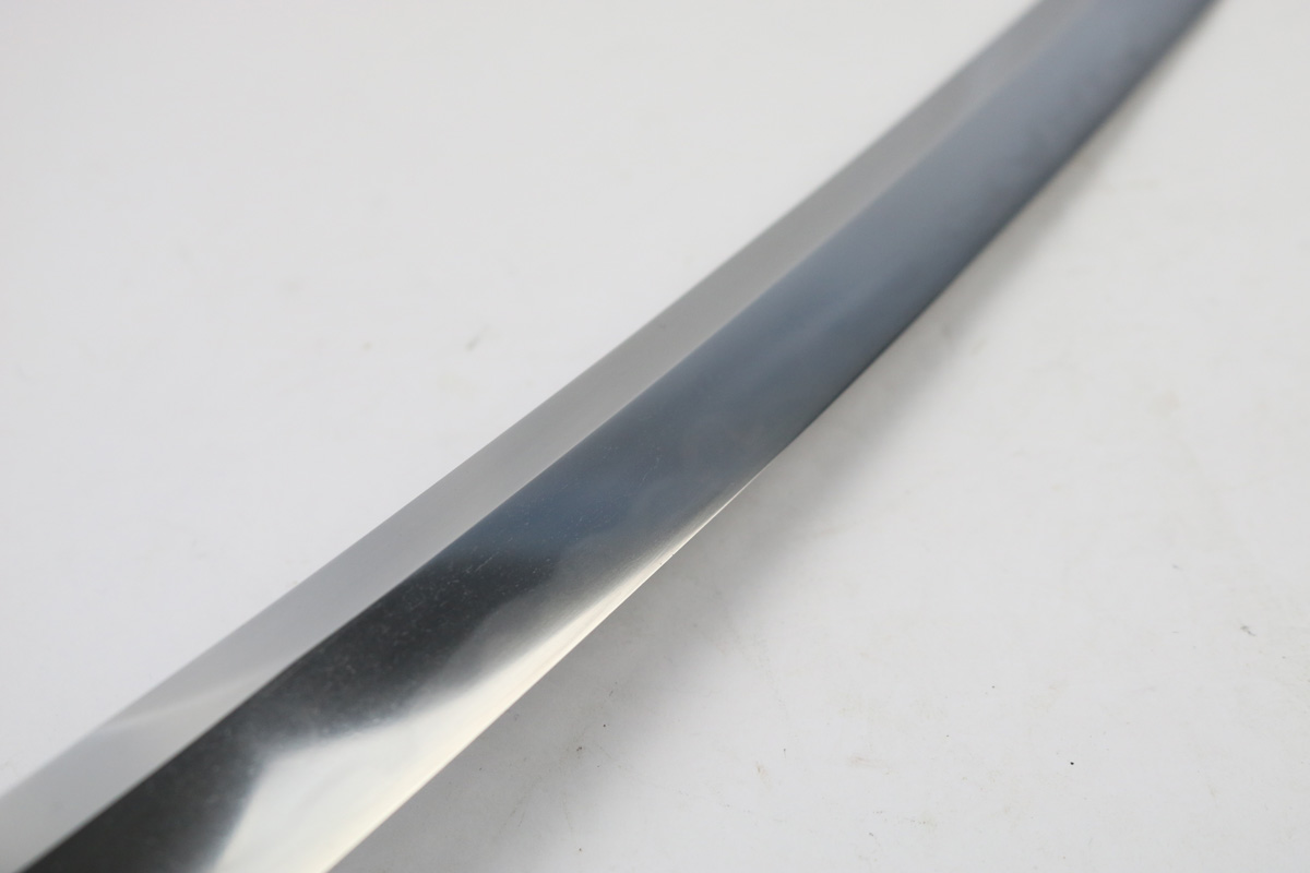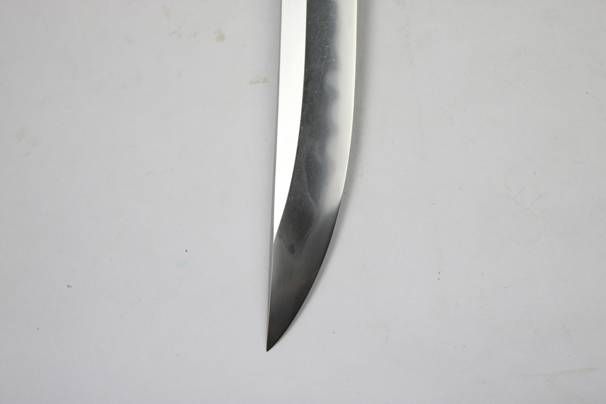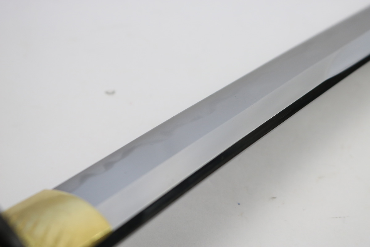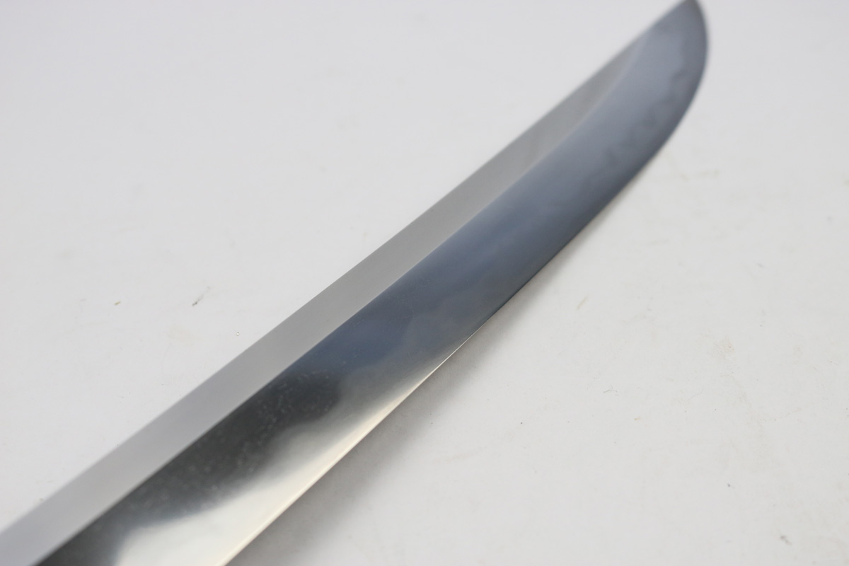 7/17/18 – This is an original hand made Wakizashi blade by Sukeharu. Estimated date of production is 1675. There is a hand-applied inscription of “Settsu ju Sukeharu kore o tsukuru.” on the blade under the handle (tang). The blade comes with the original holding wrap/cloth along with the storage scabbard and storage blade. The workmanship is exceptional with no forging flaws; the length of the cutting edge is 48.2 cm / 19 inches. The tempered cutting edge is the irregular wave pattern iwth tempered spots outside of the cutting edge in the form of the sun and moon. The handguard and other metal furniture date the same period. The fittings are most likely from a later time period. Comes with a “Society for Preservation of Japanese Art Swords” yellow authentication paper. The “yellow paper” certificate is from the current rating system put in place in 1982, and grades the blade as Hozon (meaning worthy of preservation). Guaranteed all original and authentic. We will ship in a protective soft case (worth keeping for preservation). Also included are additional documents and write-up from the 1990s when this was bought by a previous collector from an expert in Canada.