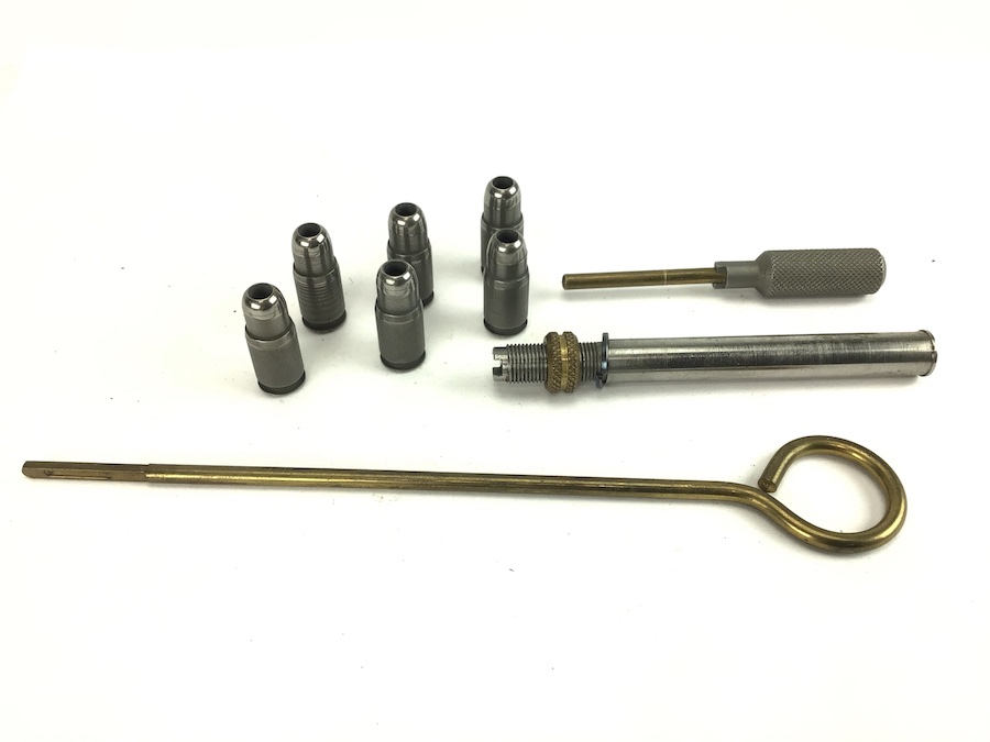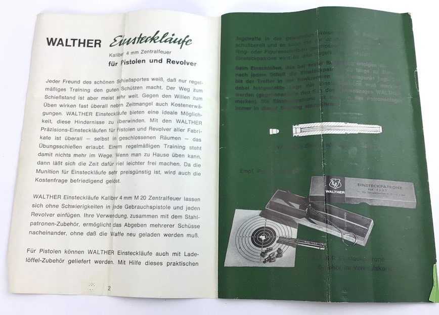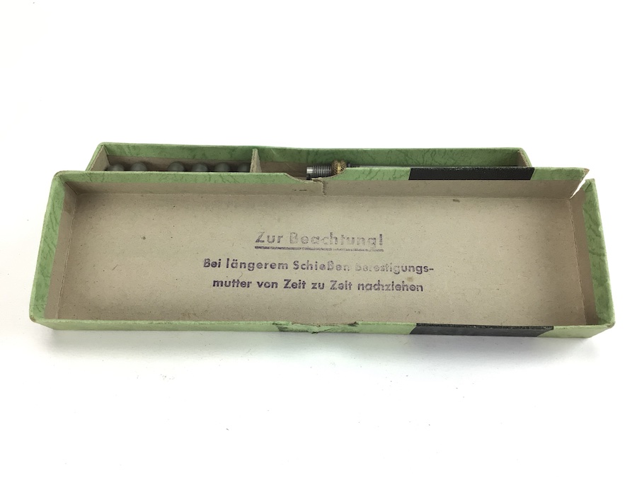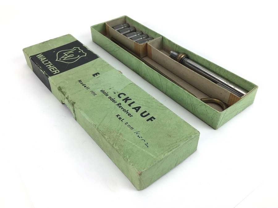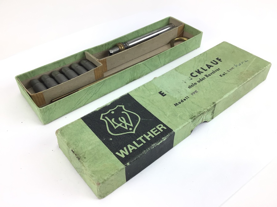 10/26/21 – This is an original Walther conversion kit for a 9mm Walther PPK. The kit is complete and converts the pistol to a 4mm practice rounds. Includes approximately, one hundred, 4mm rounds and original instruction manual. All parts are original and excellent, as shown. Minor pitting in the barrel, but the rifling is strong. The box is in great condition as well with minor tearing and use wear. A great addition for a Walther collection.