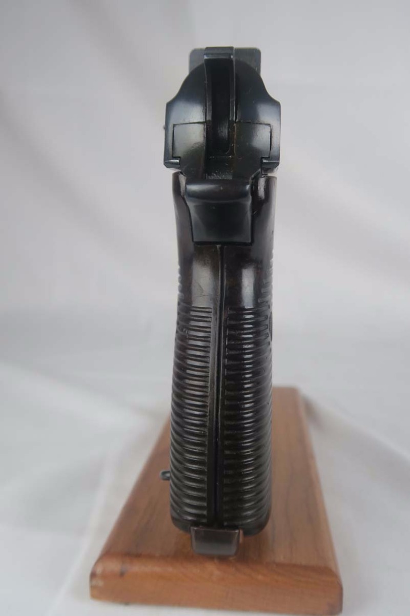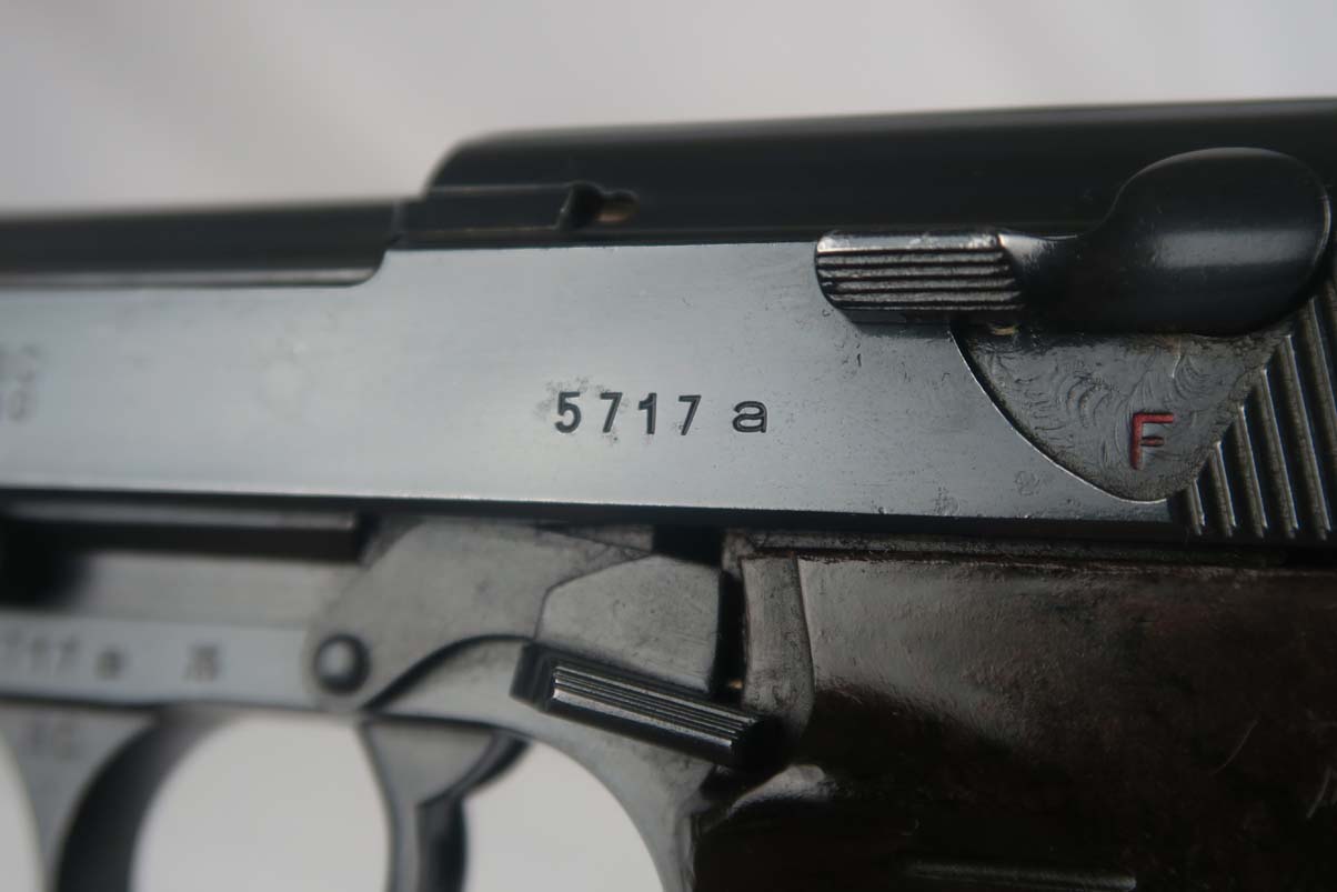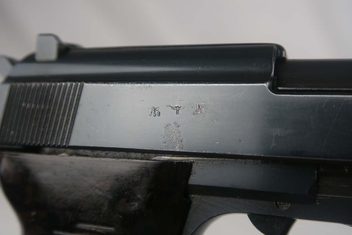 3/27/17 – These early AC40’s have been getting hard to find lately. We have customers looking for them but in the past year I have only found a few available. This gun has the early high polish finish covering about 98-99% of the gun, however may be an old re-blue. It looked all original to me in “gun show lighting” as the springs and other internals are in the white. There are appropriate signs of use and aging in the finish. However when I got it home under bright lights and magnification I could see bluing over top of a few pinpricks in the metal. I will price it as a “restored” finish. It appears to be all matching and original parts with the following exceptions. The magazine is a later Eagle /359 marked magazine and not numbered. The grips are early Walther but also not numbered. Right side is waffen proofed. The hammer is not waffen proofed, nor is the top of the slide cover or the slide release lever. All numbered parts and waffen proofs look to be original and correct. This is not a gun that was re-numbered or re-stamped. Minor frosting in the bore which I would rate a 7 out of 10.