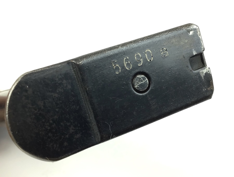 8/10/21 – Original, Walther AC 42 P.38 1st Variation Magazine. Excellent condition. Magazines from this variation can be found with ac42 pistols up to the c-block. Serial# “5690 a” is stamped along the edge of the floor plate. P.38 is stamped on the left side of the housing and two Eagle 359 acceptance marks on the spine. The small internal parts are also stamped with the Walther inspection stamp Eagle 359.