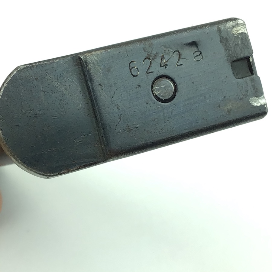 9/20/21 – Original, Walther AC 42 P.38 1st Variation Magazine. Excellent condition. Magazines from this variation can be found with ac42 pistols up to the c-block. Serial# “6242 a” is stamped along the edge of the floor plate. P.38 is stamped on the left side of the housing and Eagle 359 acceptance mark on the spine. The small internal parts are also stamped with the Walther inspection stamp Eagle 359.