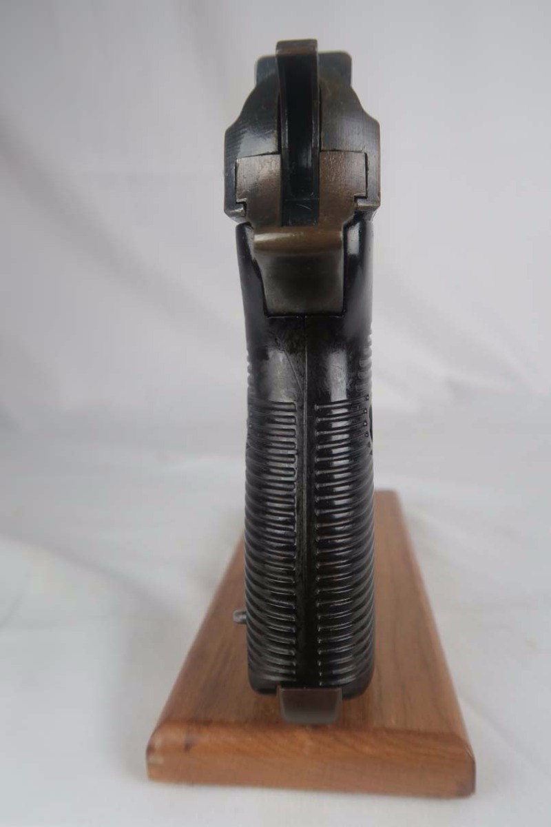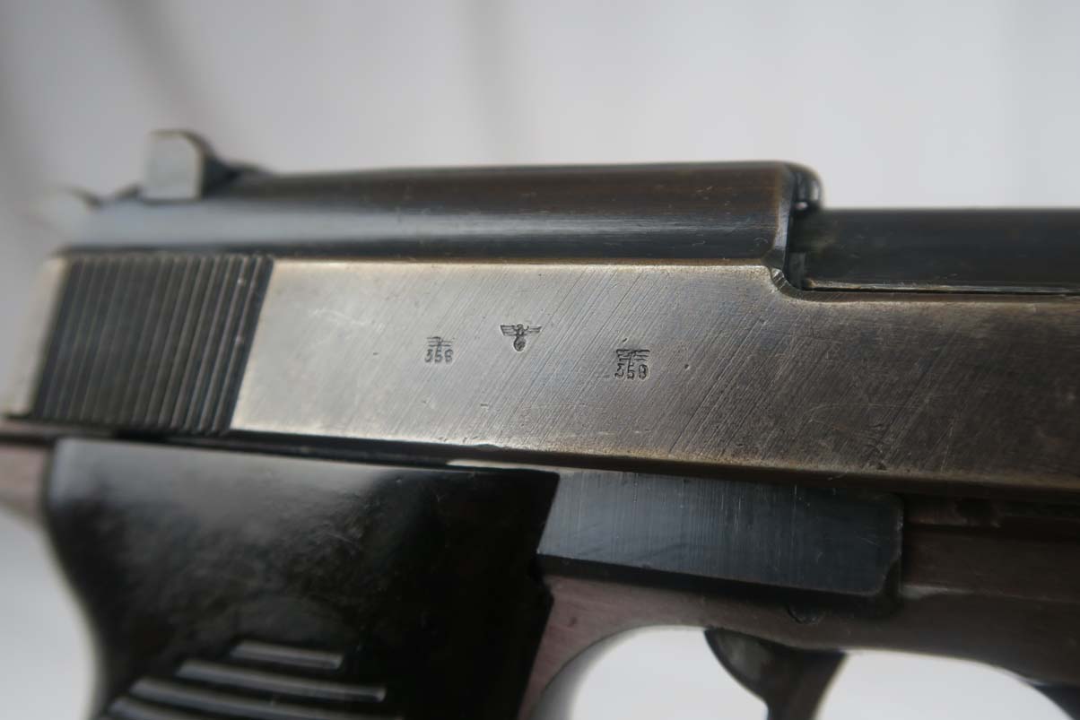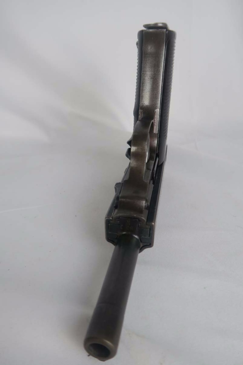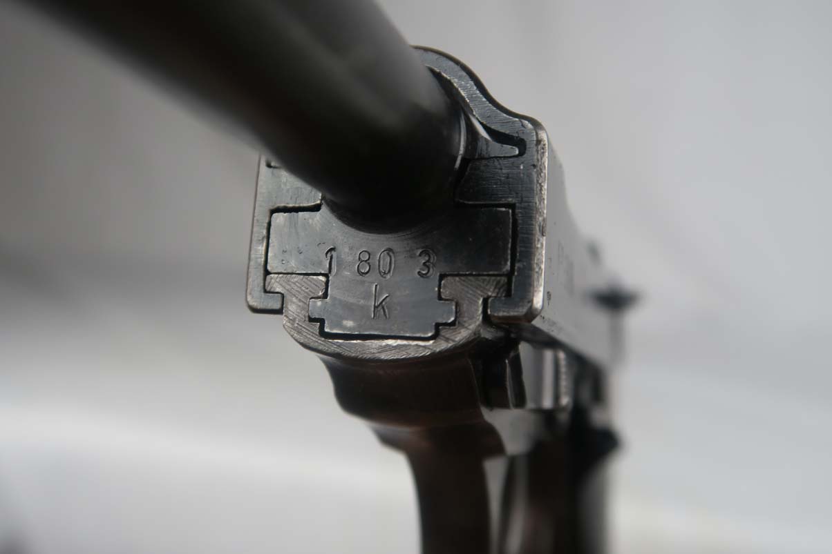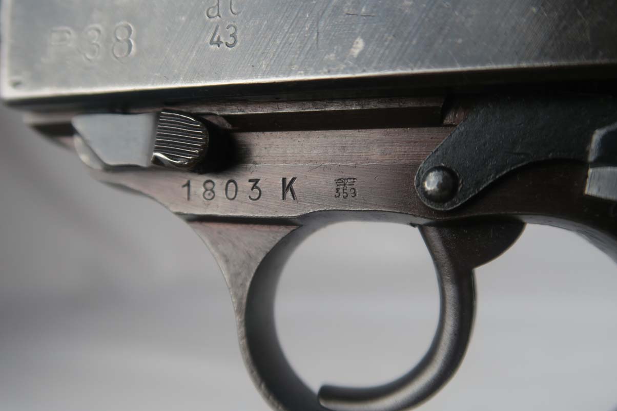 4/12/17 – This is a Walther produced ac 43 P.38, with rare test eagle on the left side of the slide.  It can be seen to the left of the P.38 proof, and is similar to the test eagle’s that were marked on the tang of the high polish Mauser HSc’s for a short time.  The original finish is about 90%, with the finish showing some uniform thinning on both sides of the slide and the front strap.  Grips are in excellent shape.  E/359 proofed magazine.  Bore has decent grooves but is frosted throughout.