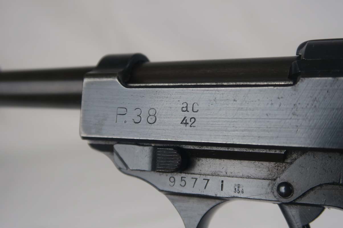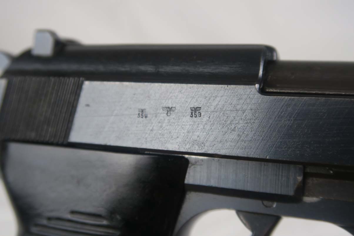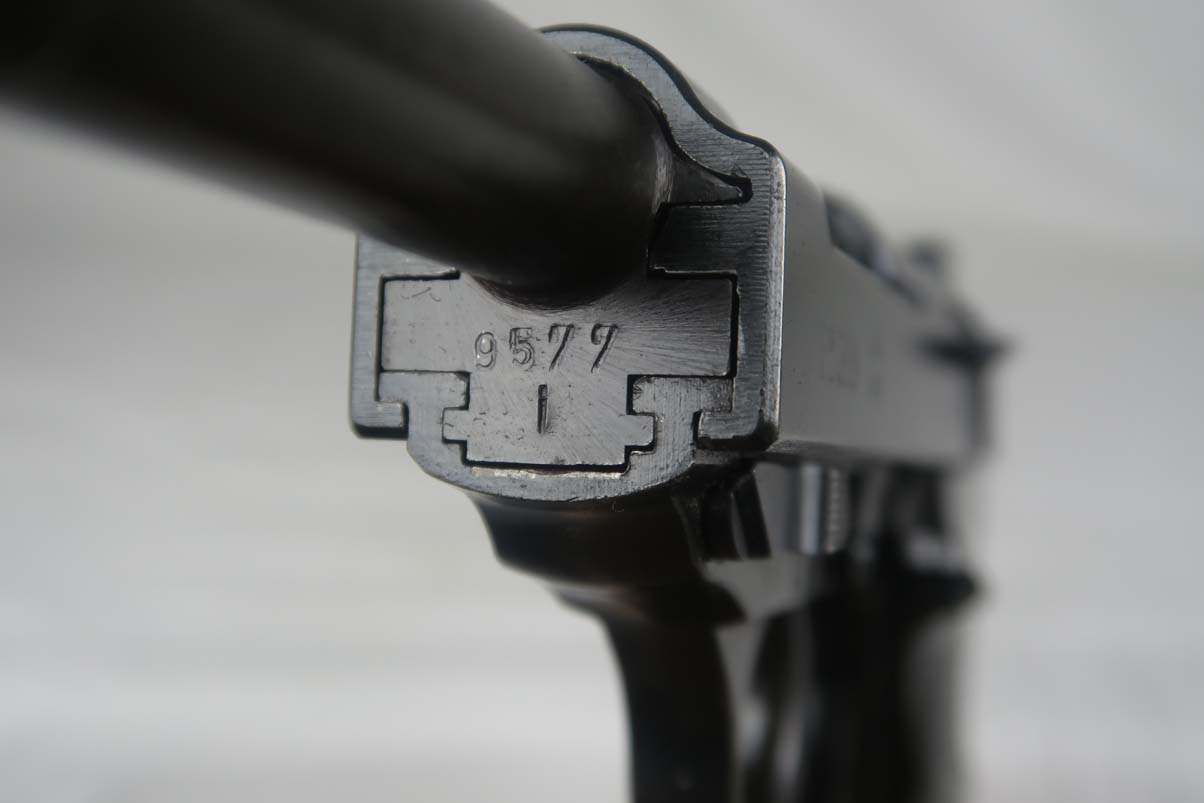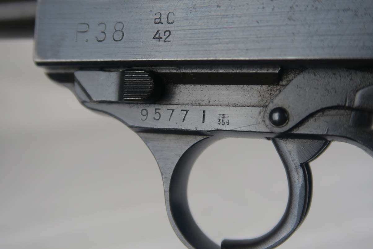 4/25/17 – This is an original Walther AC42 P.38 pistol from WW2. The pistol is all matching, original production with all original parts and fully functional. The finish is about 97% with some minor edge wear on the slide, some thinning on the finish of the front strap, and some slight discoloration on the sear bar (top of the slide). The bore is rated at 8 out of 10, meaning this bore is in great condition with strong lands and grooves, but has some signs of use and surface wear. The pistol should be fine to shoot and is mechanically sound. The magazine is proper for the pistol as well. Guaranteed original.