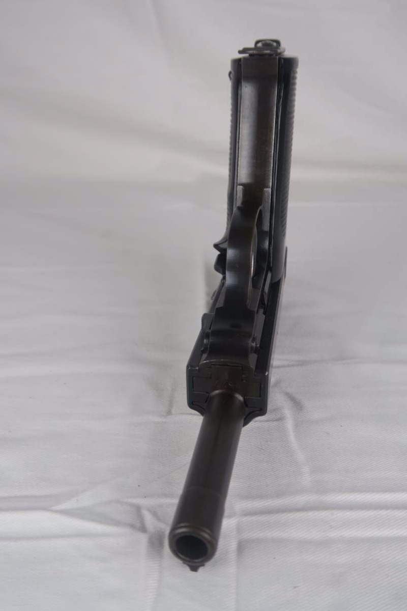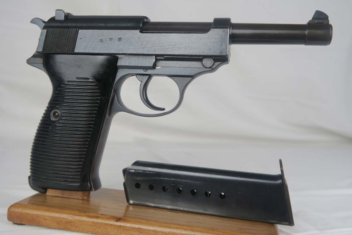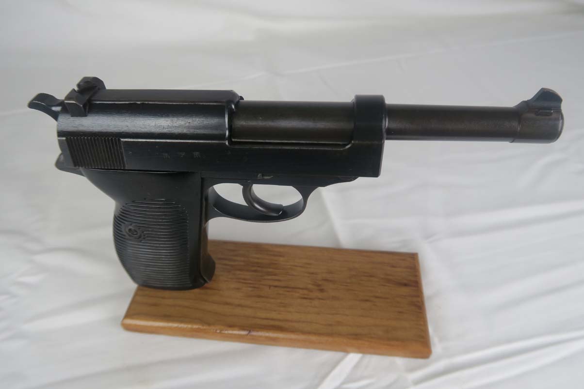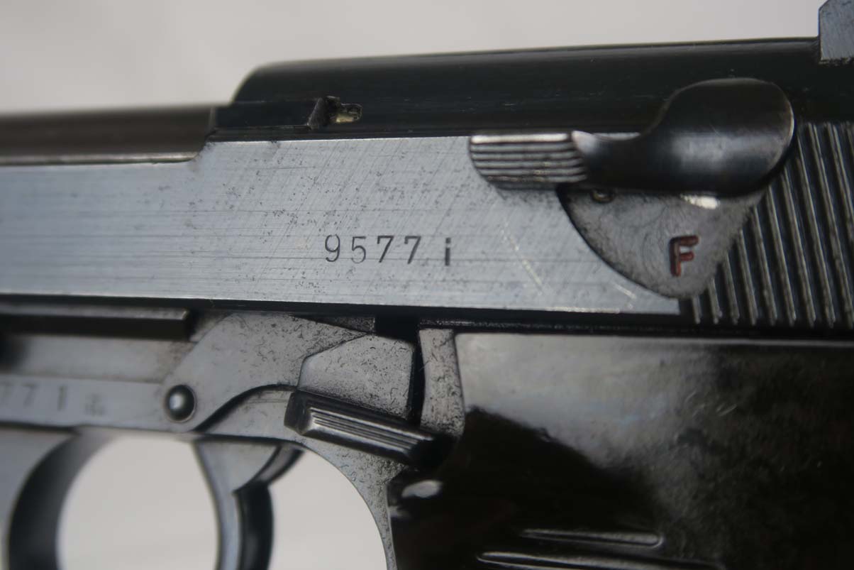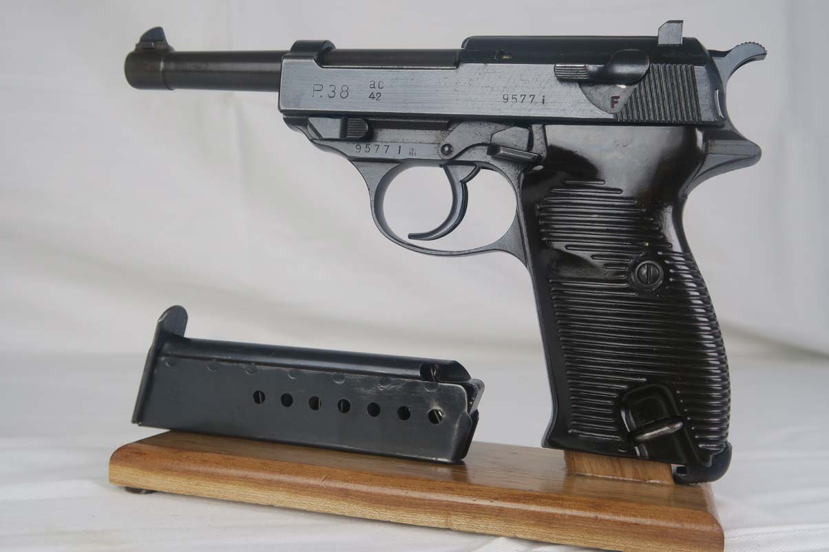 4/25/17 – This is an original Walther AC42 P.38 pistol from WW2. The pistol is all matching, original production with all original parts and fully functional. The finish is about 97% with some minor edge wear on the slide, some thinning on the finish of the front strap, and some slight discoloration on the sear bar (top of the slide). The bore is rated at 8 out of 10, meaning this bore is in great condition with strong lands and grooves, but has some signs of use and surface wear. The pistol should be fine to shoot and is mechanically sound. The magazine is proper for the pistol as well. Guaranteed original.