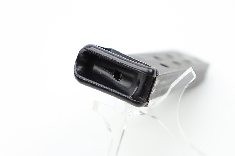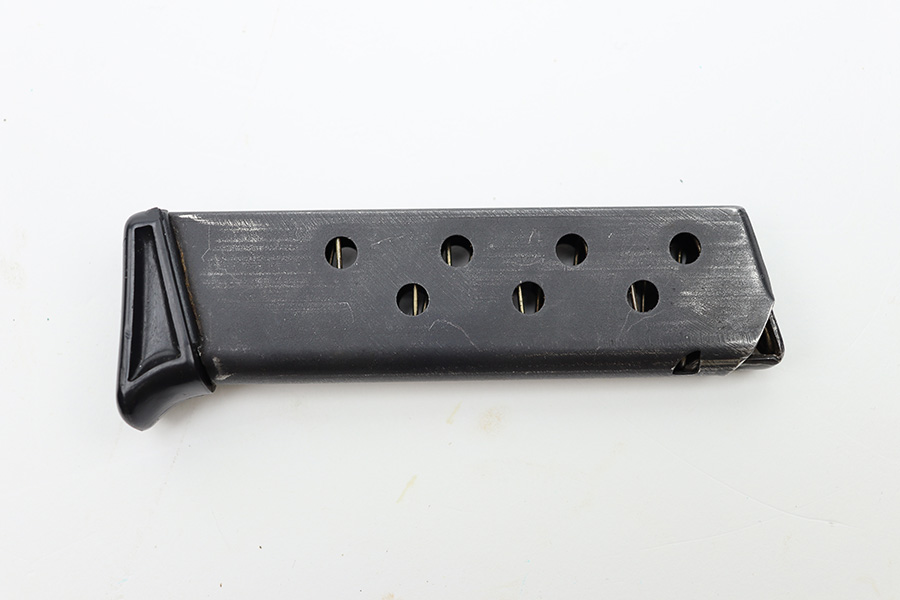 11/10/23 – This is an excellent Pre-WW2 Walther PP magazine with a Walther banner marking only. Fitted with a period-correct “thin lip” black bakelite finger extension. Later dull blue finish. Excellent bluing with only some very light scratches and surface scuffs here and there. Excellent bakelite base with no cracks or chips. Fully functional with great spring.