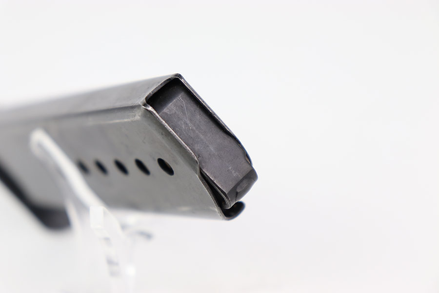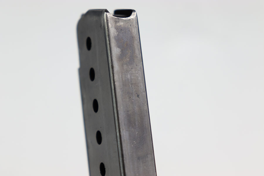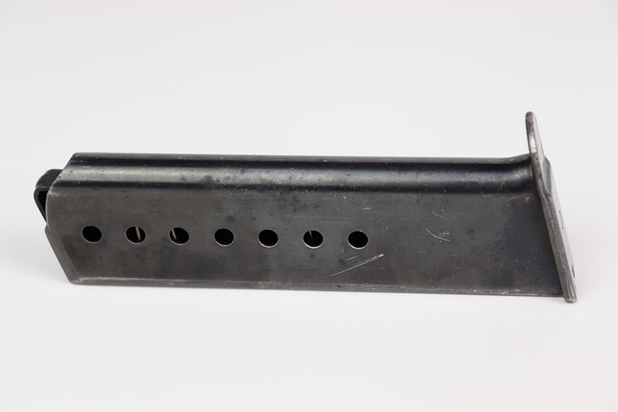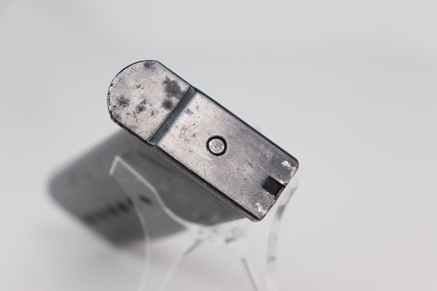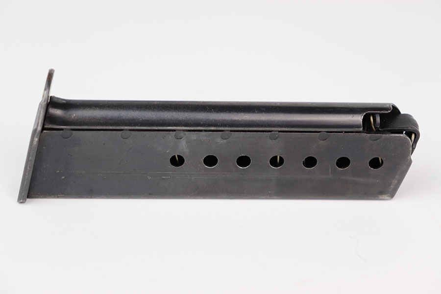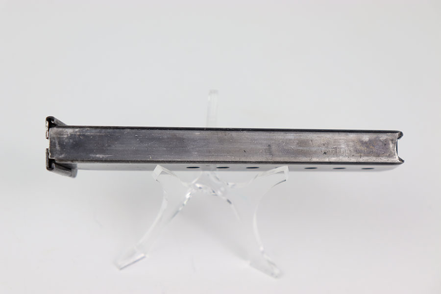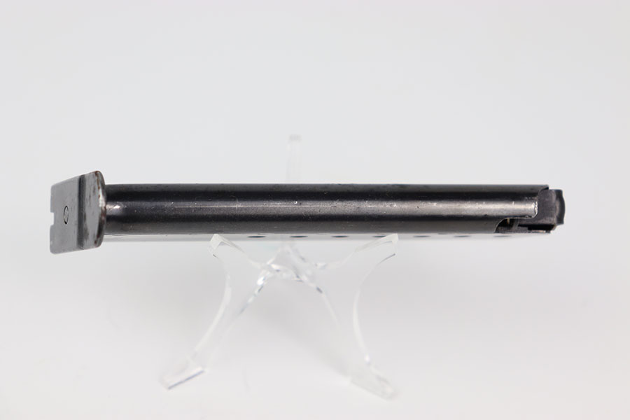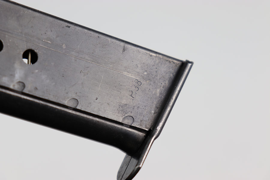 2/13/24 – This is an excellent example of an original Walther P.38 magazine with a Eagle 359 German military acceptance proof. The majority of the original high gloss bluing remains on this magazine other than some minor scratching throughout and some expected very light edge wear on the front and spine. The baseplate of this magazine has some light scratches spots of patina. The magazine is stamped Eagle 359 towards the top of the spine and “P.38” on the left side of the tube. Spring is strong and functional. Overall an excellent example.
