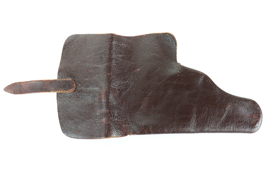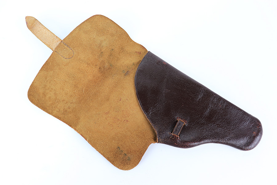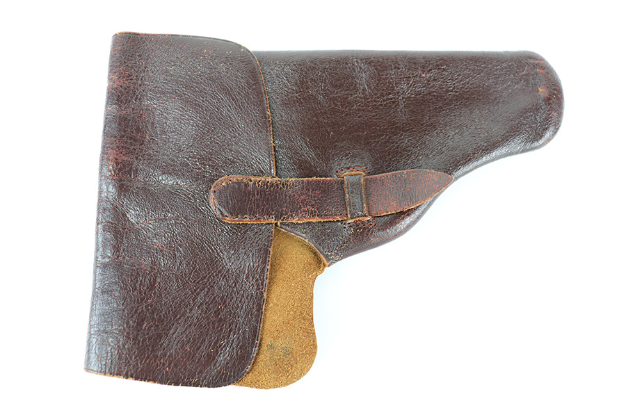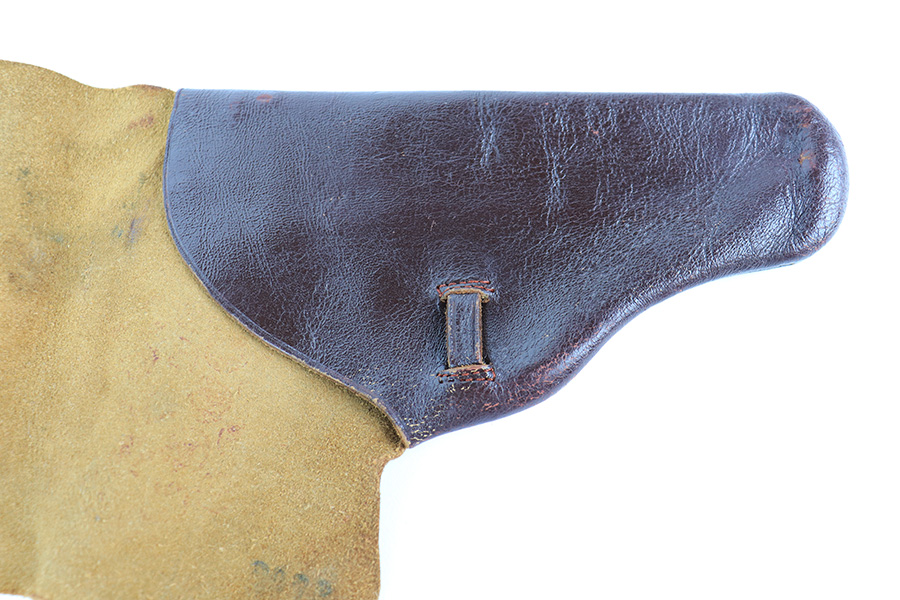3/23/22 – This is a simple-construction unmarked leather holster that fits a Walther PP, model 8, or similar sized 7.65mm pistol. We call these “Walther Factory” holsters, because of the theory that these were made for factory workers, guards, and inspectors who just needed a simple design to hold and protect their weapon. This style holster is never marked, and has flimsy, thin, and pliable leather. This example is in good overall condition with some mild surface wrinkling. No stitching issues.