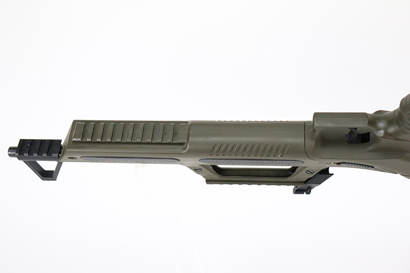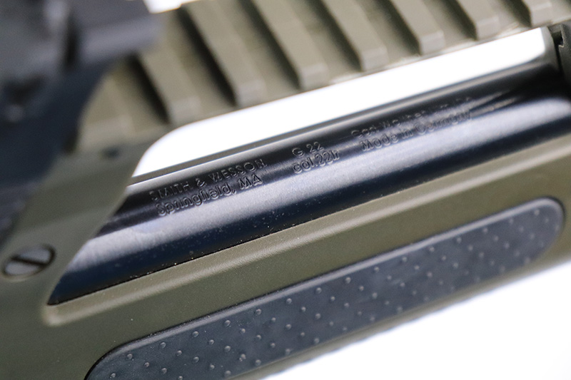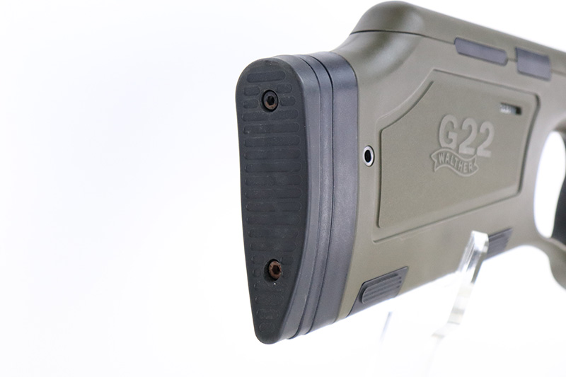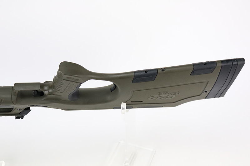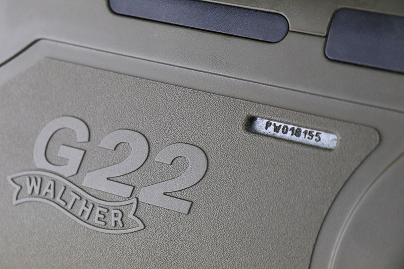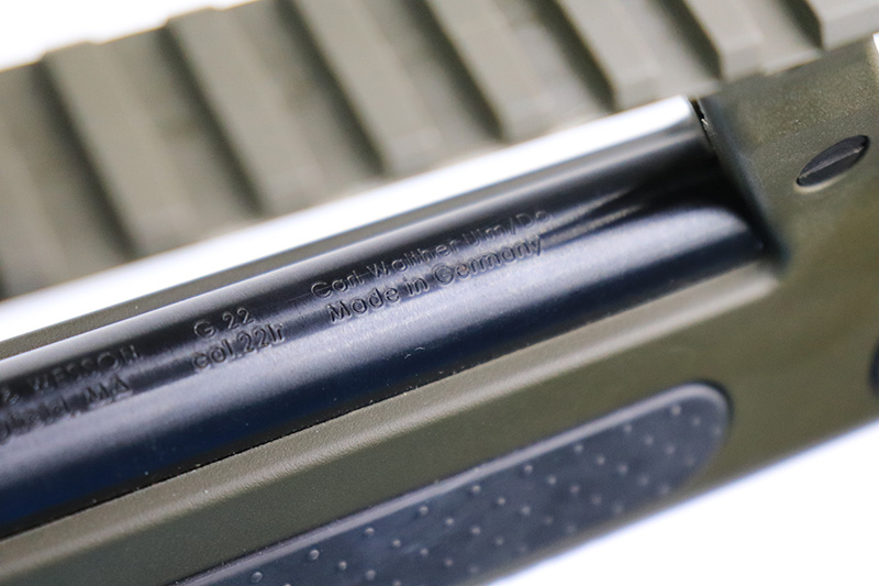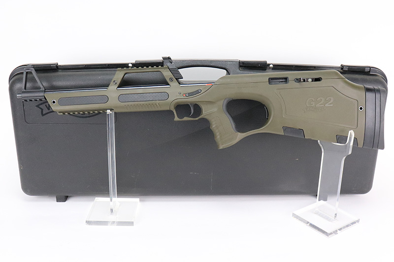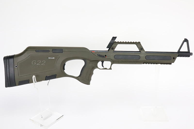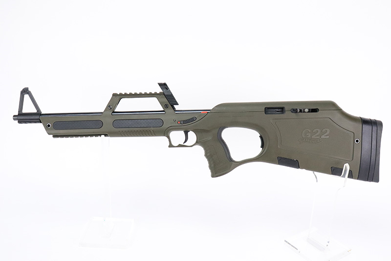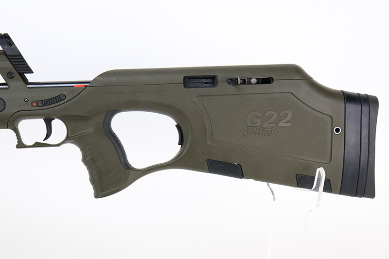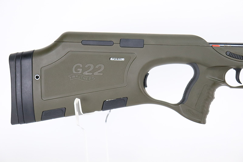 9/20/22 – This is a like-new example of a Walther G22 semi auto rifle, chambered in .22 LR. The gun is in like-new condition with very little sign of use or wear. There are just some very light handling scuffs here and there and an area of very light freckling at the back of the barrel. Comes with an excellent olive green colored synthetic stock. The gun comes in its original Walther hard case (not numbered). The bore is mint.
