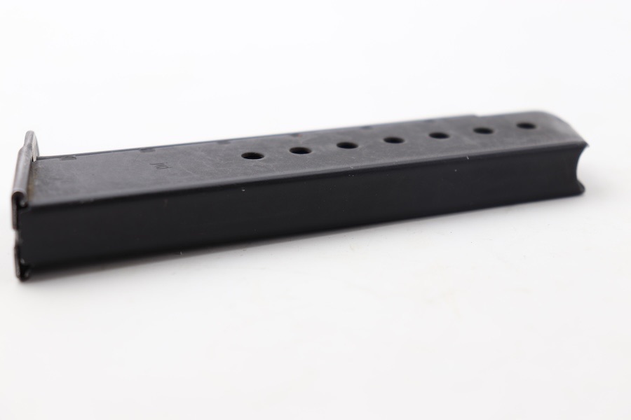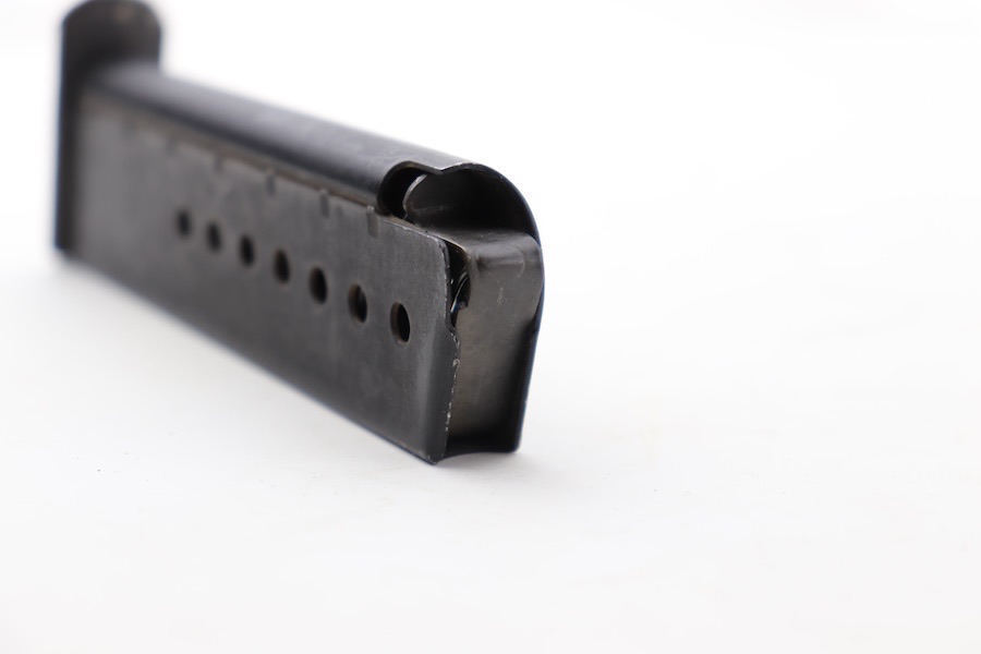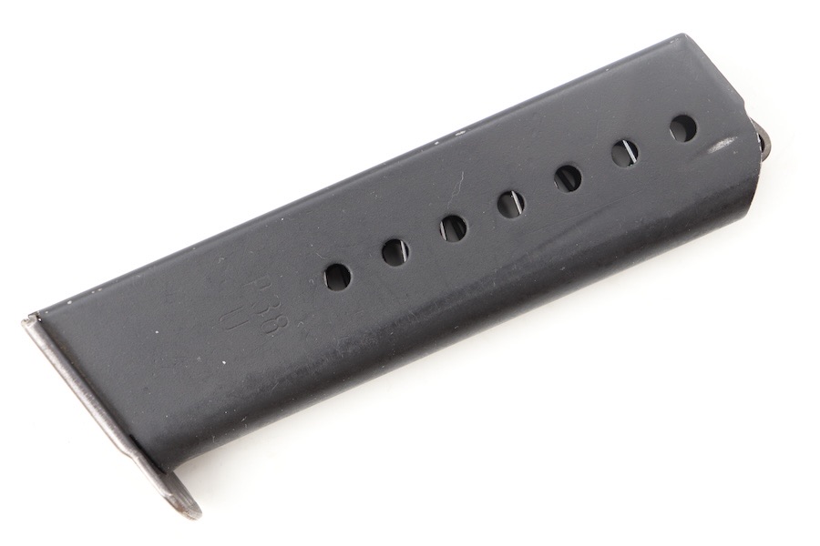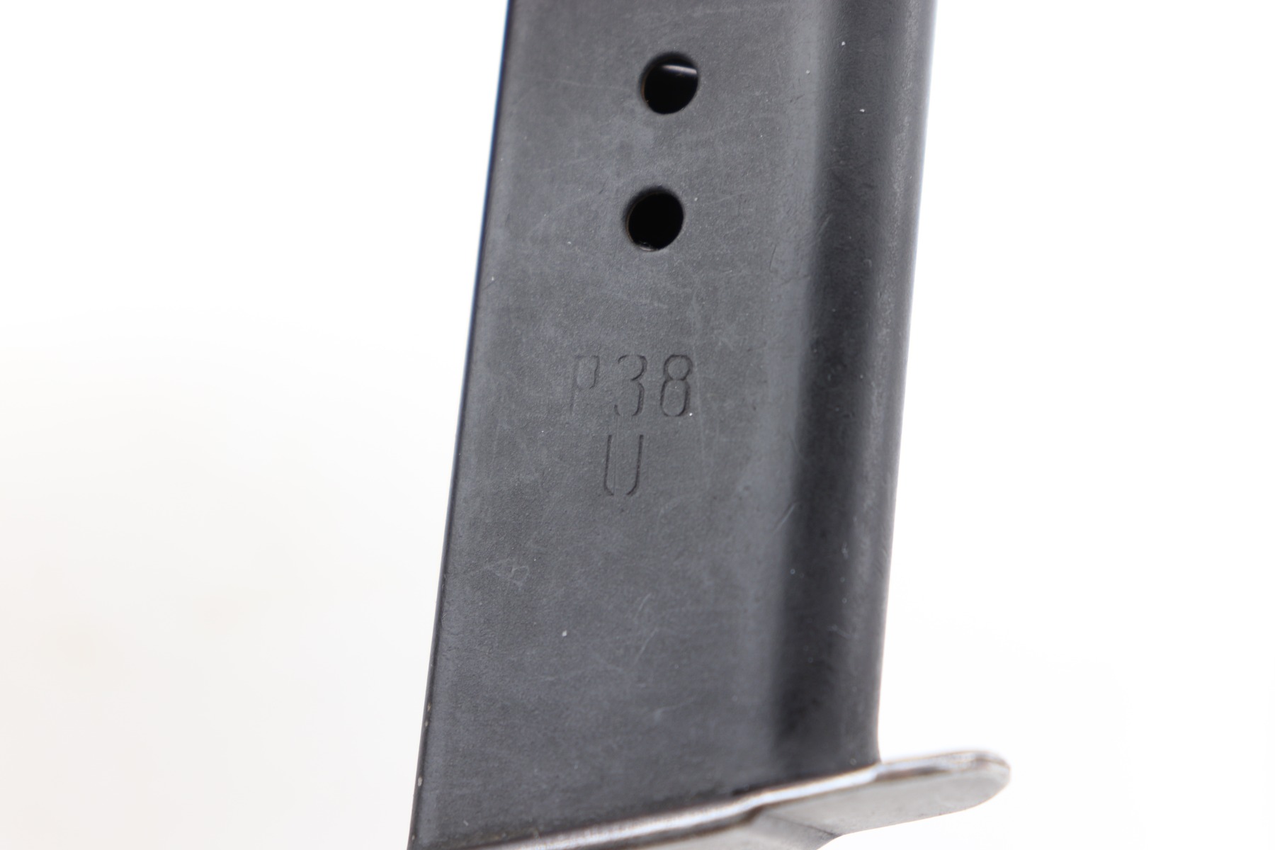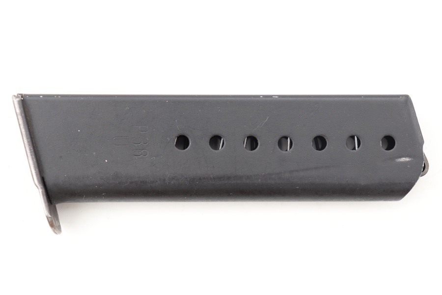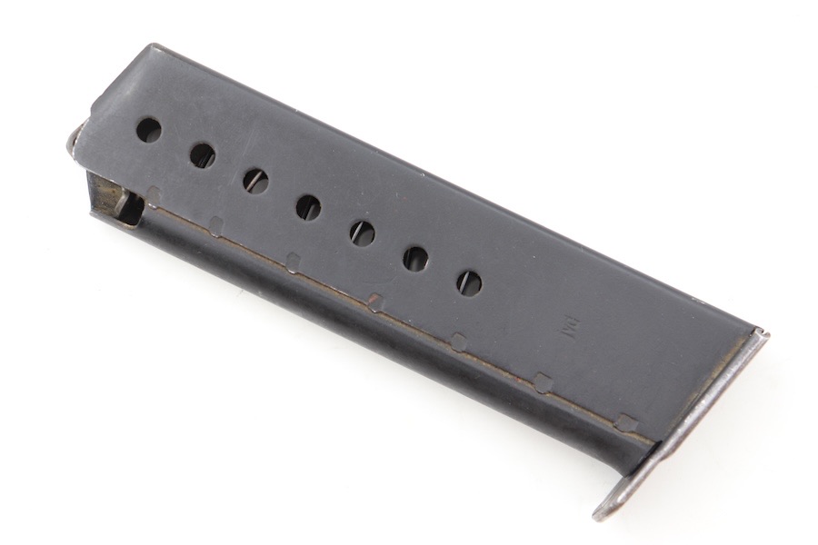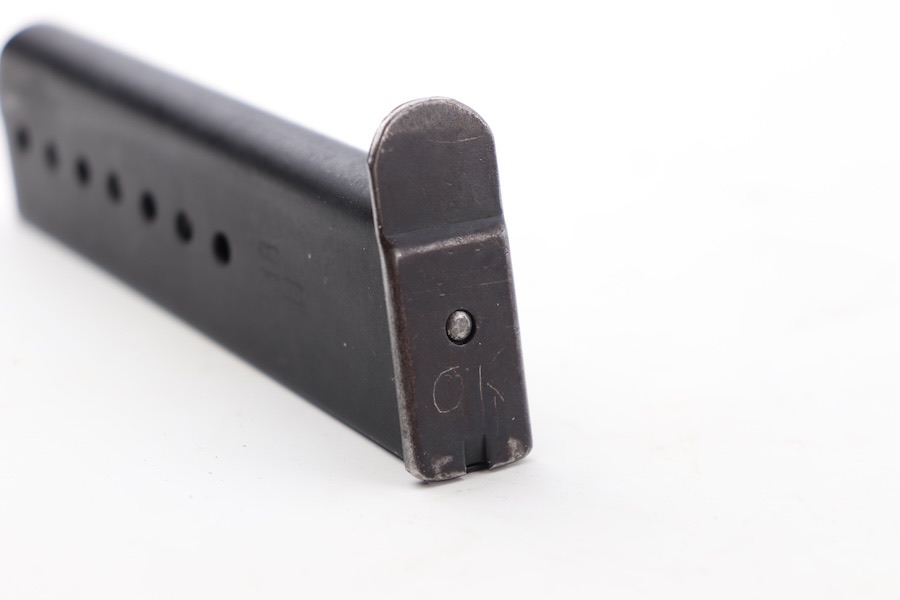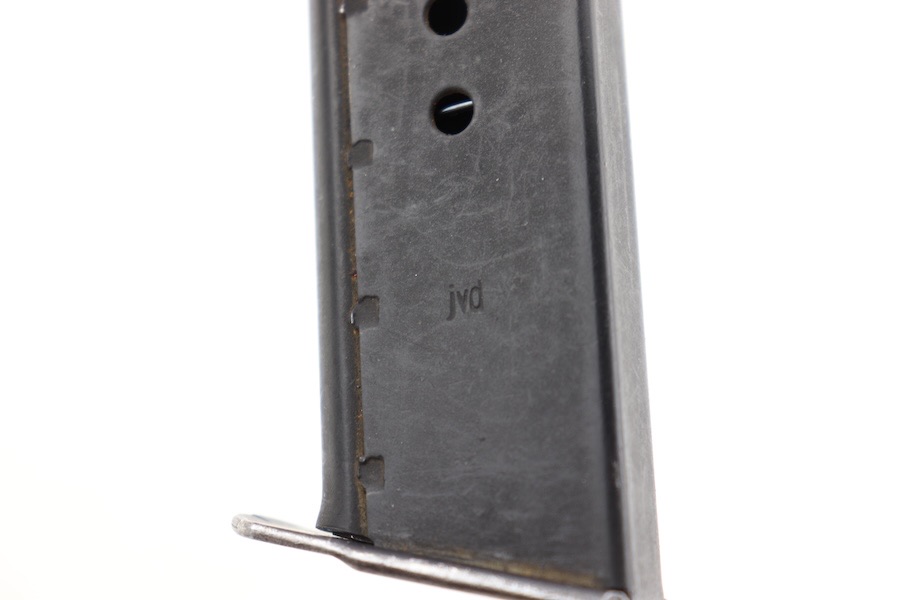 2/1/24 – This is an original, late WW2 production P.38 magazine. The magazine is in excellent condition with nearly all of the original finish intact, and a fully functional spring. The left side of the tube is “jvd” stamped and the right side is P.38 U stamped. No visible proofs on the spine. Strong, functional spring. Great for any late-war P.38!