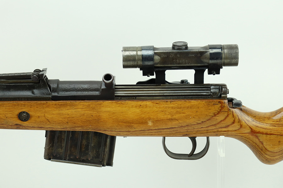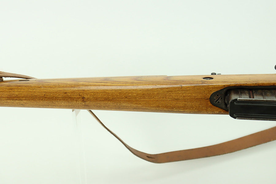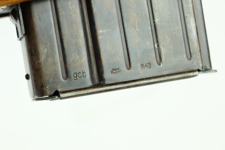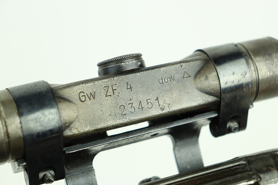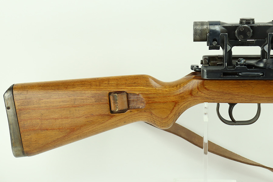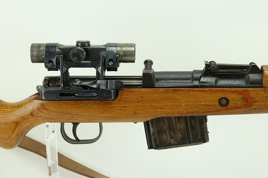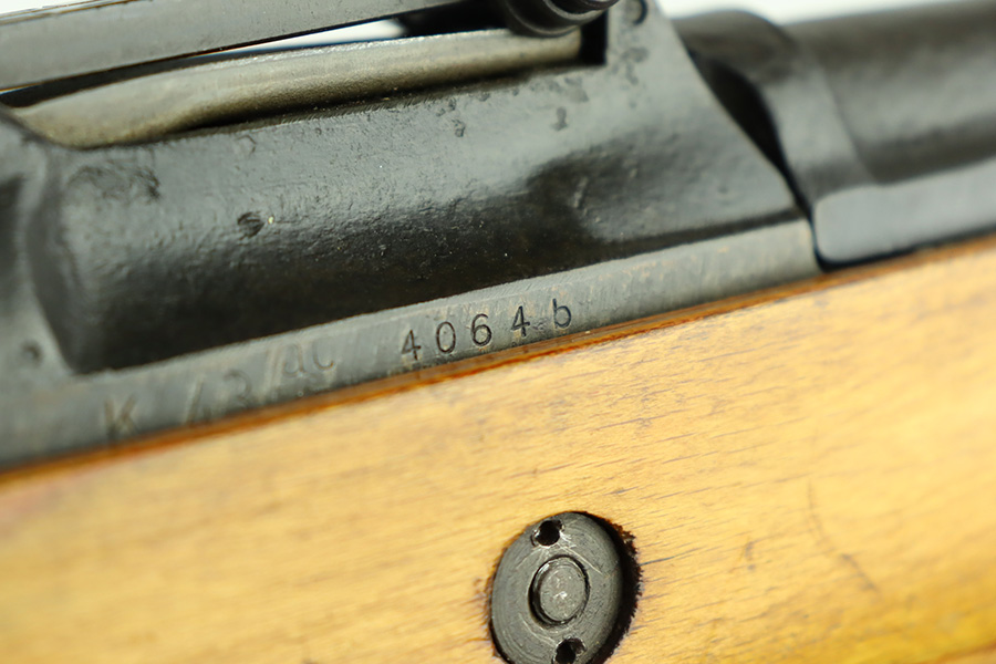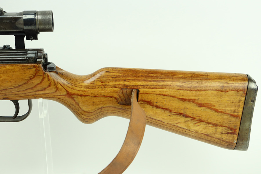 2/5/24 – This is a nice example of a Walther K.43 sniper rifle from 1945. All numbered parts are matching, but many of the internal parts are not numbered. There is a hole in the bolt carrier and bolt housing, so we would advise having your gunsmith inspect this one before you fire it – it likely needs new internal parts. There is very little finish loss. The scope shows some thinning and pitting, but the optics are good. Excellent wood furniture, but we believe it has been sanded. Excellent bore with strong rifling. Comes with one proper magazine and a tan leather sling.
