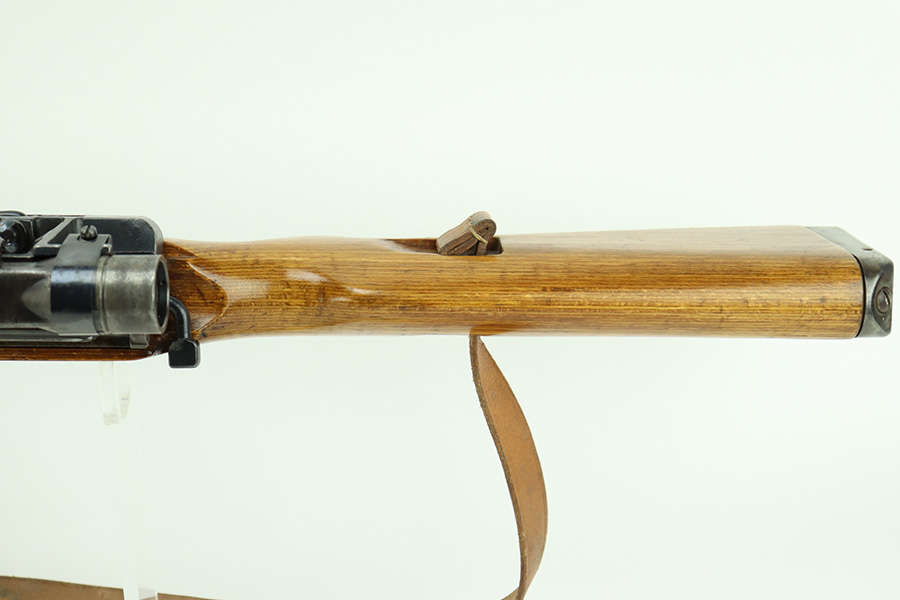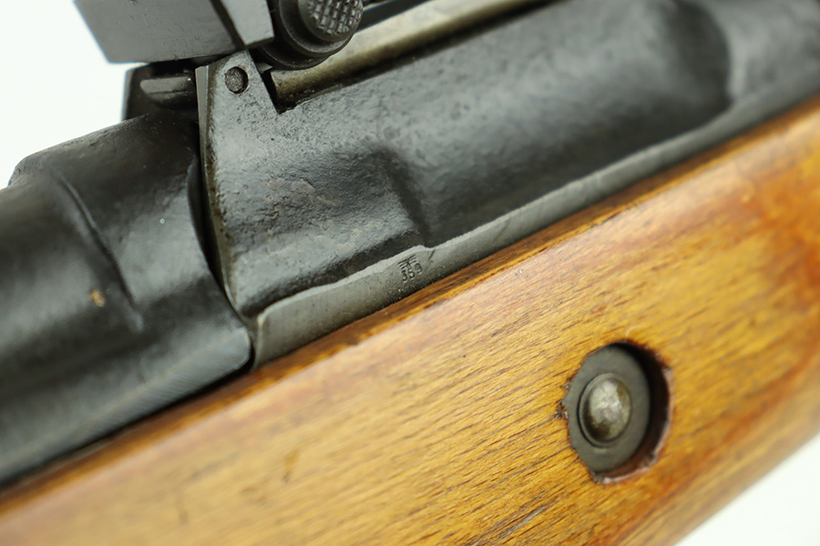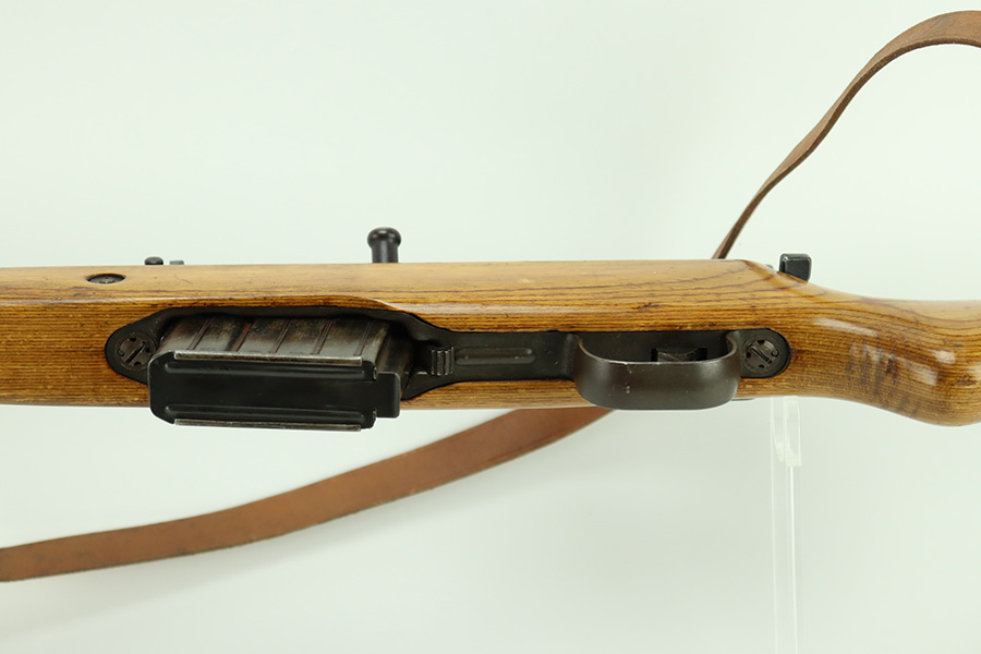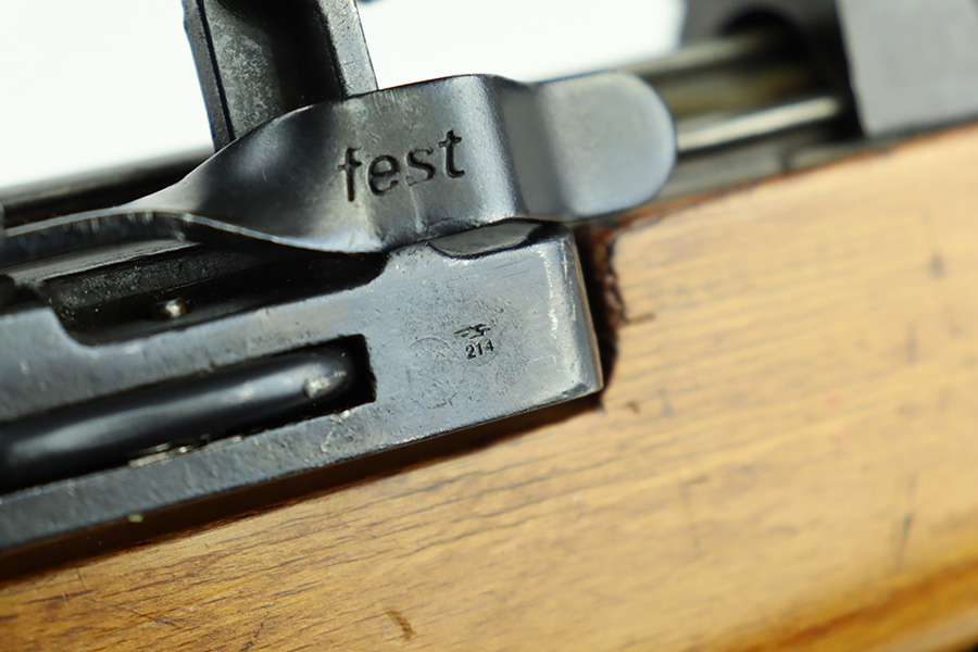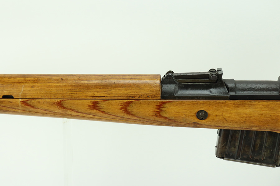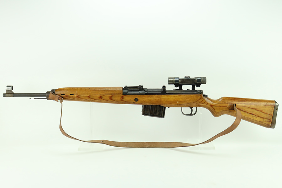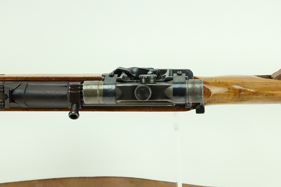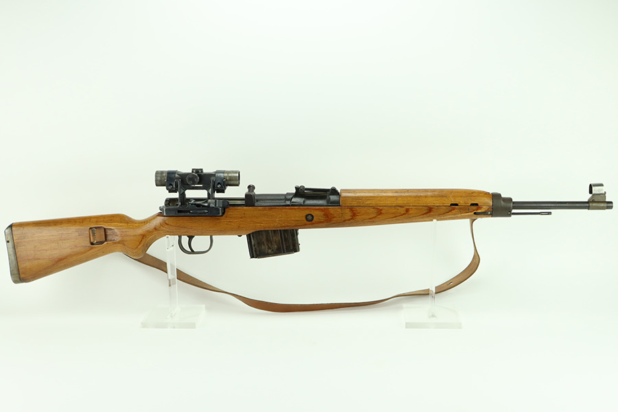 2/5/24 – This is a nice example of a Walther K.43 sniper rifle from 1945. All numbered parts are matching, but many of the internal parts are not numbered. There is a hole in the bolt carrier and bolt housing, so we would advise having your gunsmith inspect this one before you fire it – it likely needs new internal parts. There is very little finish loss. The scope shows some thinning and pitting, but the optics are good. Excellent wood furniture, but we believe it has been sanded. Excellent bore with strong rifling. Comes with one proper magazine and a tan leather sling.