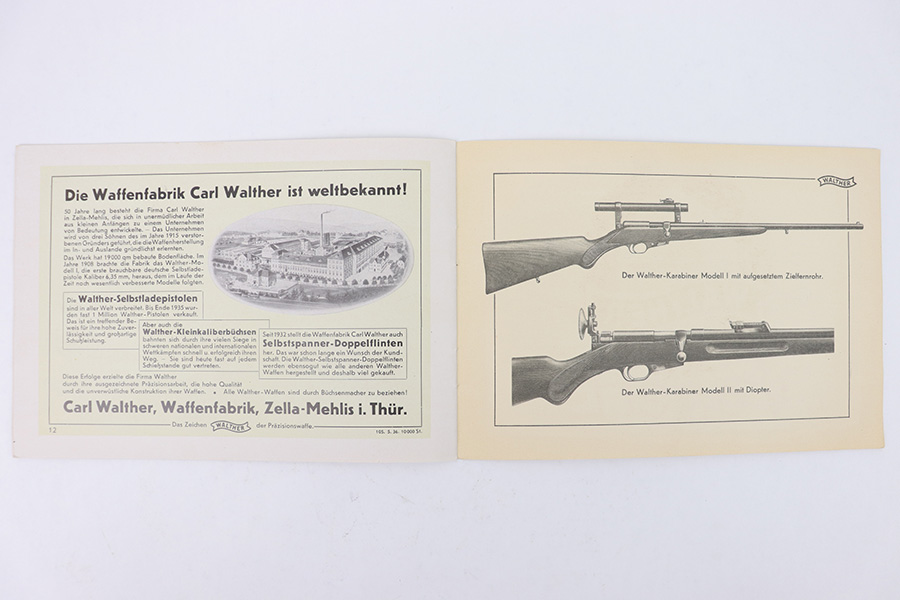 1/19/23 – This is an original Walther Karabiner Model 1 & 2 Manual from 1936. Excellent condition with all pages intact. Color pages and color cover, written in German.