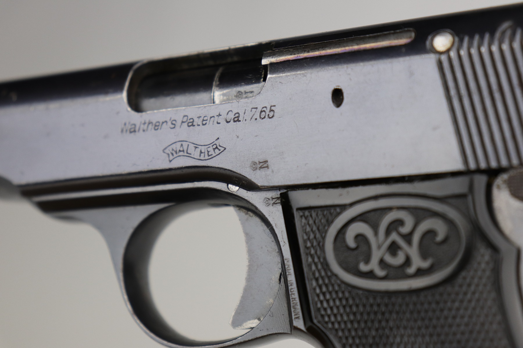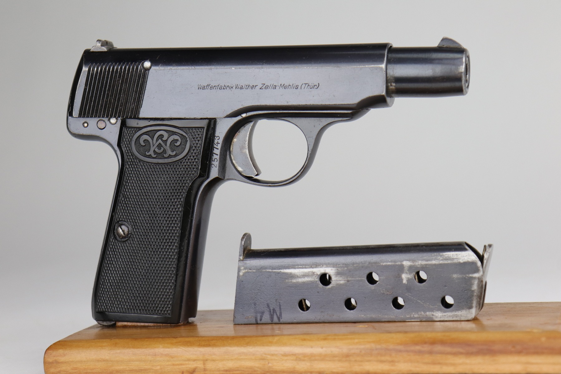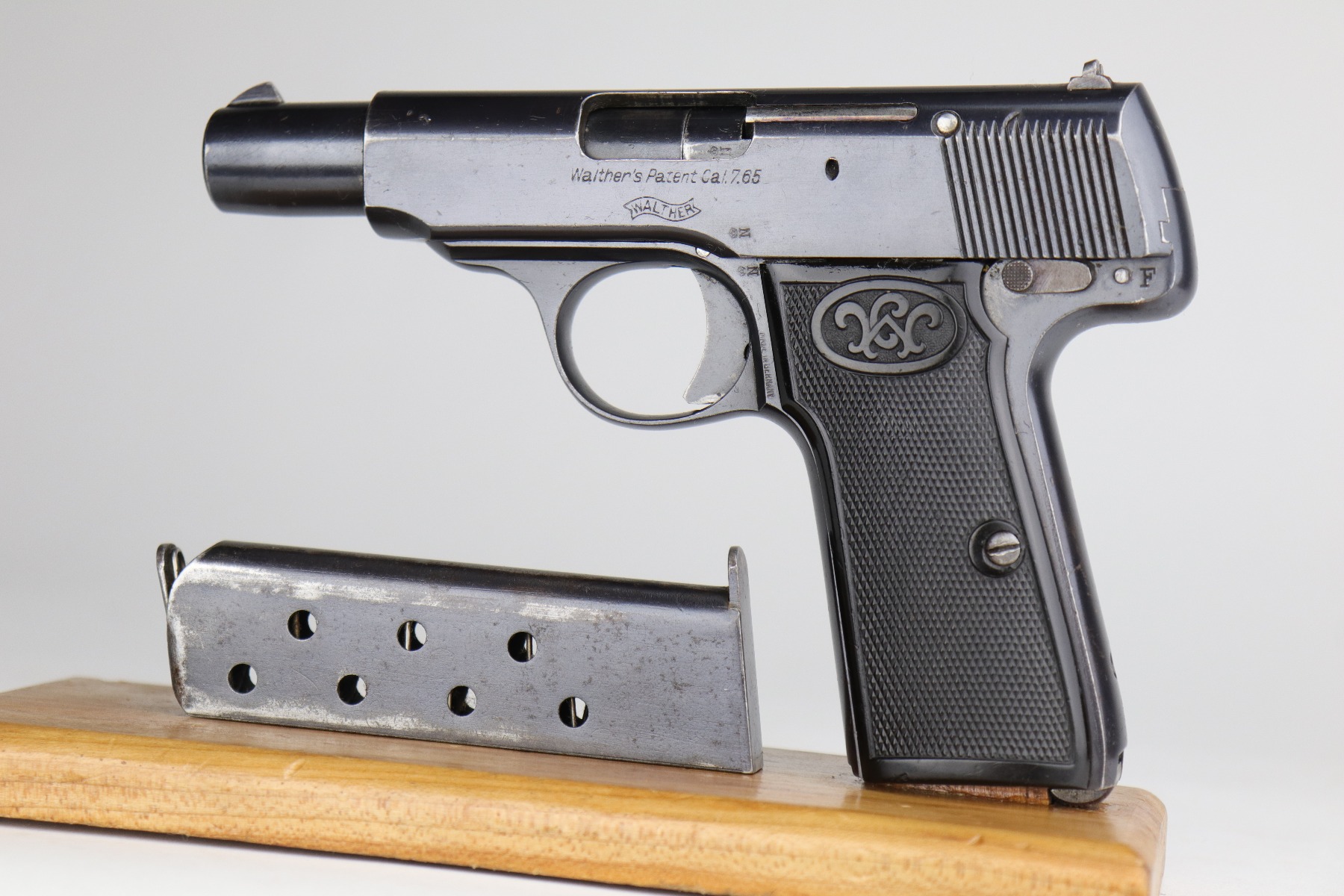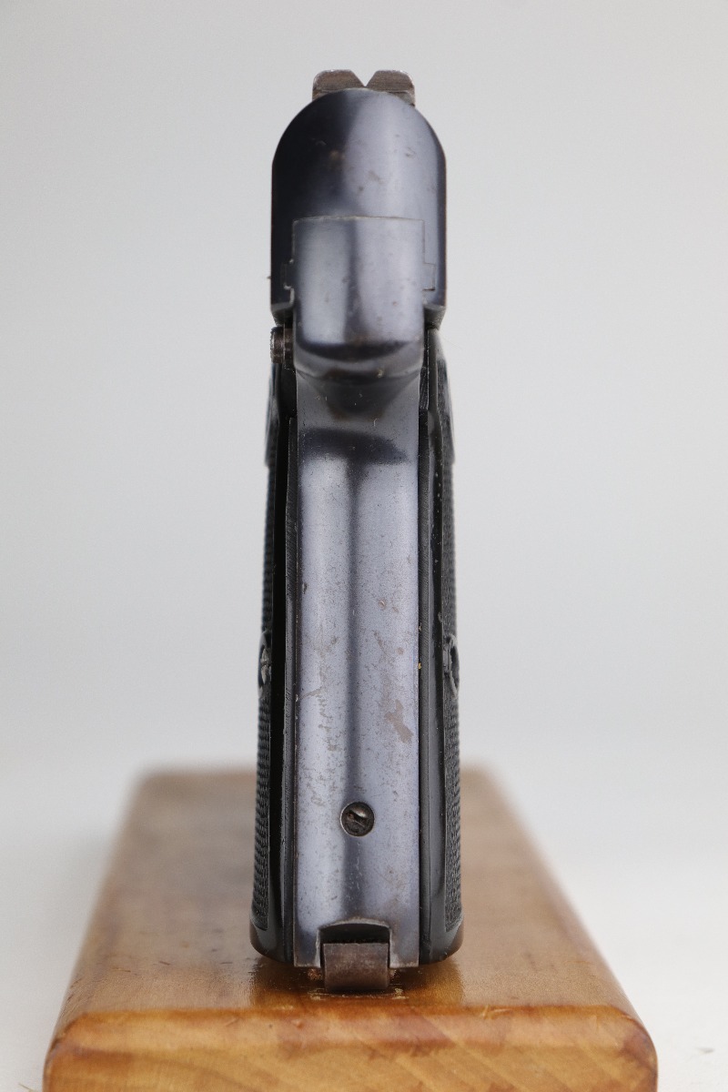 8/12/20 – This is a Walther Model 4 manufactured in the late 1920’s. This particular gun is of the 6th variation, characterized by the “Waffenfabrik Walther Zella-Mehlis (Thur)” legend on the right side of the slide and the rectangular ejection port. There is a small “Made in Germany” export mark on the left side of the frame. The frame, slide, and ejection port are “Crown N” proofed. This example has retained about 96-97% of its original bluing. There is very minor muzzle and high edge wear and minor handling marks here and there. There are small spots of oxidation on the straps and the underside of the slide near the muzzle. There is also an area of wear on the underside of the slide. The bore has decent rifling with minor pin-pricking. Very nice grips with a few small surface dings. Comes with a period-correct magazine.