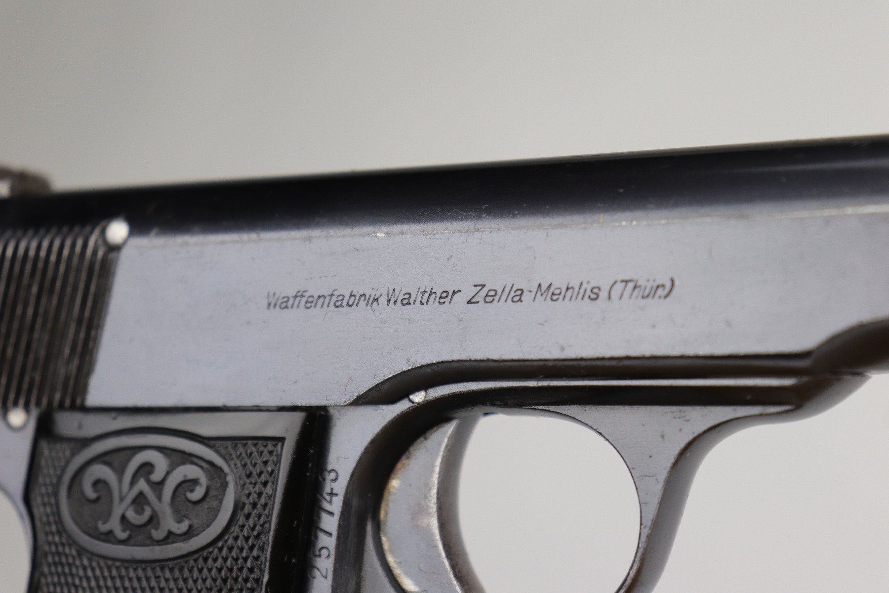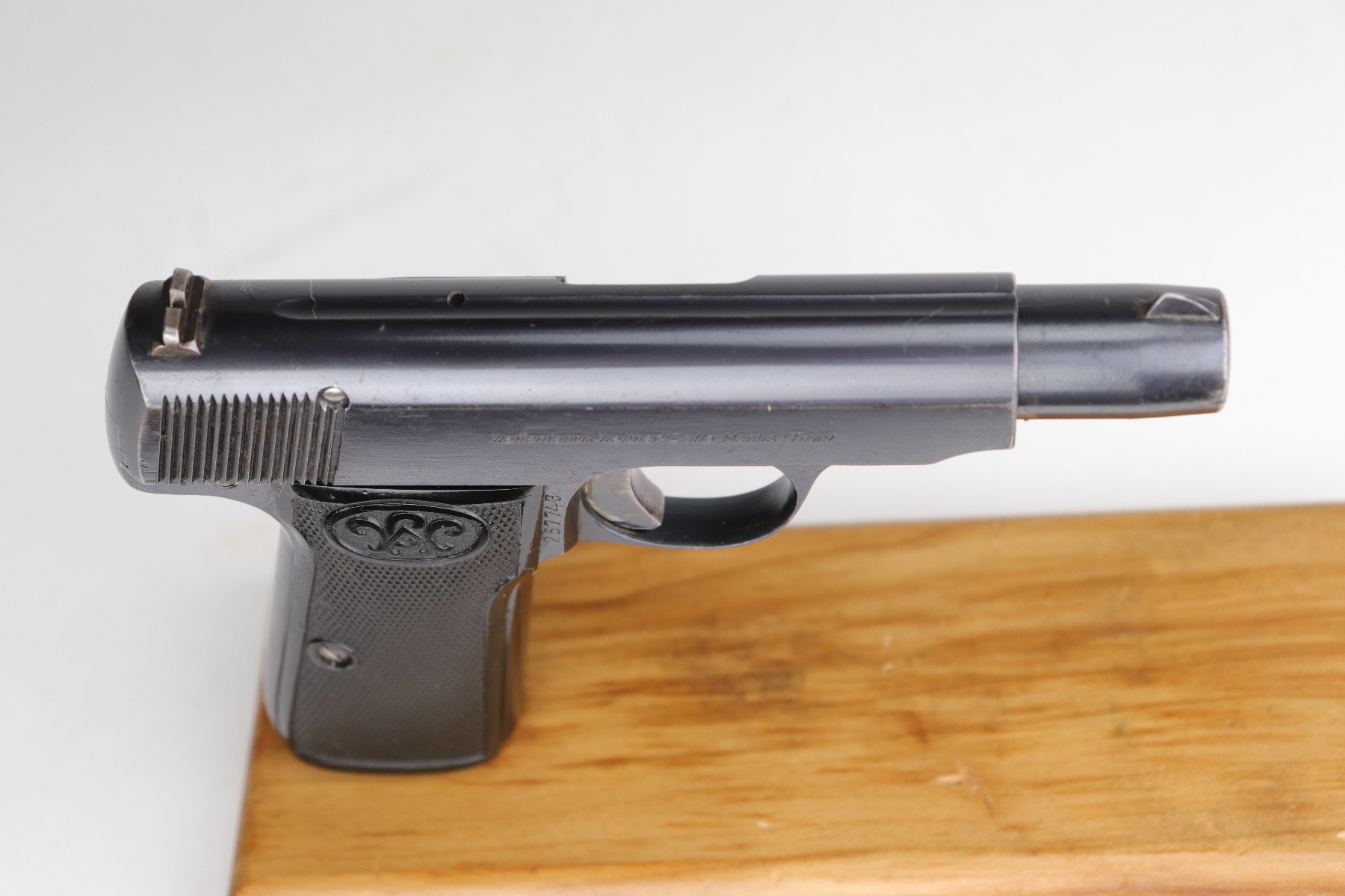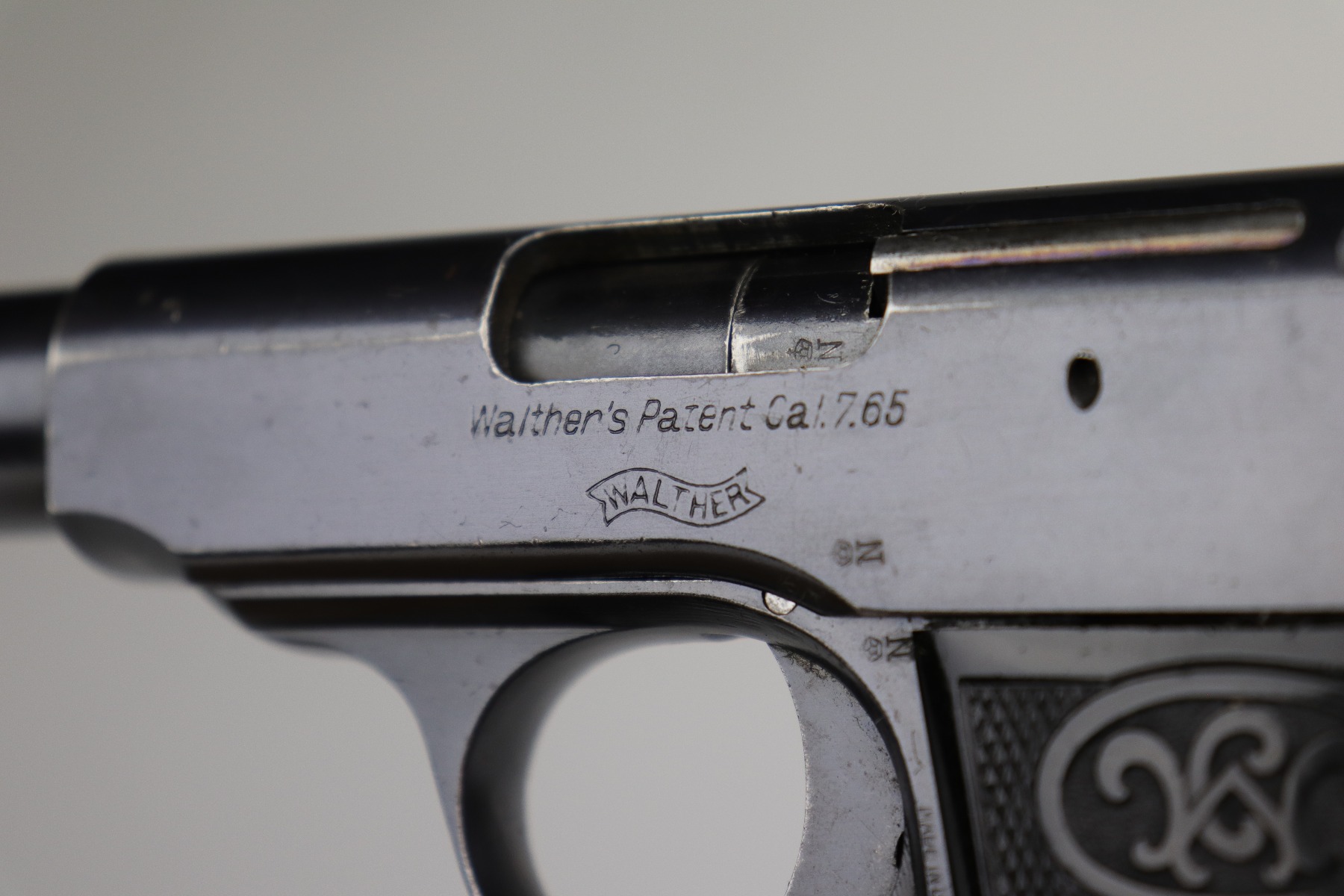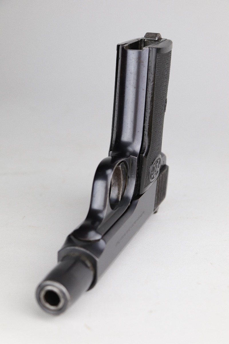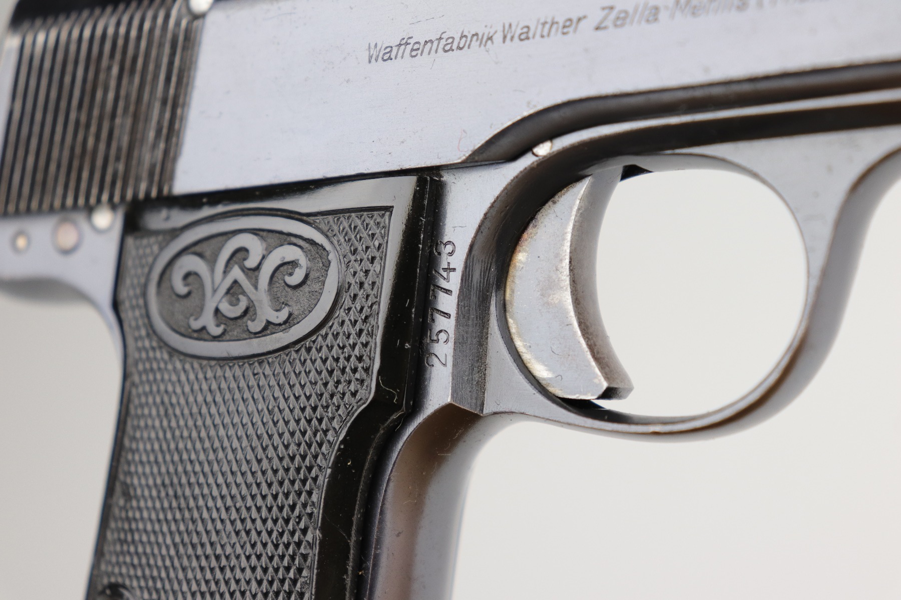 8/12/20 – This is a Walther Model 4 manufactured in the late 1920’s. This particular gun is of the 6th variation, characterized by the “Waffenfabrik Walther Zella-Mehlis (Thur)” legend on the right side of the slide and the rectangular ejection port. There is a small “Made in Germany” export mark on the left side of the frame. The frame, slide, and ejection port are “Crown N” proofed. This example has retained about 96-97% of its original bluing. There is very minor muzzle and high edge wear and minor handling marks here and there. There are small spots of oxidation on the straps and the underside of the slide near the muzzle. There is also an area of wear on the underside of the slide. The bore has decent rifling with minor pin-pricking. Very nice grips with a few small surface dings. Comes with a period-correct magazine.