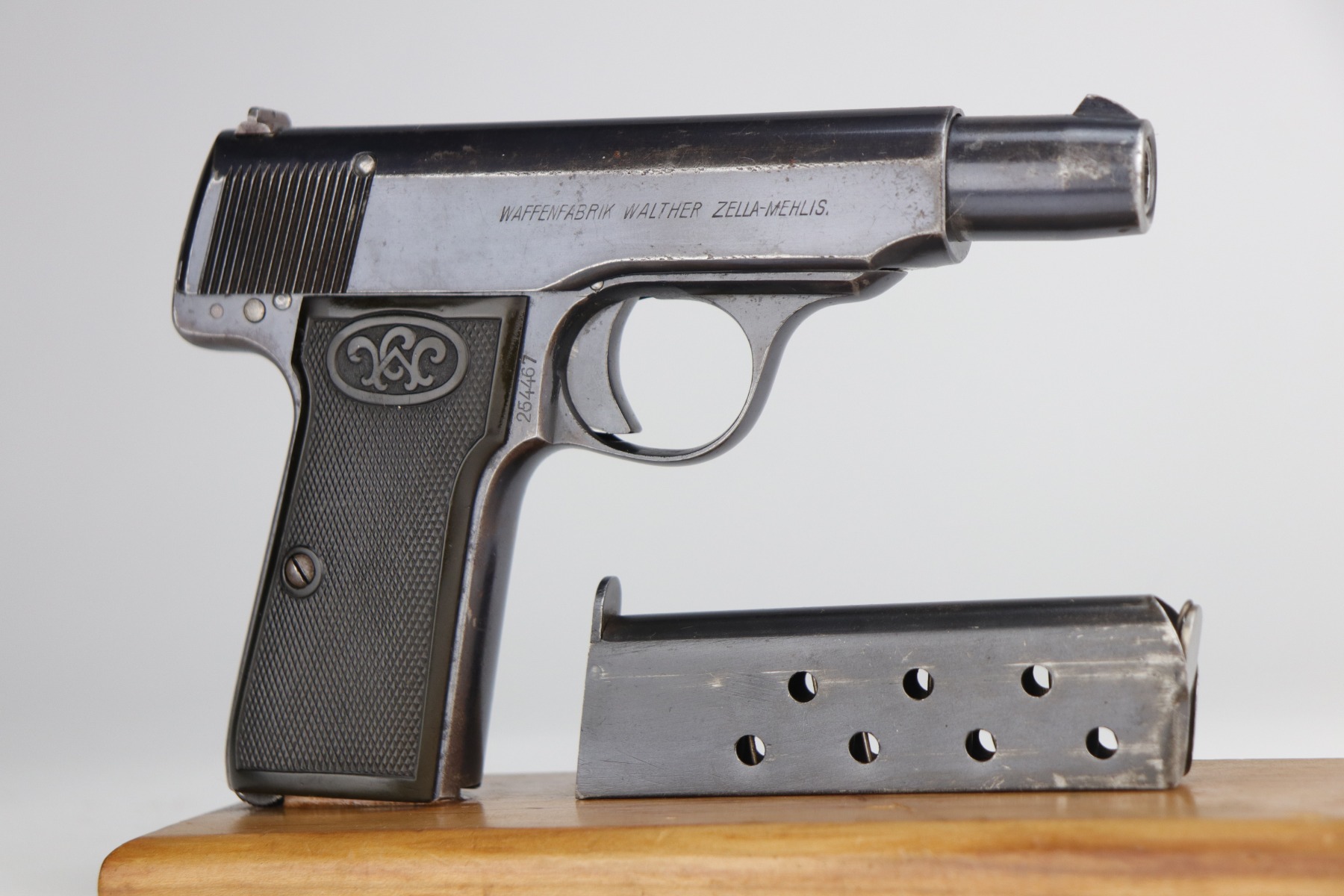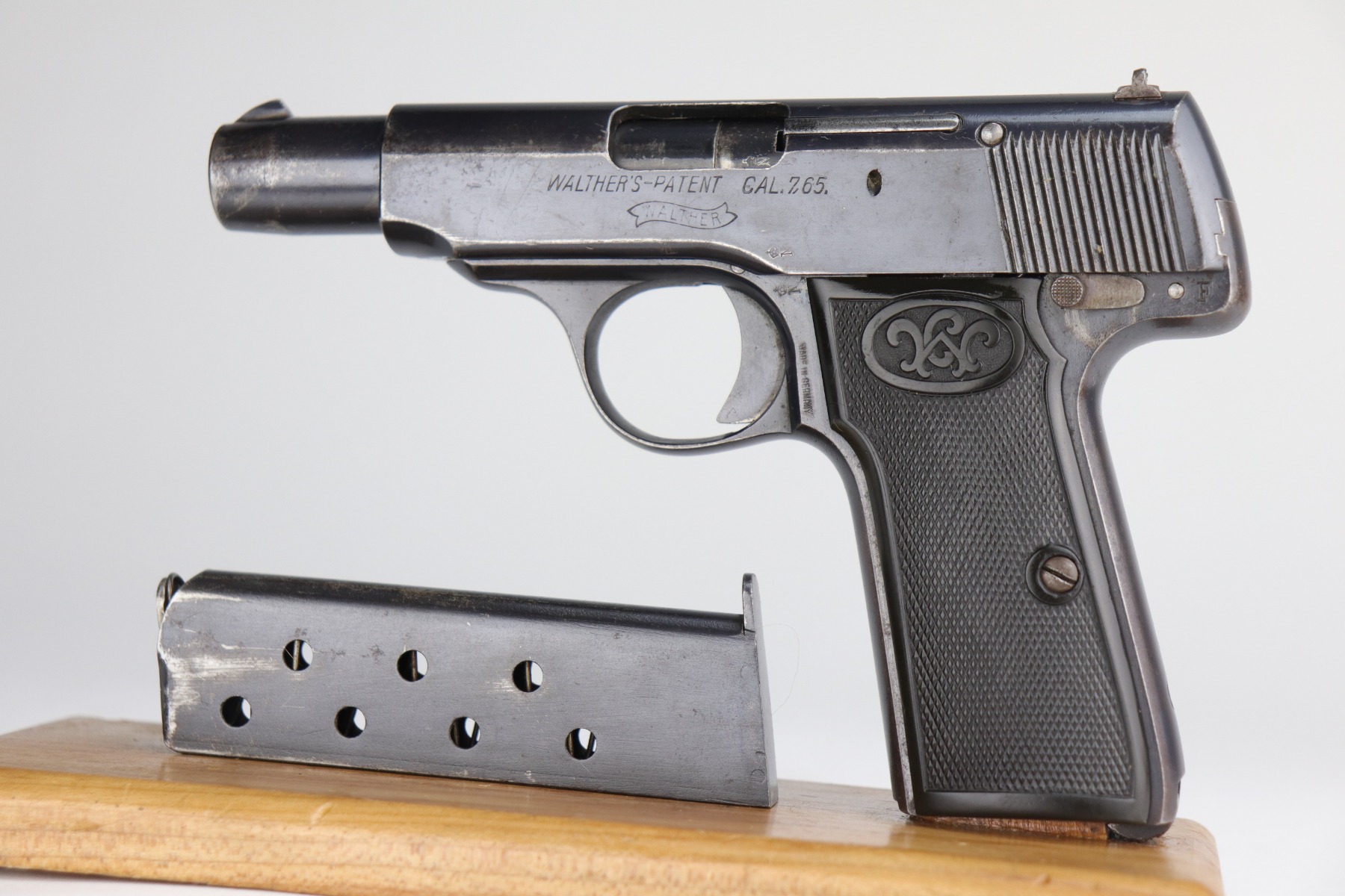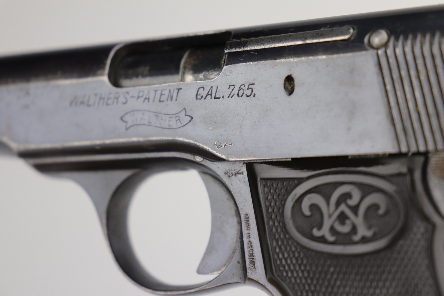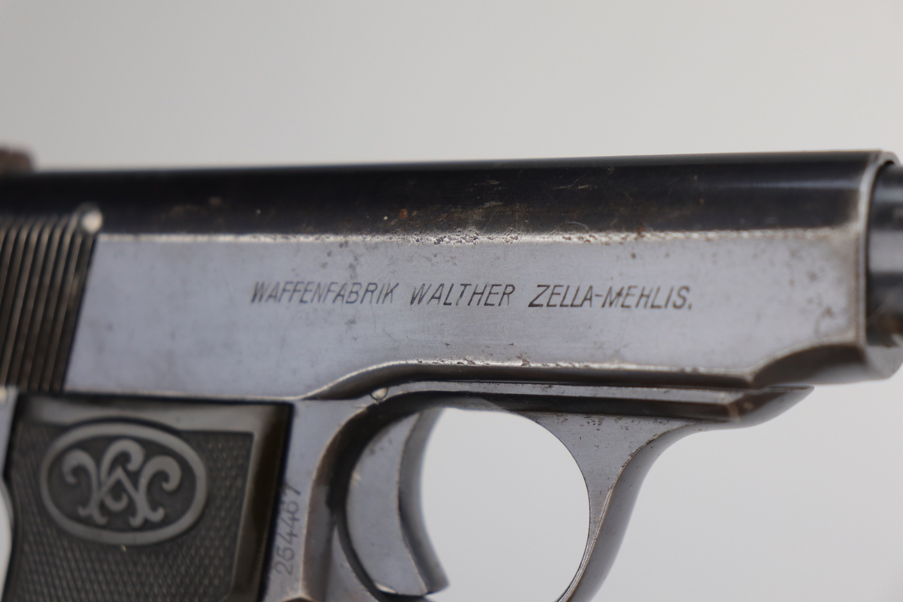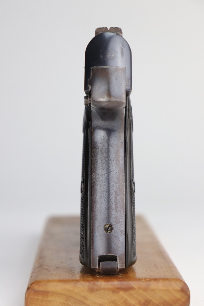 9/10/20 – This is an original Walther Model 4 pistol, chambered in 7.65mm. It is of the 4th variation of this design. It has “Crown N” proofs and a Germany export mark. The gun is fully functional. It has retained about 85% of its original bluing. There is spotty wear throughout, most noticeable around the muzzle and high edges of the slide. There are a couple of small areas of wear on the straps, where there is also pin-pricking. There are light scratches on the slide throughout. There are also areas of minor pitting around the muzzle and the high edges of both sides of the slide. It has excellent original grips and one period-correct magazine. The bore has decent rifling, but there is pin-pricking throughout.