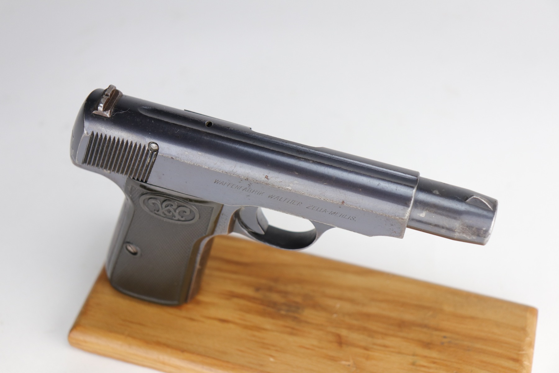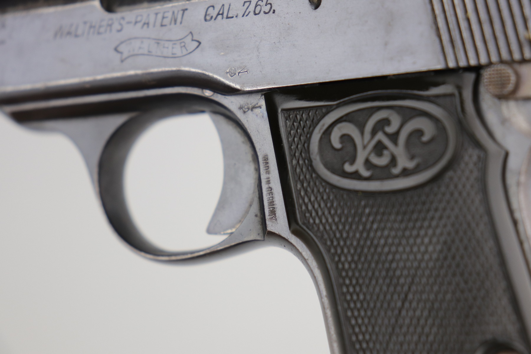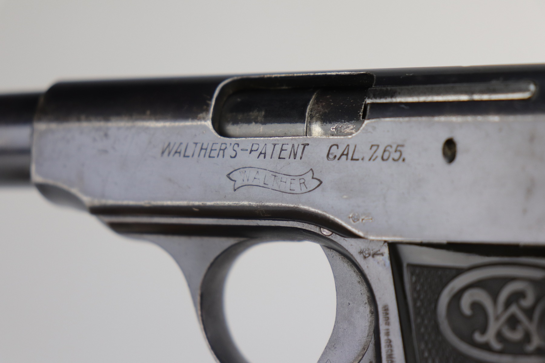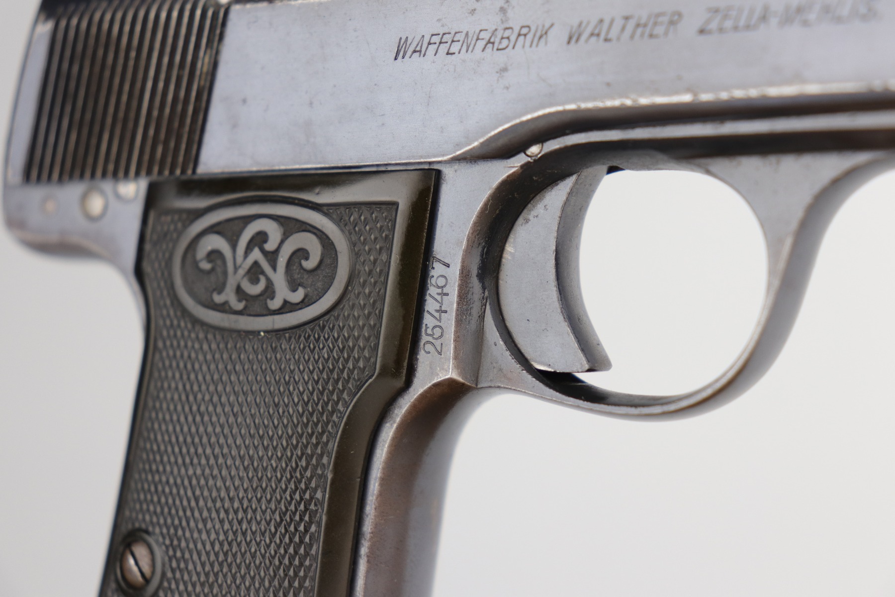 9/10/20 – This is an original Walther Model 4 pistol, chambered in 7.65mm. It is of the 4th variation of this design. It has “Crown N” proofs and a Germany export mark. The gun is fully functional. It has retained about 85% of its original bluing. There is spotty wear throughout, most noticeable around the muzzle and high edges of the slide. There are a couple of small areas of wear on the straps, where there is also pin-pricking. There are light scratches on the slide throughout. There are also areas of minor pitting around the muzzle and the high edges of both sides of the slide. It has excellent original grips and one period-correct magazine. The bore has decent rifling, but there is pin-pricking throughout.