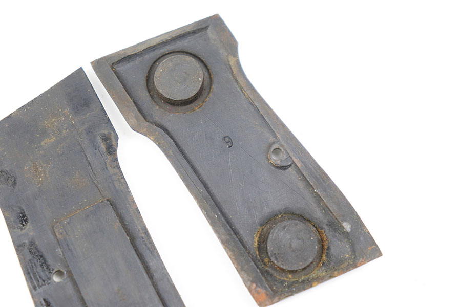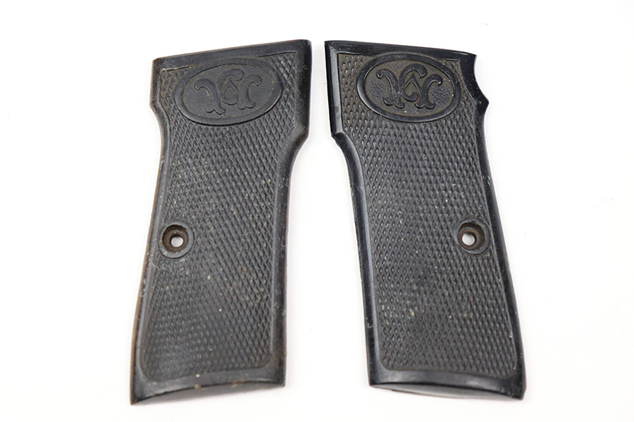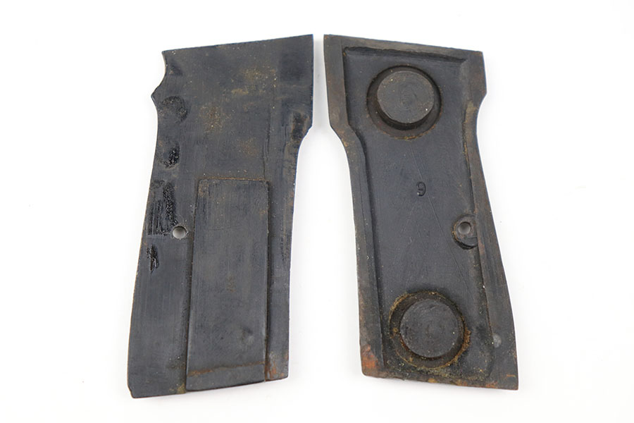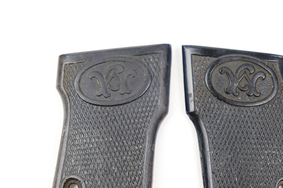 11/23/21 – This is an original pair of Walther model 4 grips. The grips are in great shape with no cracks or chips. No escutcheon or screw included. Some mild exterior wear from typical aging and mild use, but no excessive damage. One of the panels is number stamped “9” on the interior.