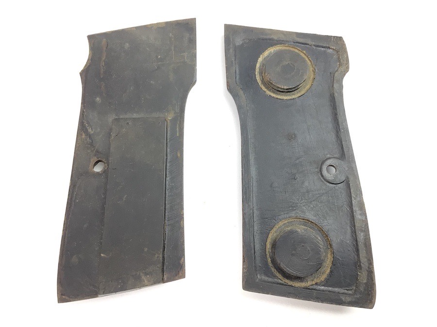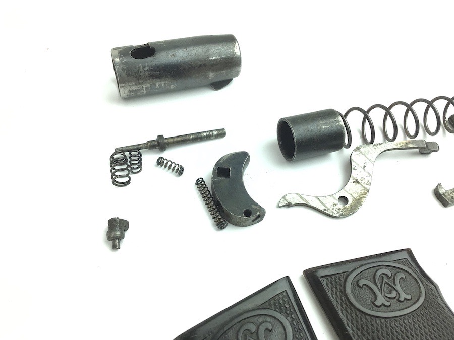 7/22/24 – Original and great condition. Walther model 4 grip panels and small parts kit. The grips are in great shape with no cracks or chips. Distinct checkering and “CW” logo and handling wear. The small parts are are useable showing minor wear and bluing loss.