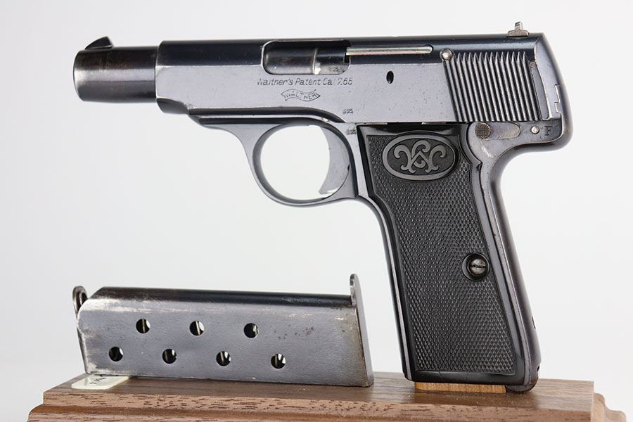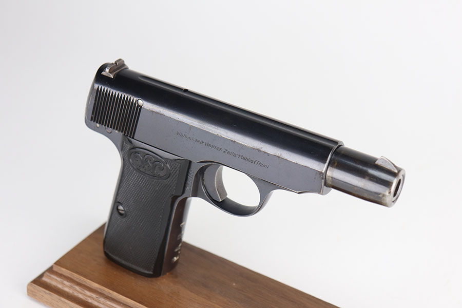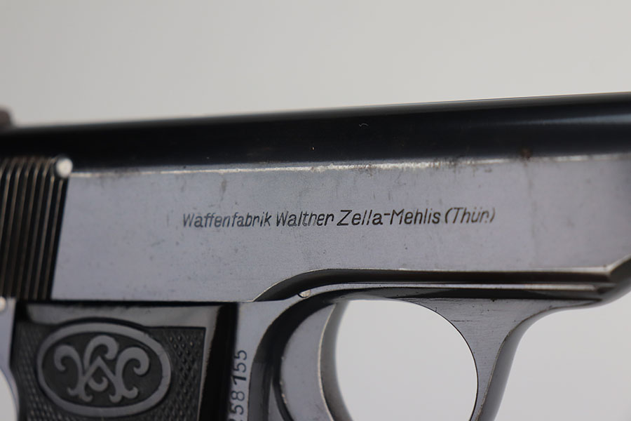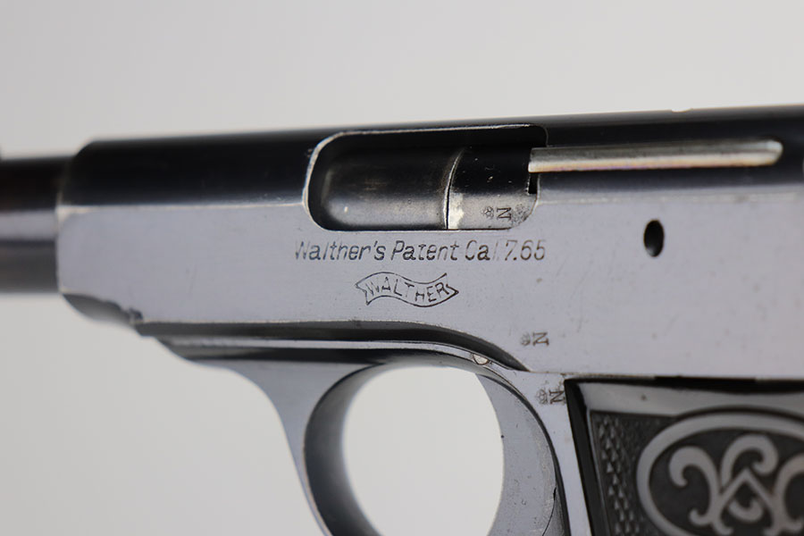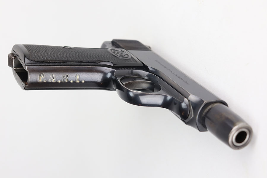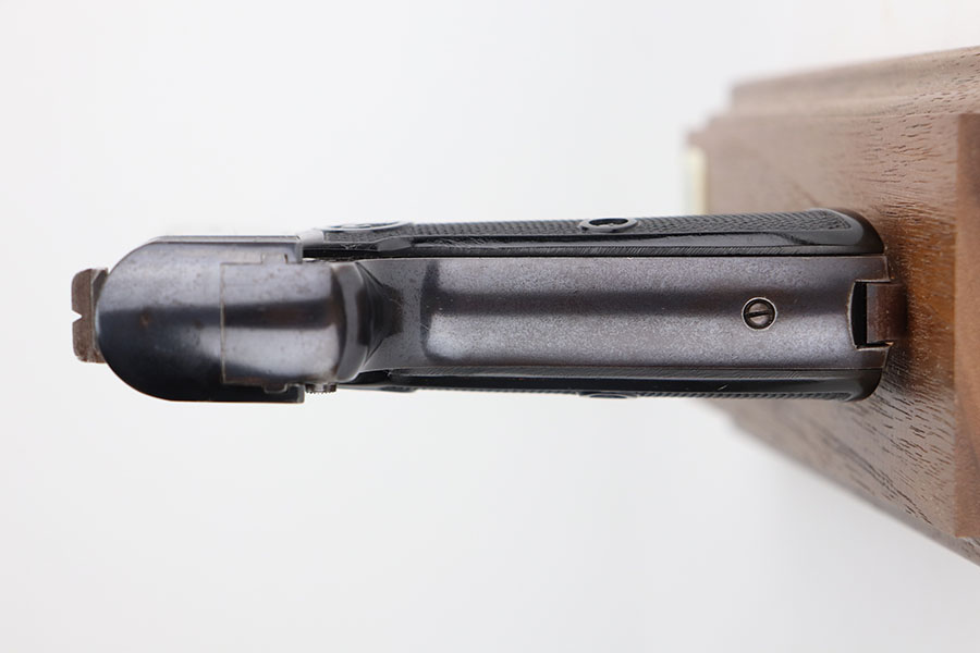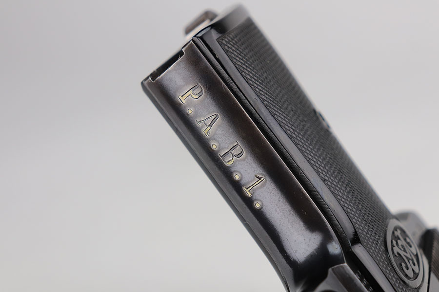 7/27/21 – This is a nice, original example of a Walther Model 4 with a unit marking on the front strap that reads ‘P.A.B.1’. Our best guess is it’s a police marking but we could not find a direct reference for it. The original blue rates over 90% with high edge wear on slide, and a little freckling on the right side of the slide. There is also some patina/oxidation on the straps. Bore is shiny with good rifling but a little frost in the grooves. The grips are nice except for a small crack in the left panel. The listing also includes the display stand in the photos.