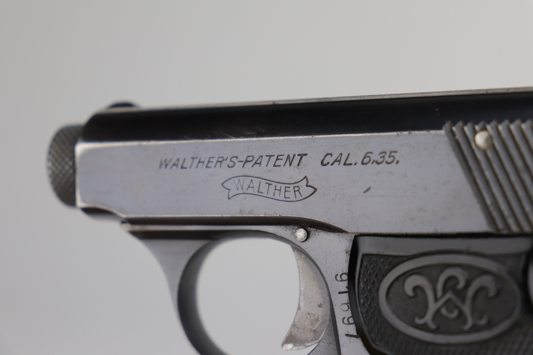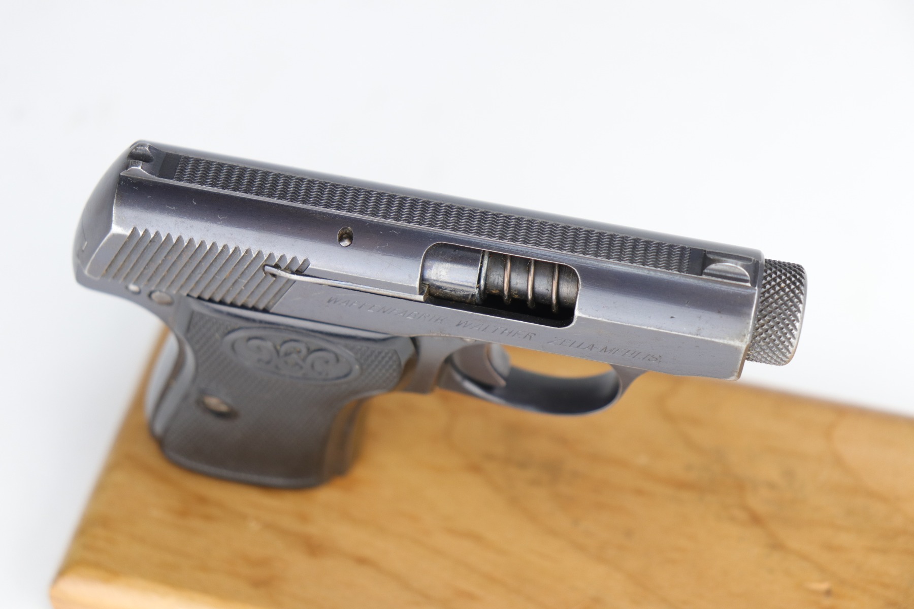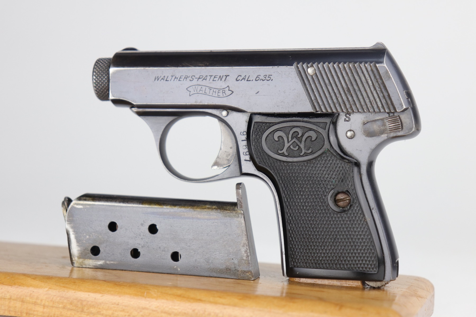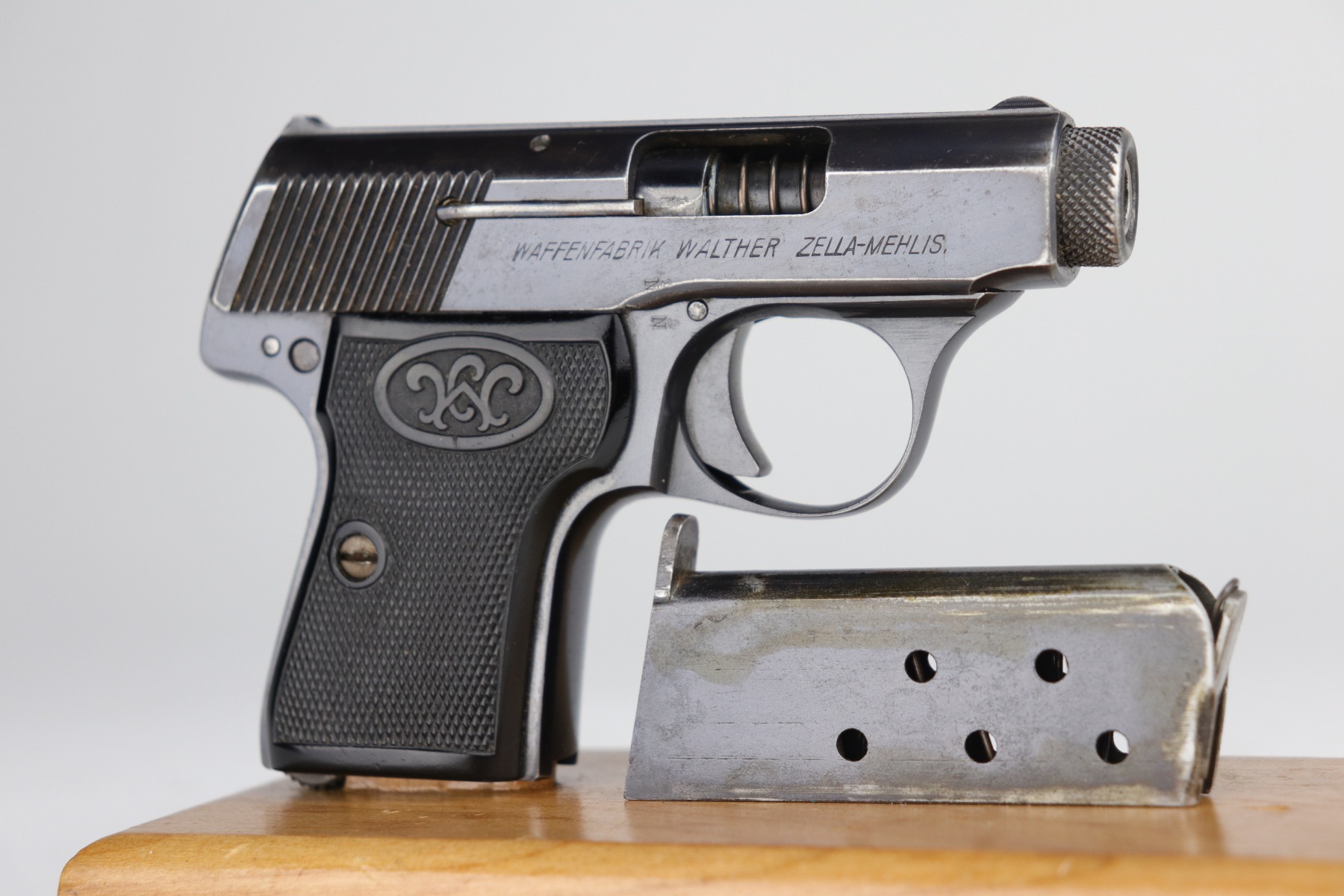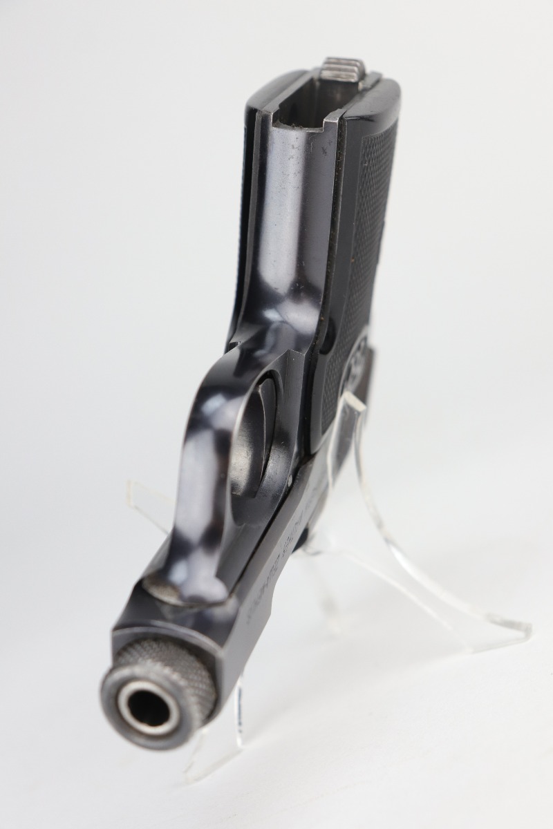 9/10/20 – This is an original, 2nd variation, Walther Model 5 pistol, chambered in .25 caliber. This gun is in excellent condition, retaining around 96% of its original bluing. There is general minor muzzle and high edge wear on the slide. There are a few very light scratches and handling marks on the left side of the slide. There is very minor freckling on both sides of the slide and on the straps. There is one spot of discoloration on the very front edge of the frame. Excellent, original grips. It comes with one period-correct holster and a custom, modified leather holster. The bore is excellent – strong rifling.