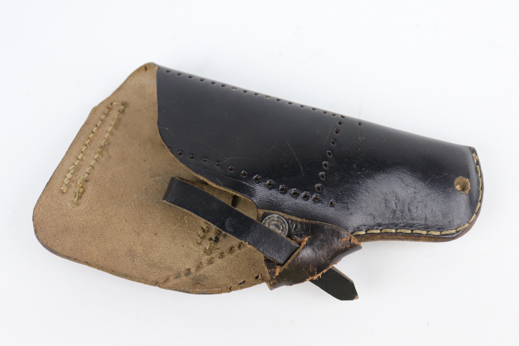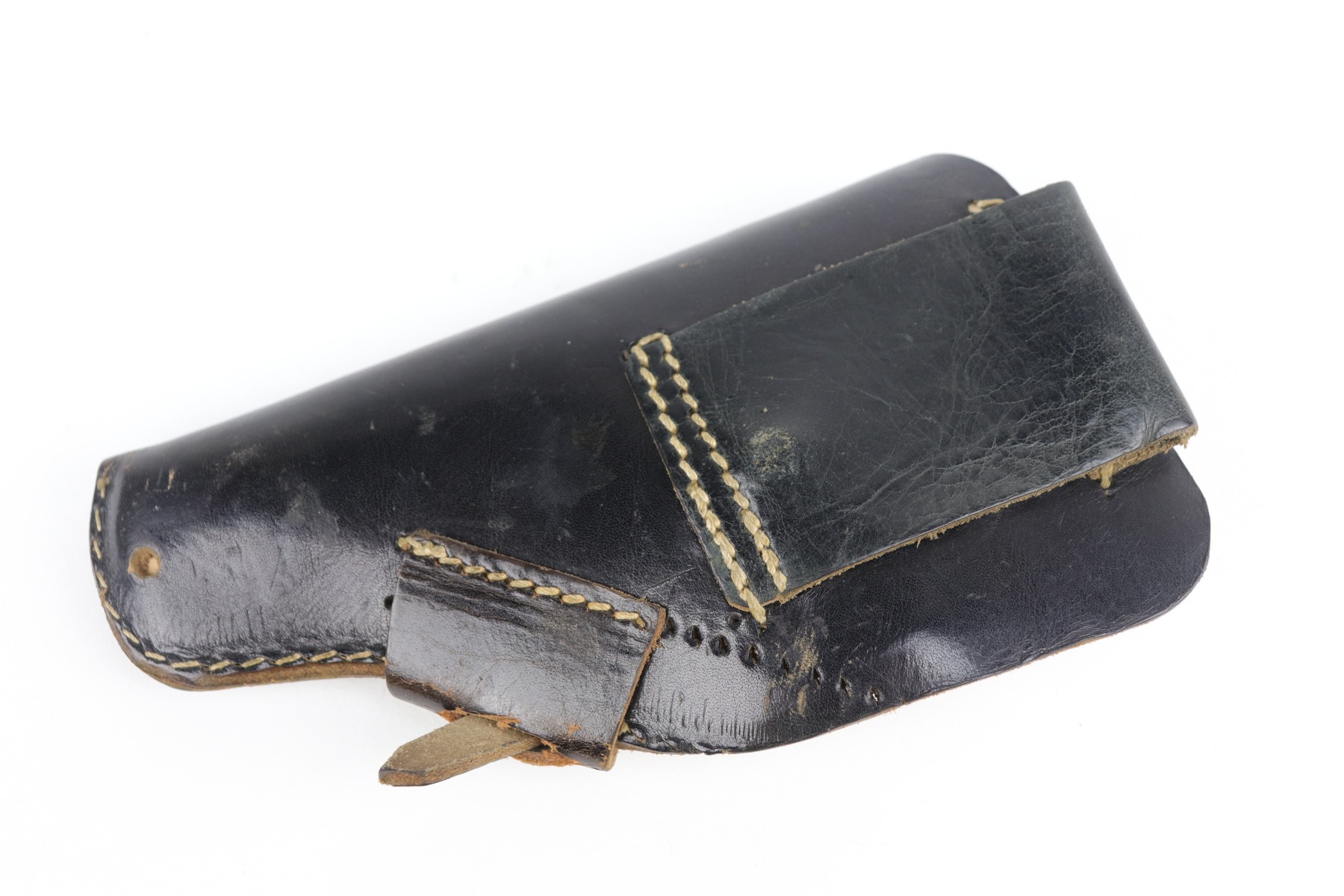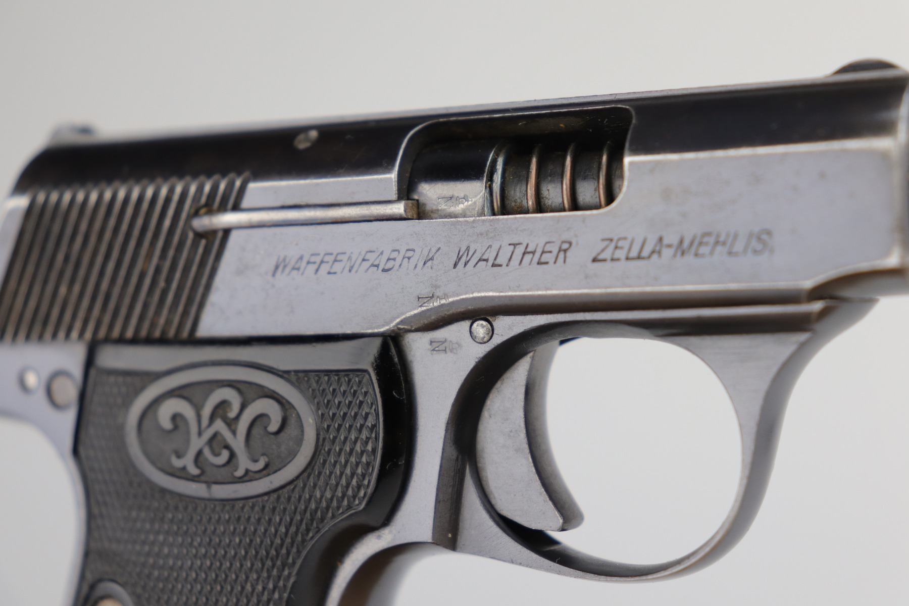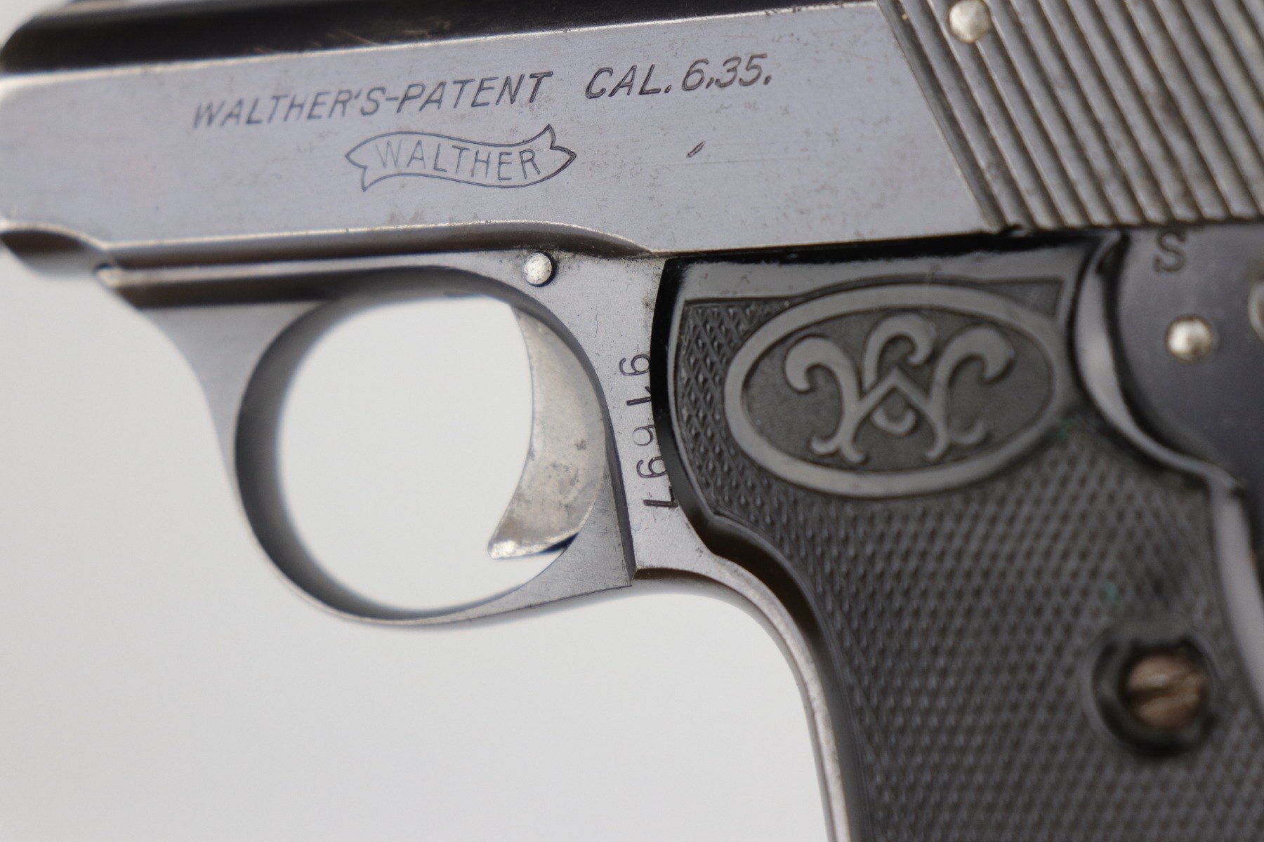9/10/20 – This is an original, 2nd variation, Walther Model 5 pistol, chambered in .25 caliber. This gun is in excellent condition, retaining around 96% of its original bluing. There is general minor muzzle and high edge wear on the slide. There are a few very light scratches and handling marks on the left side of the slide. There is very minor freckling on both sides of the slide and on the straps. There is one spot of discoloration on the very front edge of the frame. Excellent, original grips. It comes with one period-correct holster and a custom, modified leather holster. The bore is excellent – strong rifling.