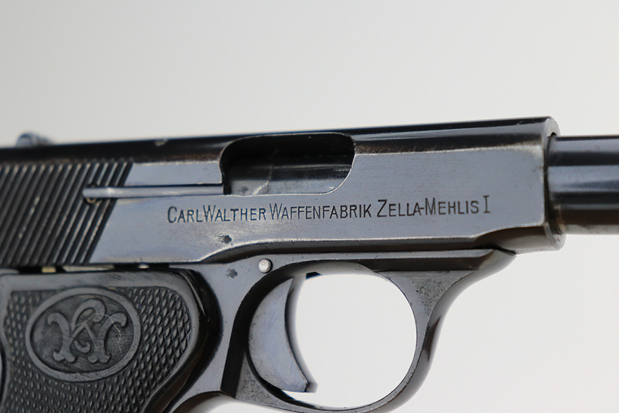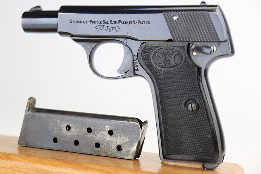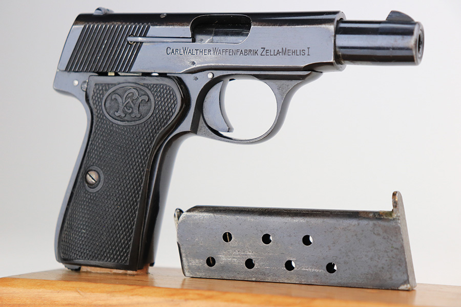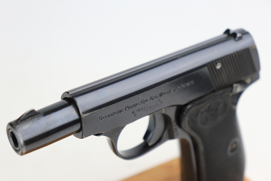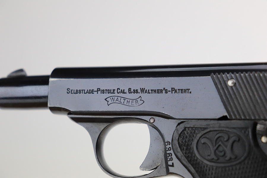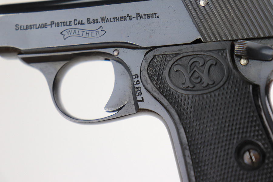 4/22/22 – This is a very nice example of a 2nd-variation Walther Model 7 manufactured in the late 1910’s. The gun is all matching and has the proper “Crown N” commercial proofs. It has retained about 94% of its original finish. Most of the wear is on the right side of the slide where there is an area of thinning. Very minor wear around the high edges of the slide and around the muzzle. There are very slight dimples in the metal at the very front of both sides of the slide. Comes with nice period-correct horn grips (one very tiny crack on the bottom edge of the right panel). Also comes with a proper magazine. The bore has great rifling, but there are tiny pits throughout.