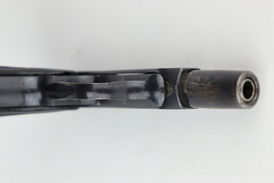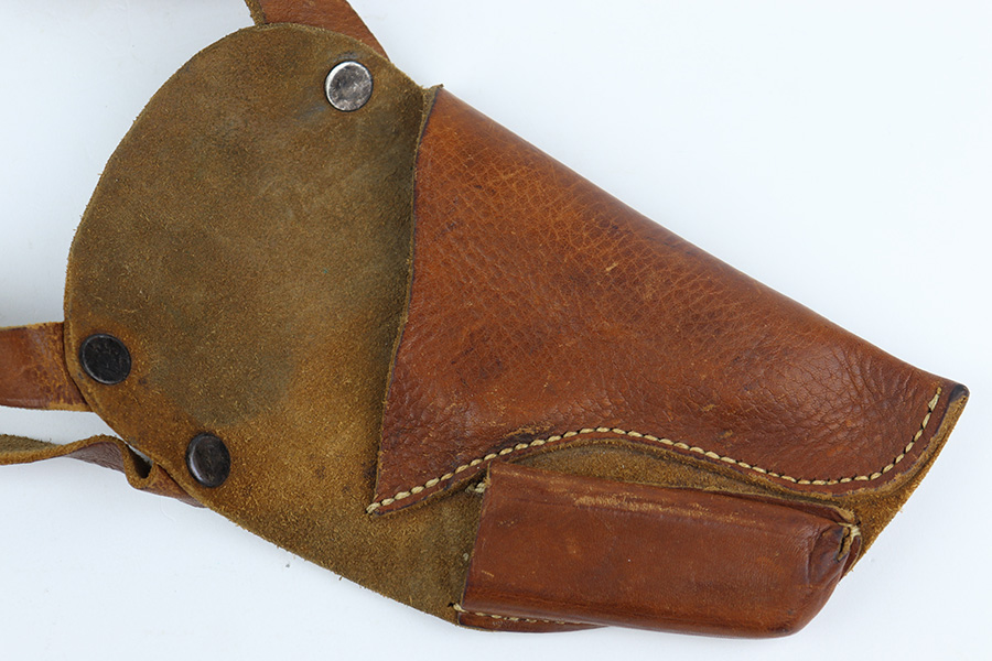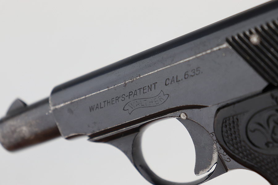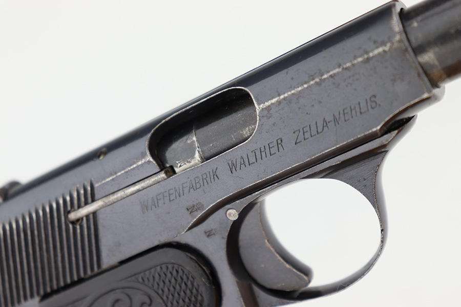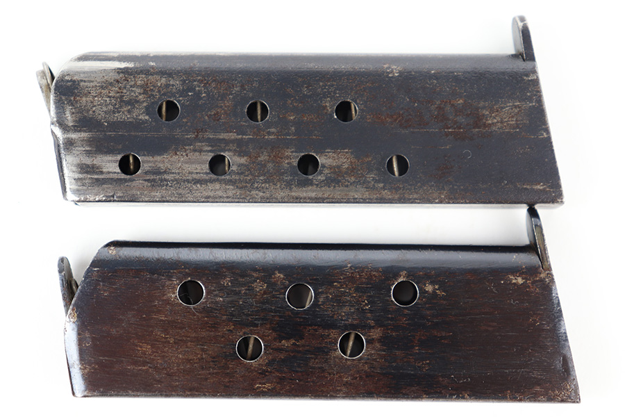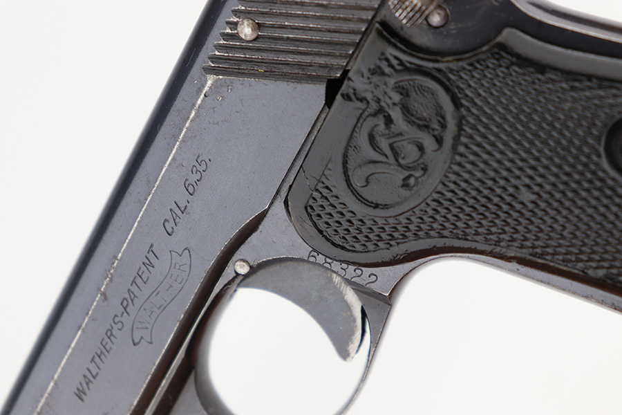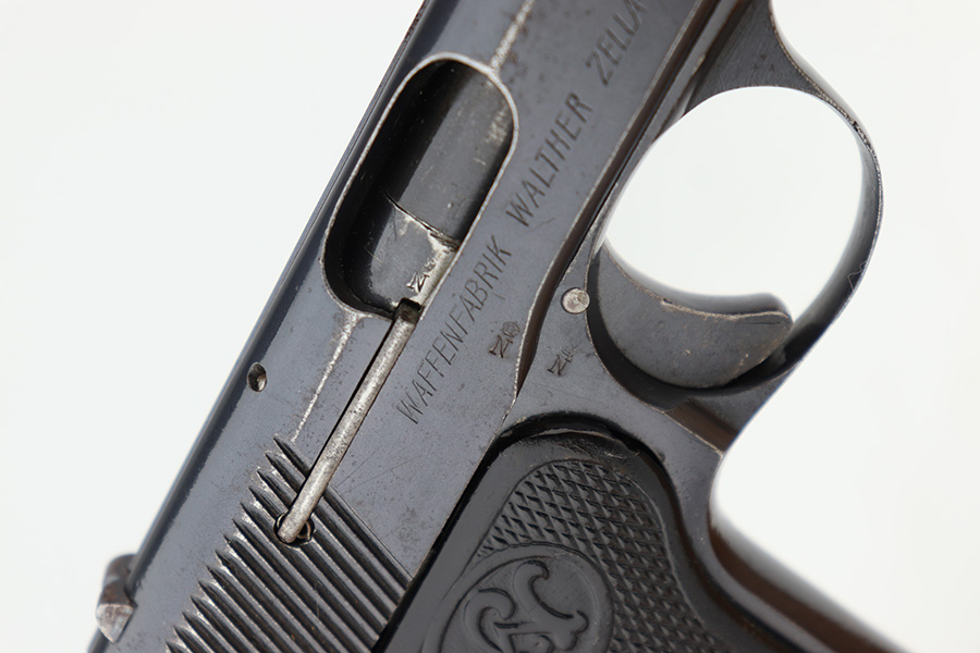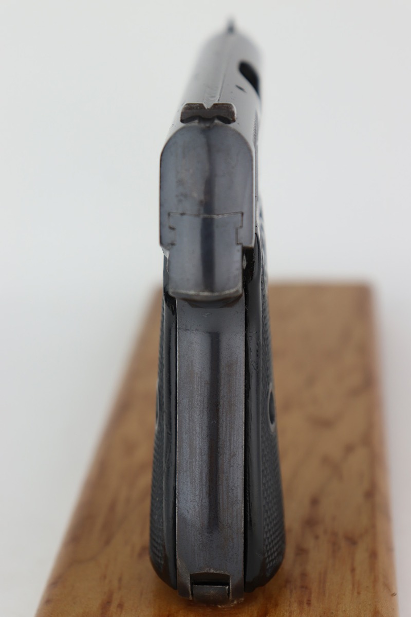 12/1/22 – This is a very nice example of a Walther Model 7 manufactured in about 1915-1919. This is one of the later 3rd variation examples, characterized by the “Walther-Patent Cal. 6.35.” slide legend. It is all matching and has the proper “Crown N” proofs. It comes as a rig with two proper magazines and a generic tan leather shoulder holster that fits the gun well. The gun itself has retained about 94% of its original bluing. The majority of the finish loss is around the muzzle, where there is also come light spotty oxidation. Minor wear on the high edges of the slide. Very minor, somewhat scratchy wear on the grip straps and a few small pits on the front strap. A tiny ding in the metal on the left side of the slide. Comes with period-correct hard rubber grips – small divots on both sides and a hairline crack on the left side. Excellent bore with strong rifling.