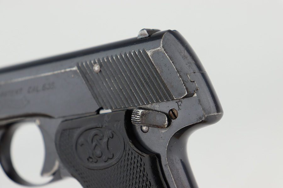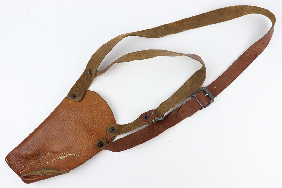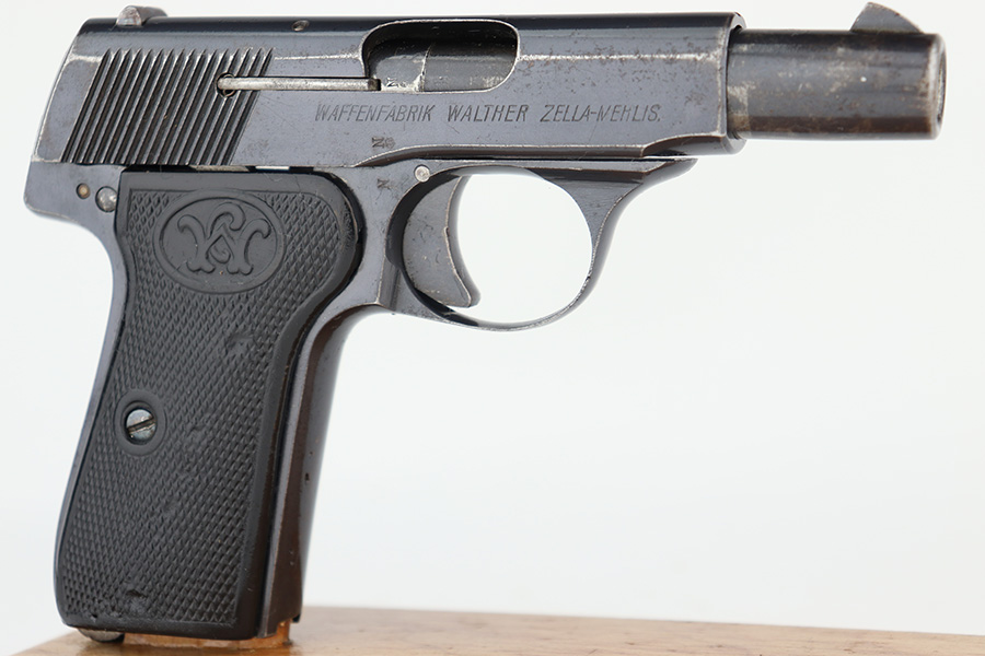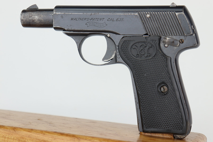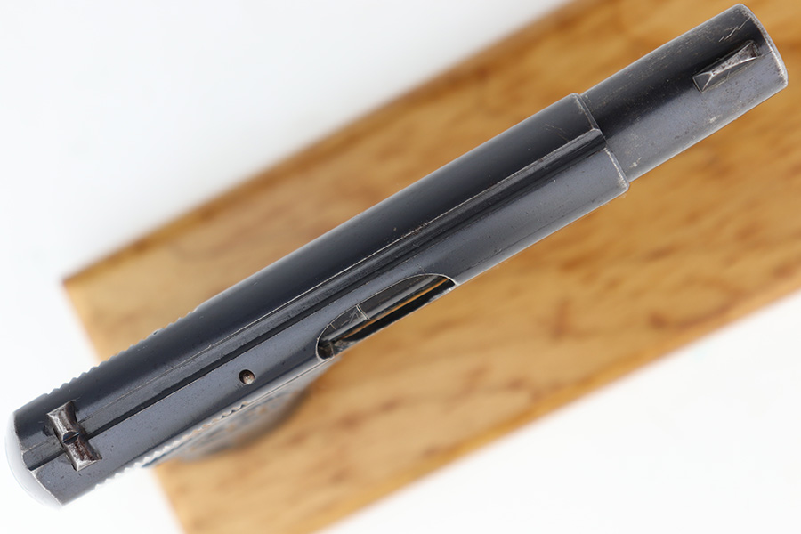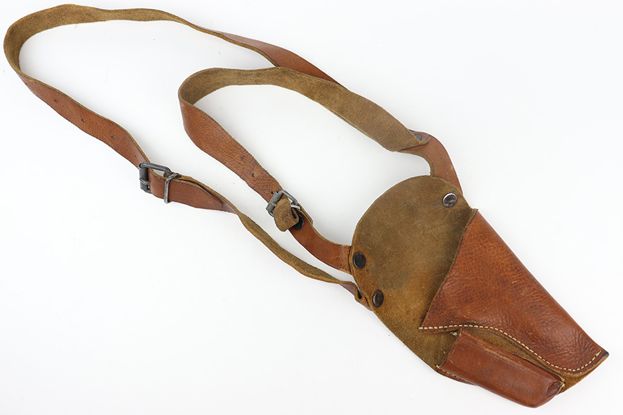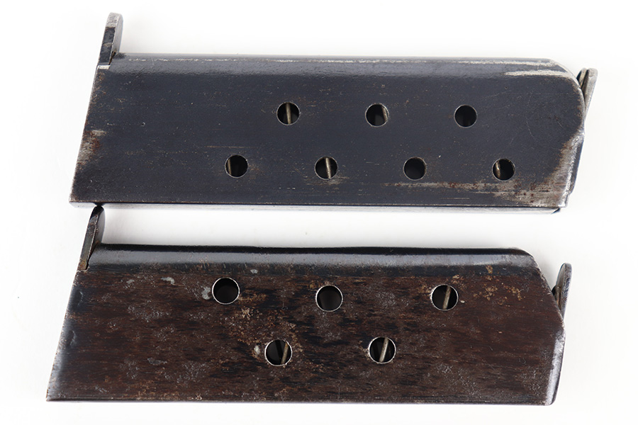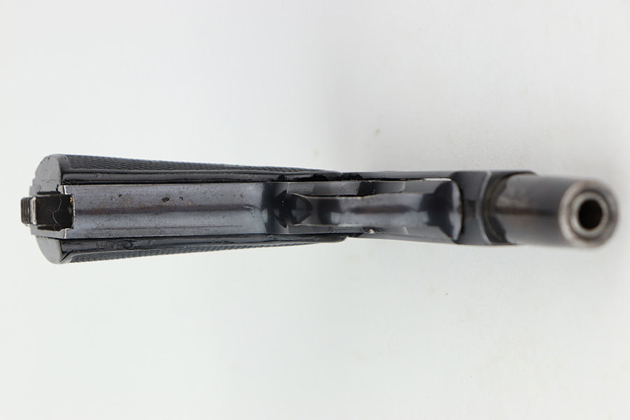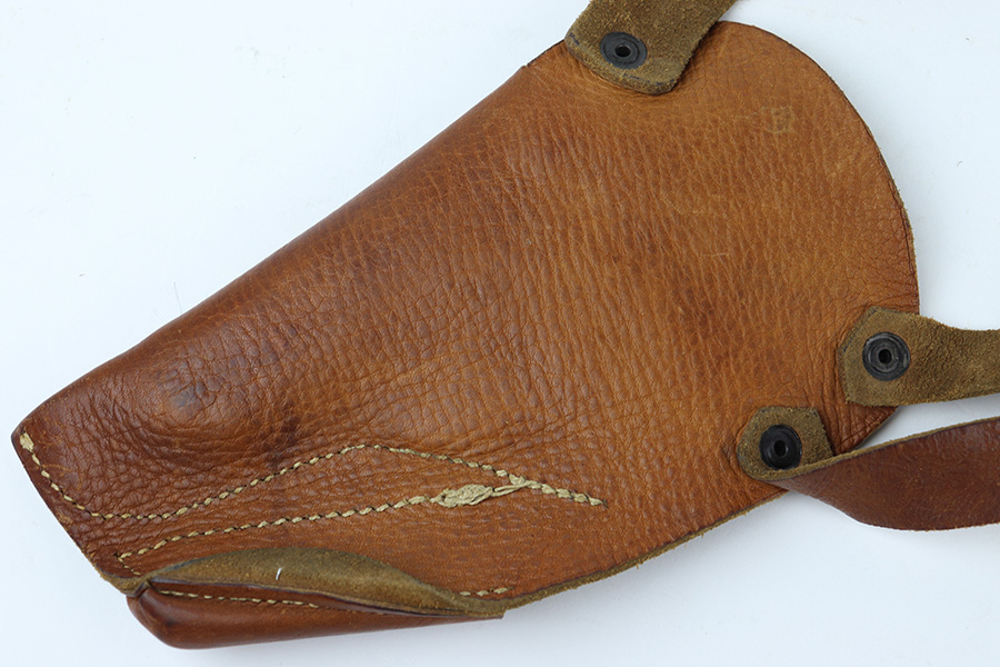 12/1/22 – This is a very nice example of a Walther Model 7 manufactured in about 1915-1919. This is one of the later 3rd variation examples, characterized by the “Walther-Patent Cal. 6.35.” slide legend. It is all matching and has the proper “Crown N” proofs. It comes as a rig with two proper magazines and a generic tan leather shoulder holster that fits the gun well. The gun itself has retained about 94% of its original bluing. The majority of the finish loss is around the muzzle, where there is also come light spotty oxidation. Minor wear on the high edges of the slide. Very minor, somewhat scratchy wear on the grip straps and a few small pits on the front strap. A tiny ding in the metal on the left side of the slide. Comes with period-correct hard rubber grips – small divots on both sides and a hairline crack on the left side. Excellent bore with strong rifling.