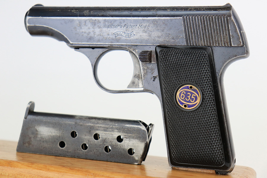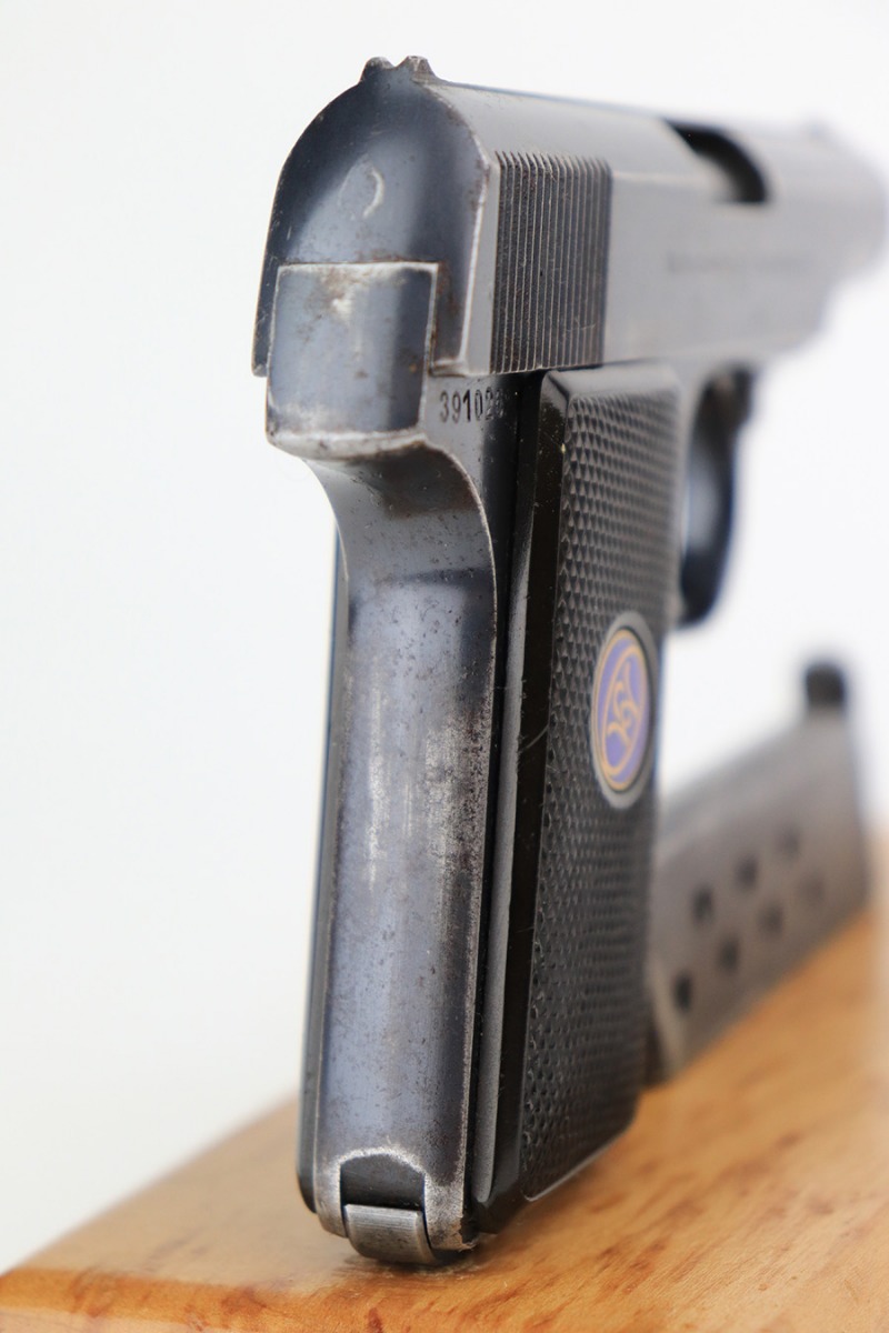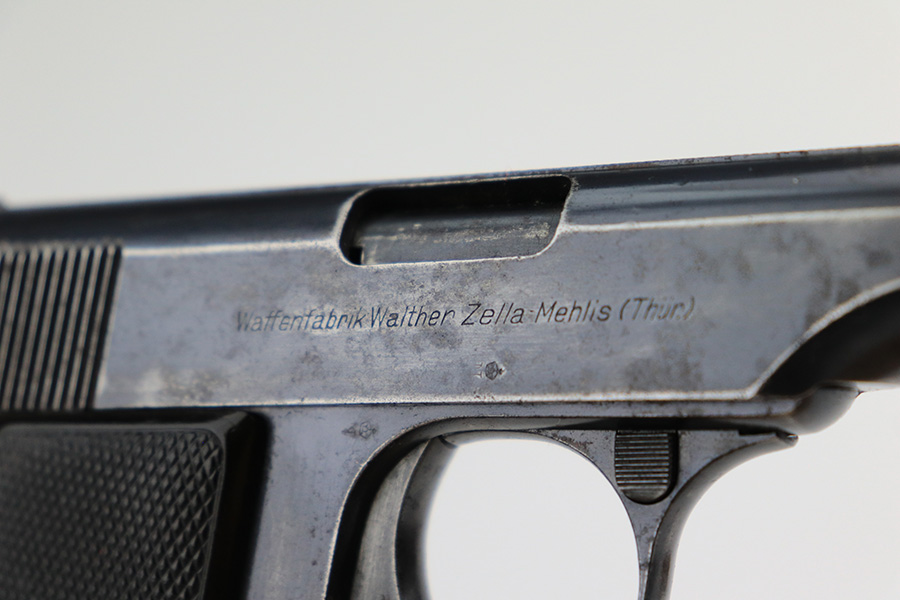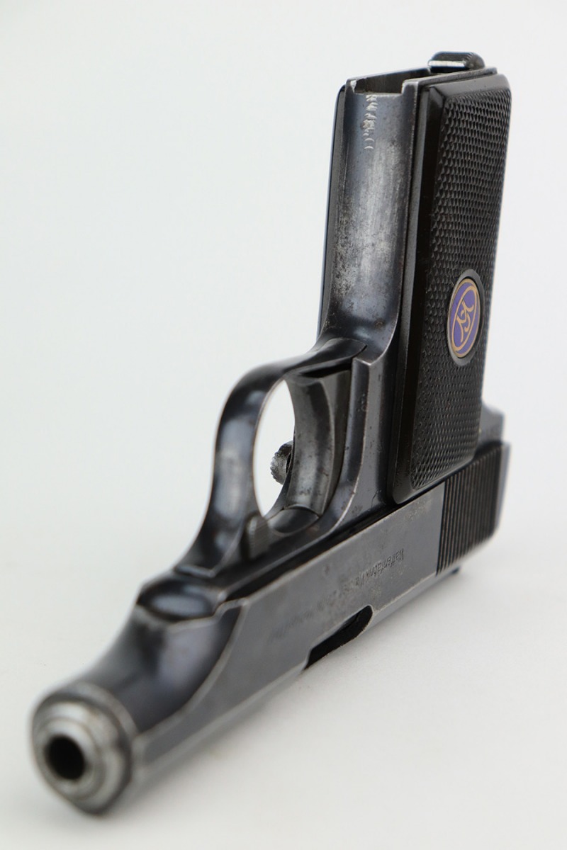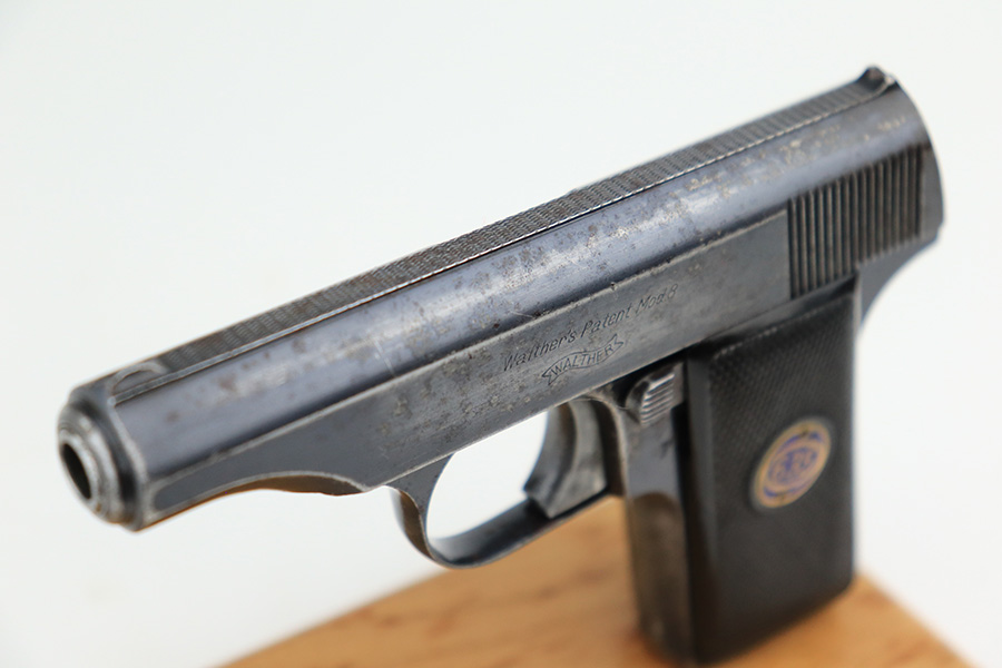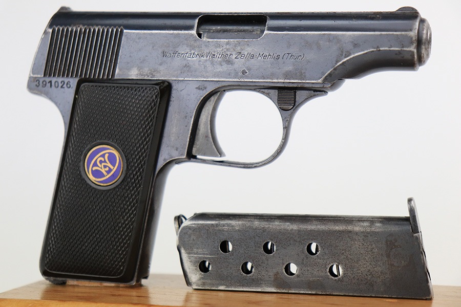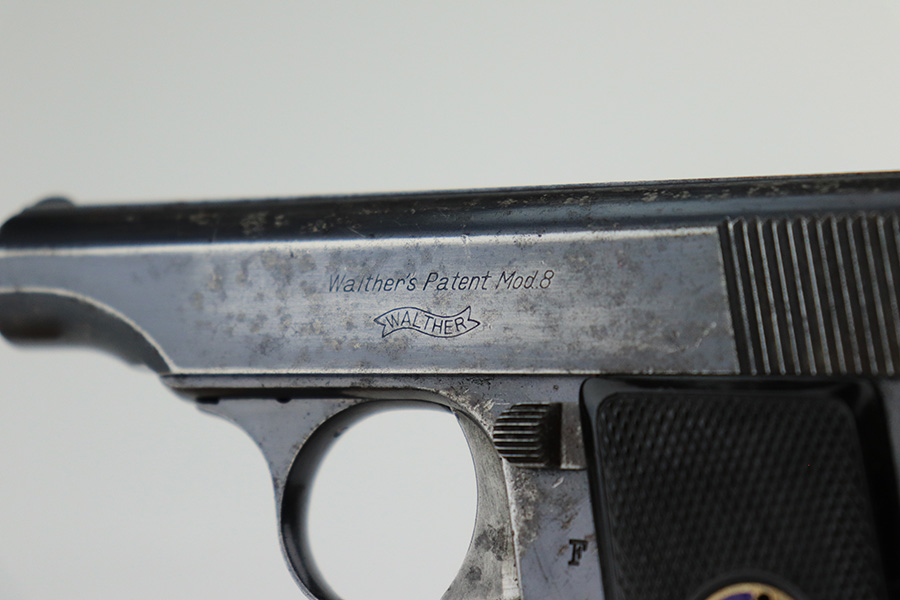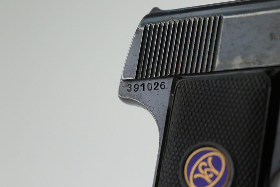 6/2/22 – This is a nice example of a First Variation Walther Model 8 manufactured in the 1920’s. It is all matching and has the proper “Crown N” commercial proofs. This is an early example, as the serial numbers started at 390000. It has retained roughly 75% of its original finish. There is thinning on both sides of the slide and on both grip straps. There is also noticeable spotty discoloration and oxidation throughout, most noticeable on the slide. A series of small dings on the front strap. Comes with nice period-correct grips and a proper “large W” magazine. The bore has almost no rifling left, and there is heavy pitting throughout.