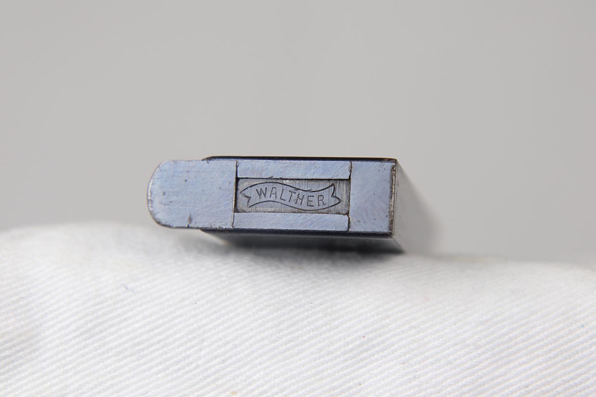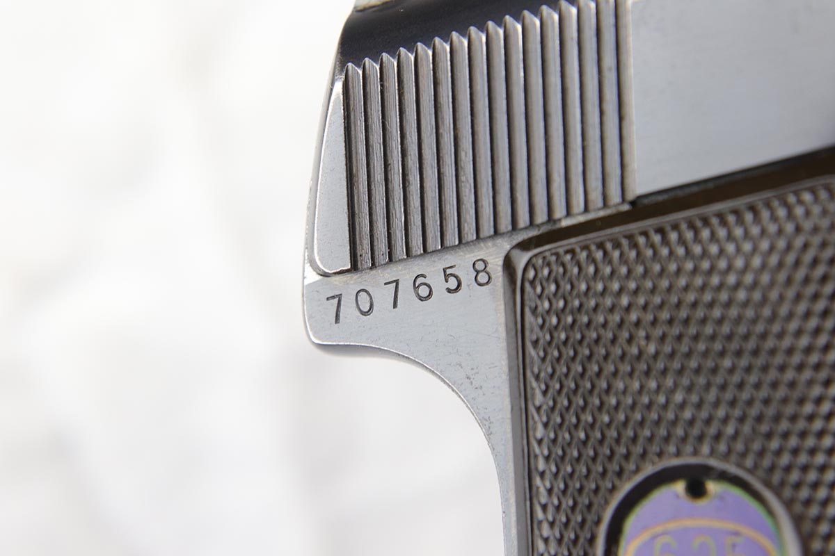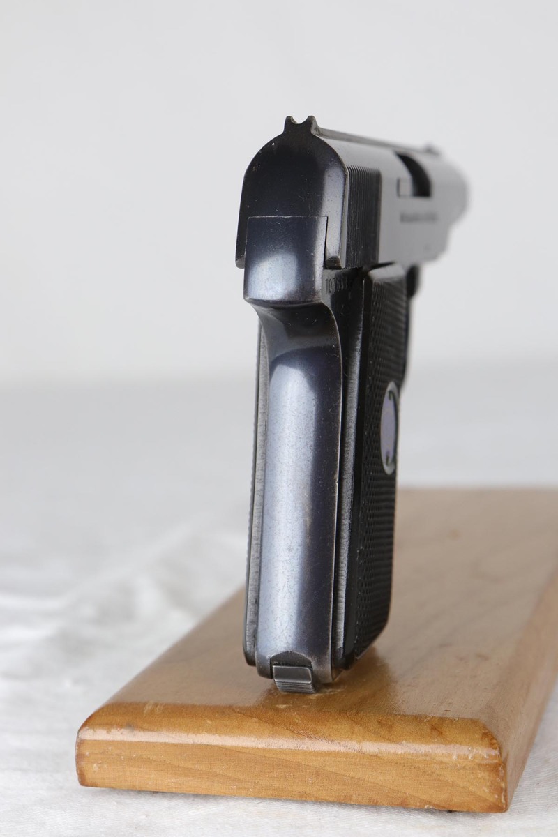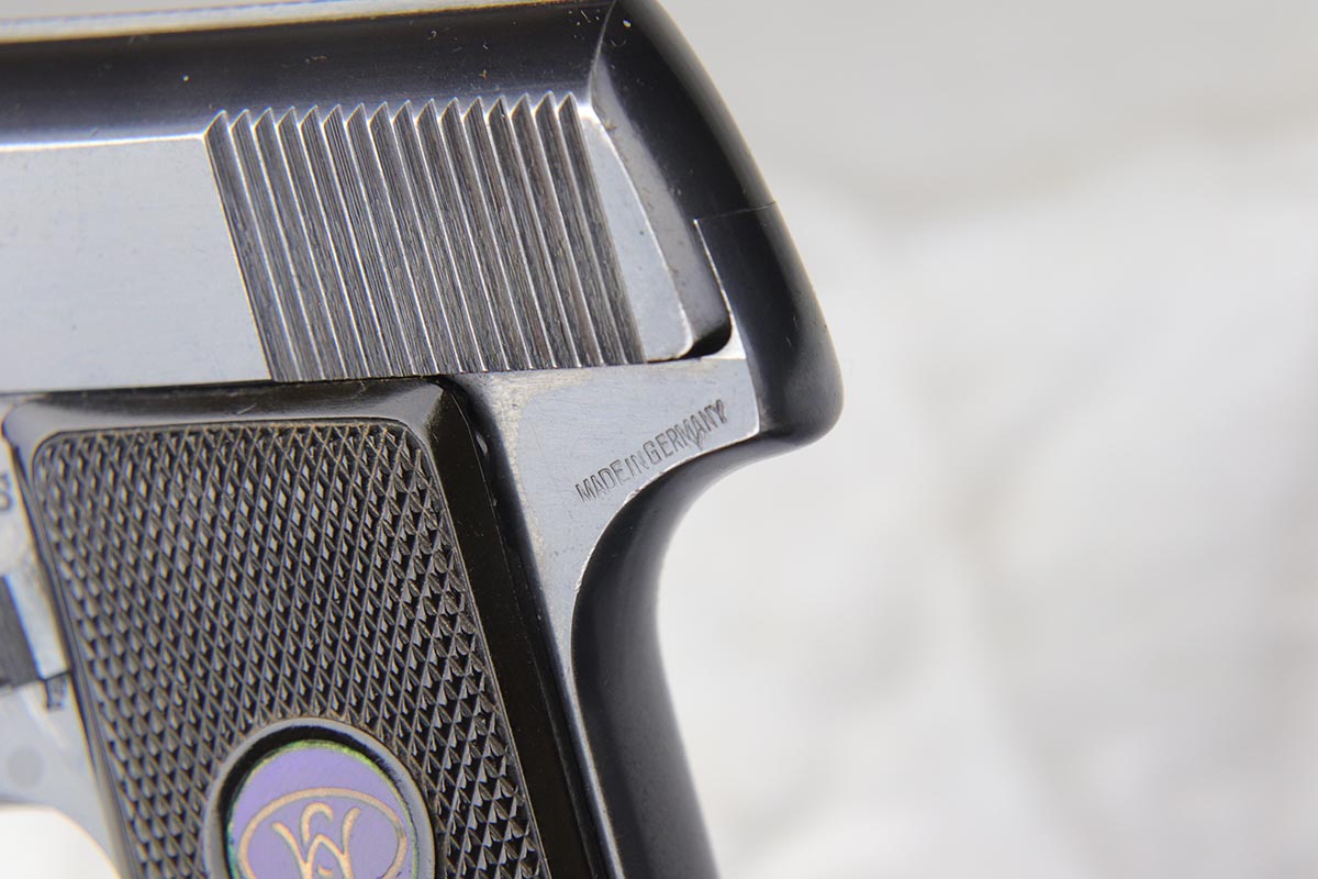 4/2/18 – This is a 2nd variation Model 8 in all original and matching condition.  The serial number is 7076xx.  Only about 14,000 of this particular model were made between 1927 and 1930.   The original finish is in about 97-98% condition with high edge thinning.  The gun comes with black plastic grips marked 6.35 on one side and W on the other.  There are no scratches on the disc that usually happen when someone tries to remove the grips with the wrong tool.  It comes with an original Walther banner magazine that holds 8 rounds.    The right side of the frame and slide are crown/N marked.  The left side is marked for export to the commercial market – most likely the US.  The inside of the slide has the matching last 3 digits of the serial number.  Excellent bore.