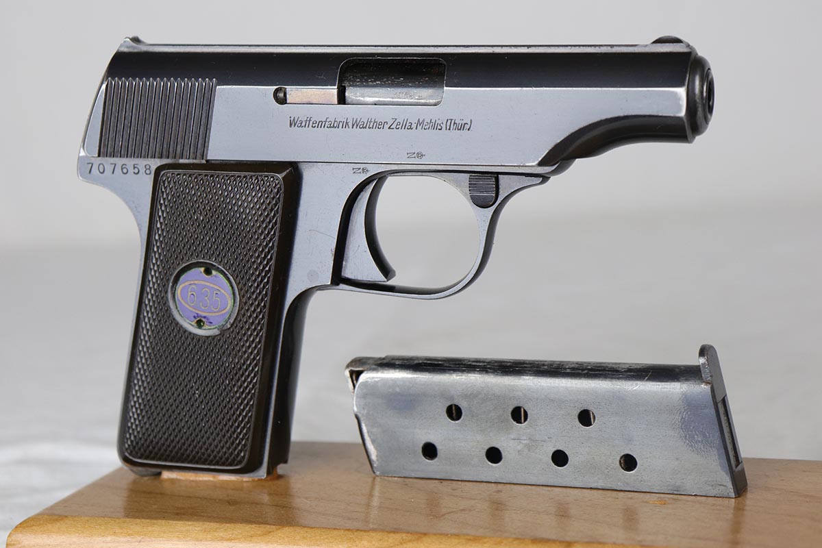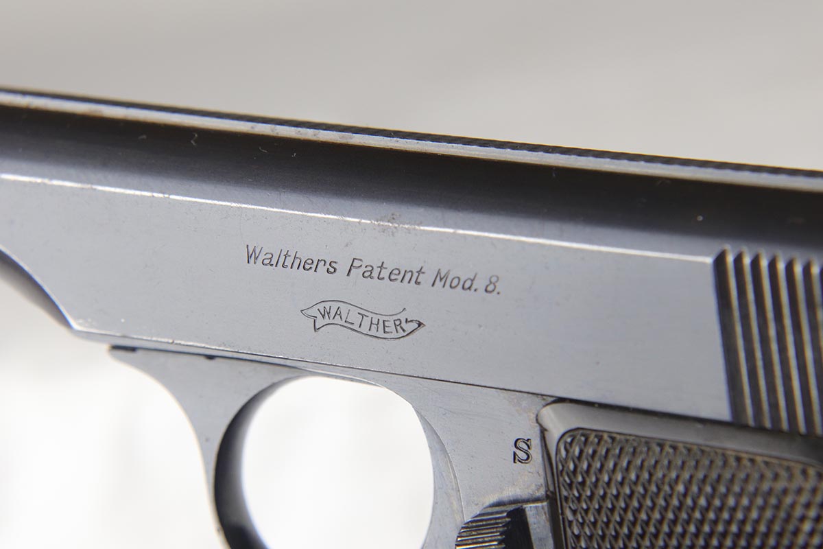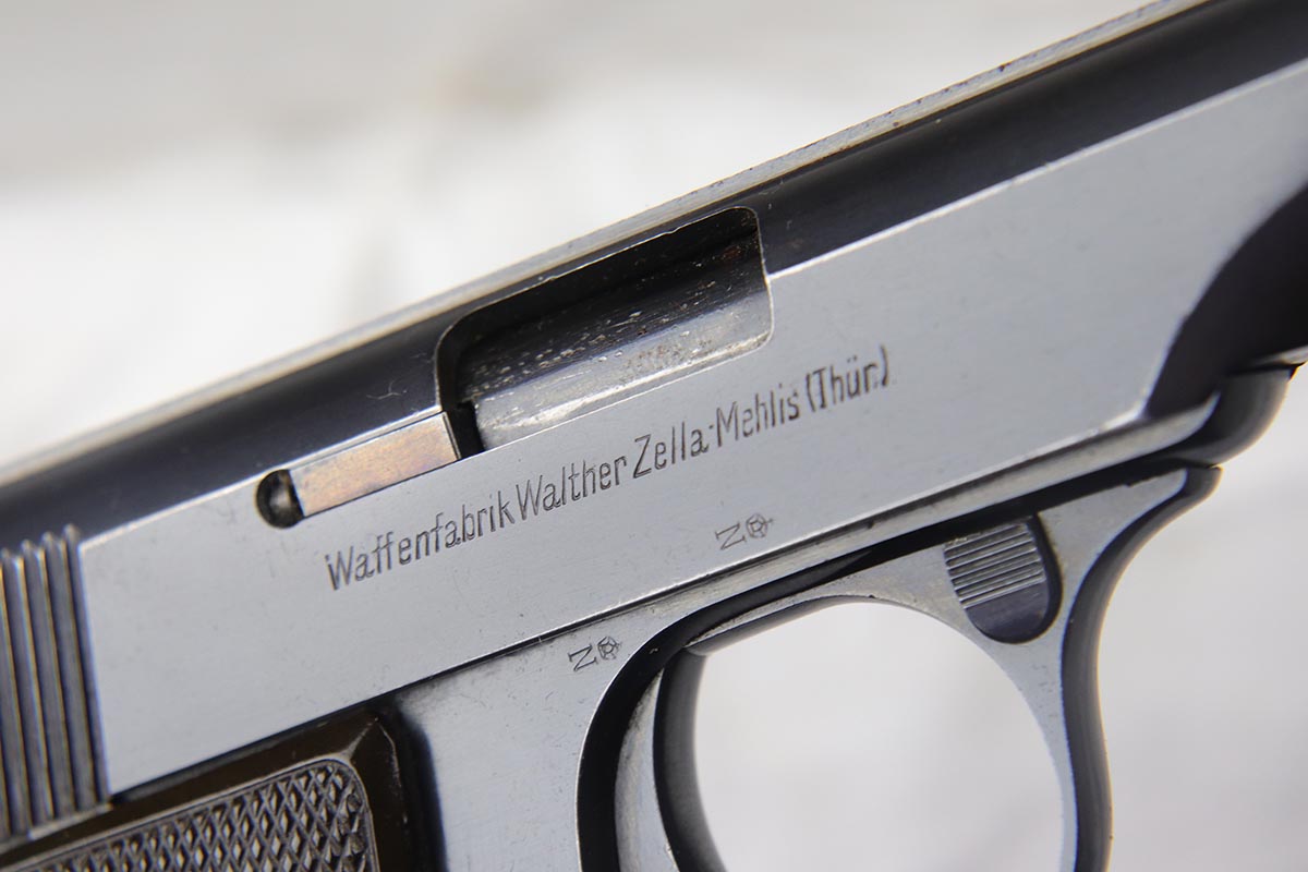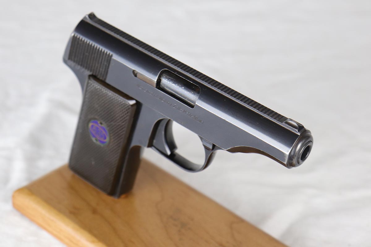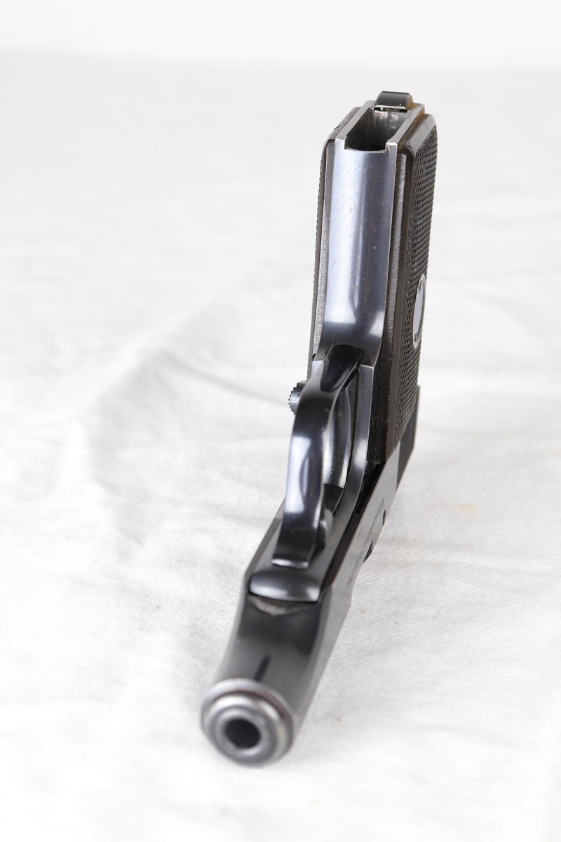 4/2/18 – This is a 2nd variation Model 8 in all original and matching condition.  The serial number is 7076xx.  Only about 14,000 of this particular model were made between 1927 and 1930.   The original finish is in about 97-98% condition with high edge thinning.  The gun comes with black plastic grips marked 6.35 on one side and W on the other.  There are no scratches on the disc that usually happen when someone tries to remove the grips with the wrong tool.  It comes with an original Walther banner magazine that holds 8 rounds.    The right side of the frame and slide are crown/N marked.  The left side is marked for export to the commercial market – most likely the US.  The inside of the slide has the matching last 3 digits of the serial number.  Excellent bore.