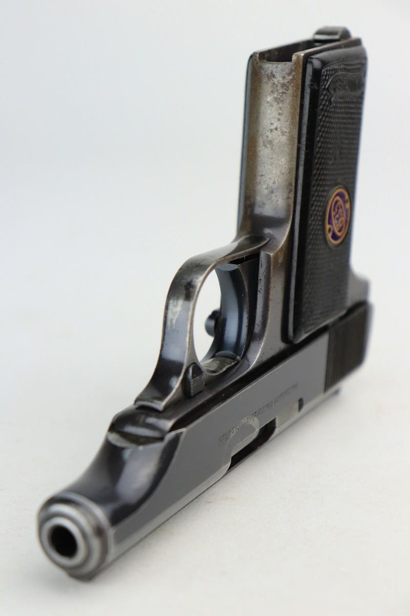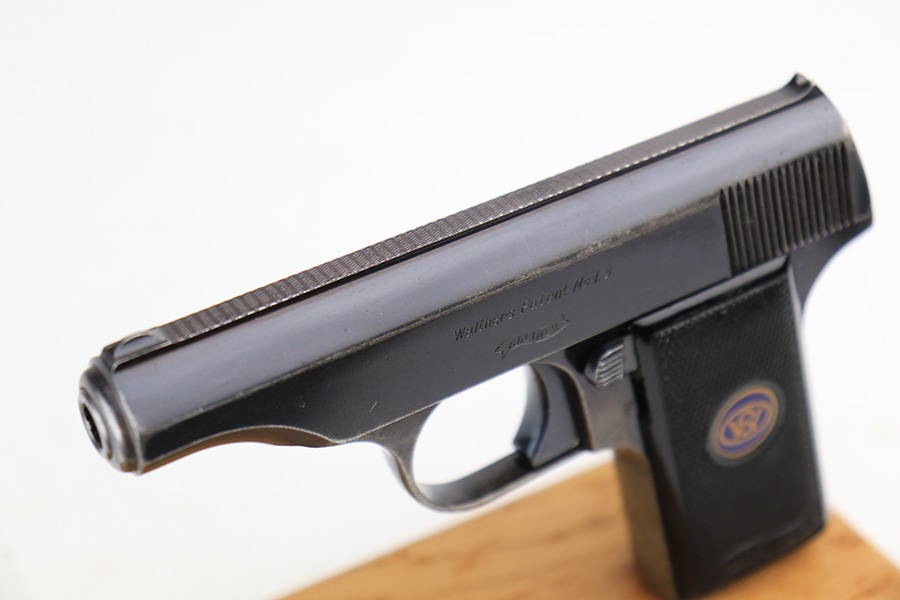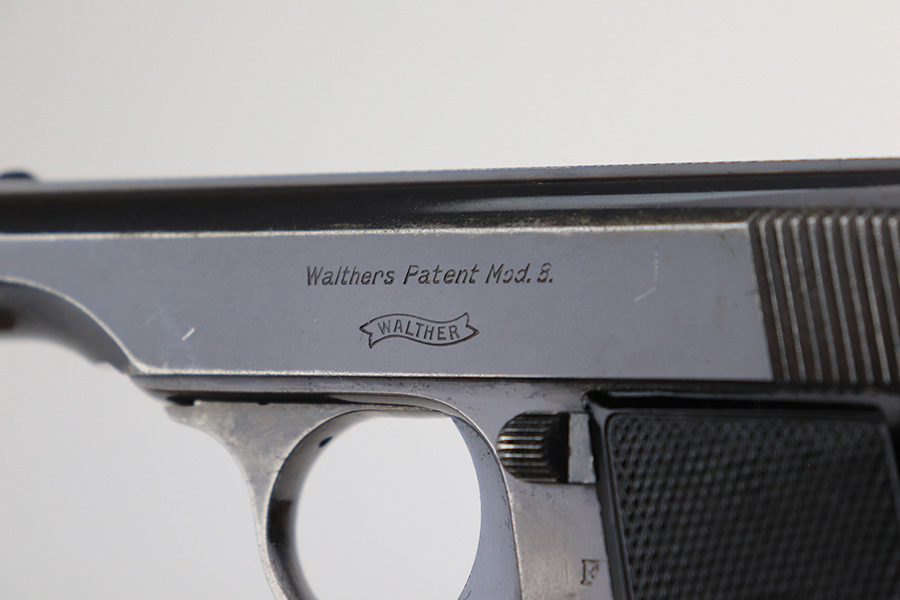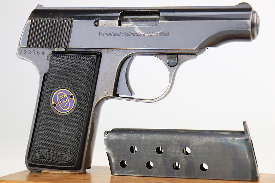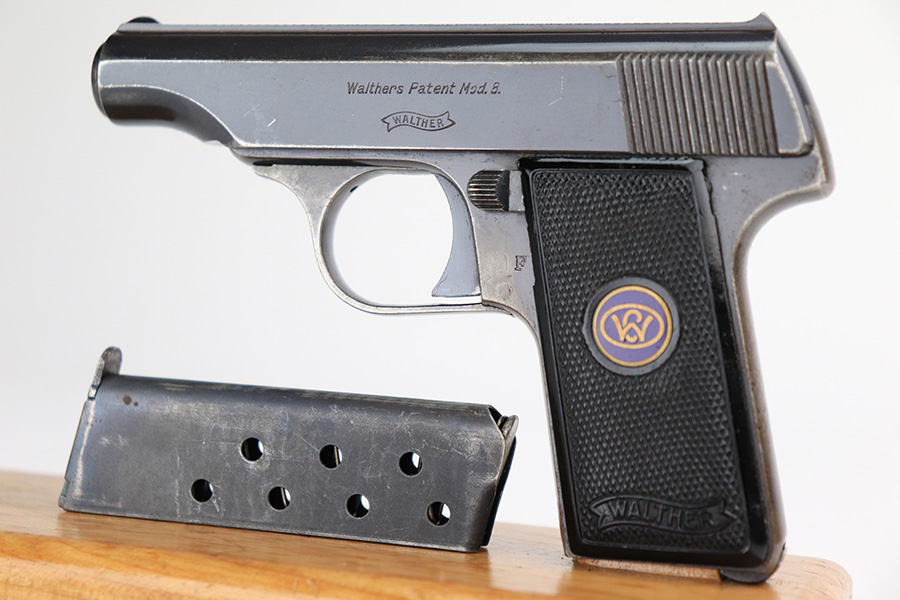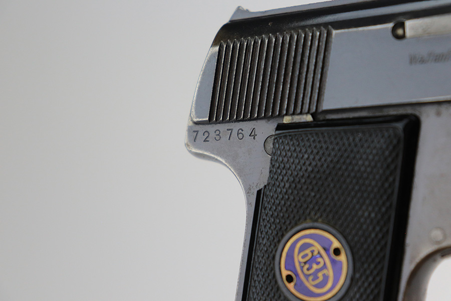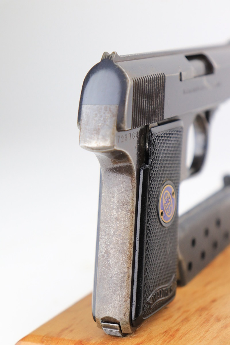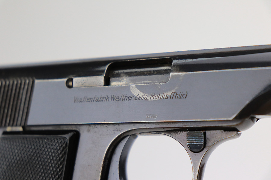 4/22/22 – This is a very nice example of a 2nd variation (2nd run) Walther Model 8 manufactured in 1932-33. The gun is all matching and has the proper commercial “Crown N” proofs. It has retained roughly 80-85% of its original finish. Most of the finish loss is on the grip straps, where there is also spotty brown patina. There are also areas of wear on the underside of the trigger guard and both sides of the frame. Minor wear on the high edges of the slide and one “ring” of wear on the right side of the slide. Comes with very nice grips and one magazine that does not have the Walther banner on the bottom. Minty bore.