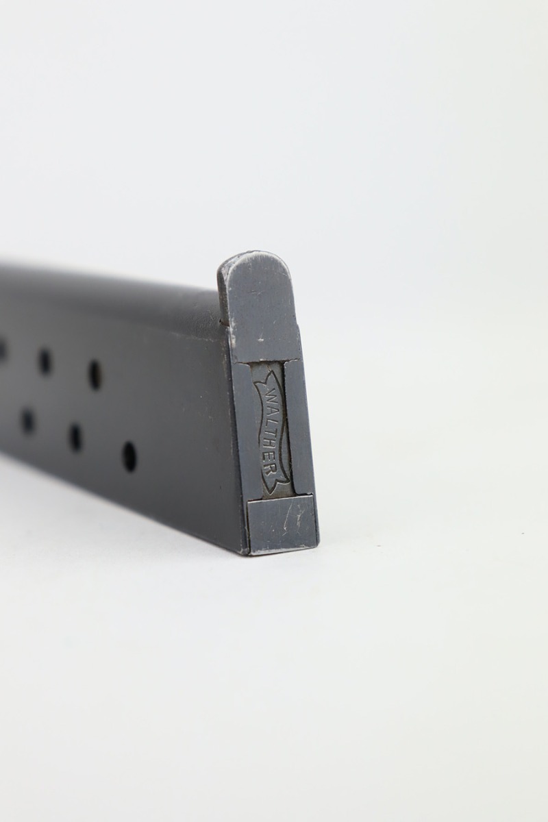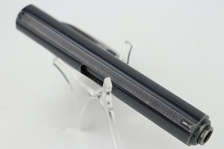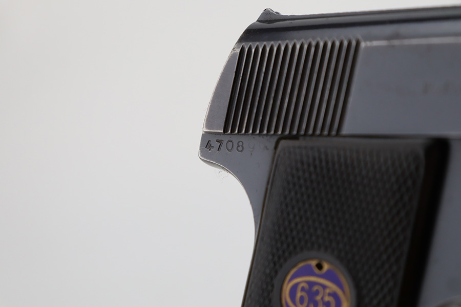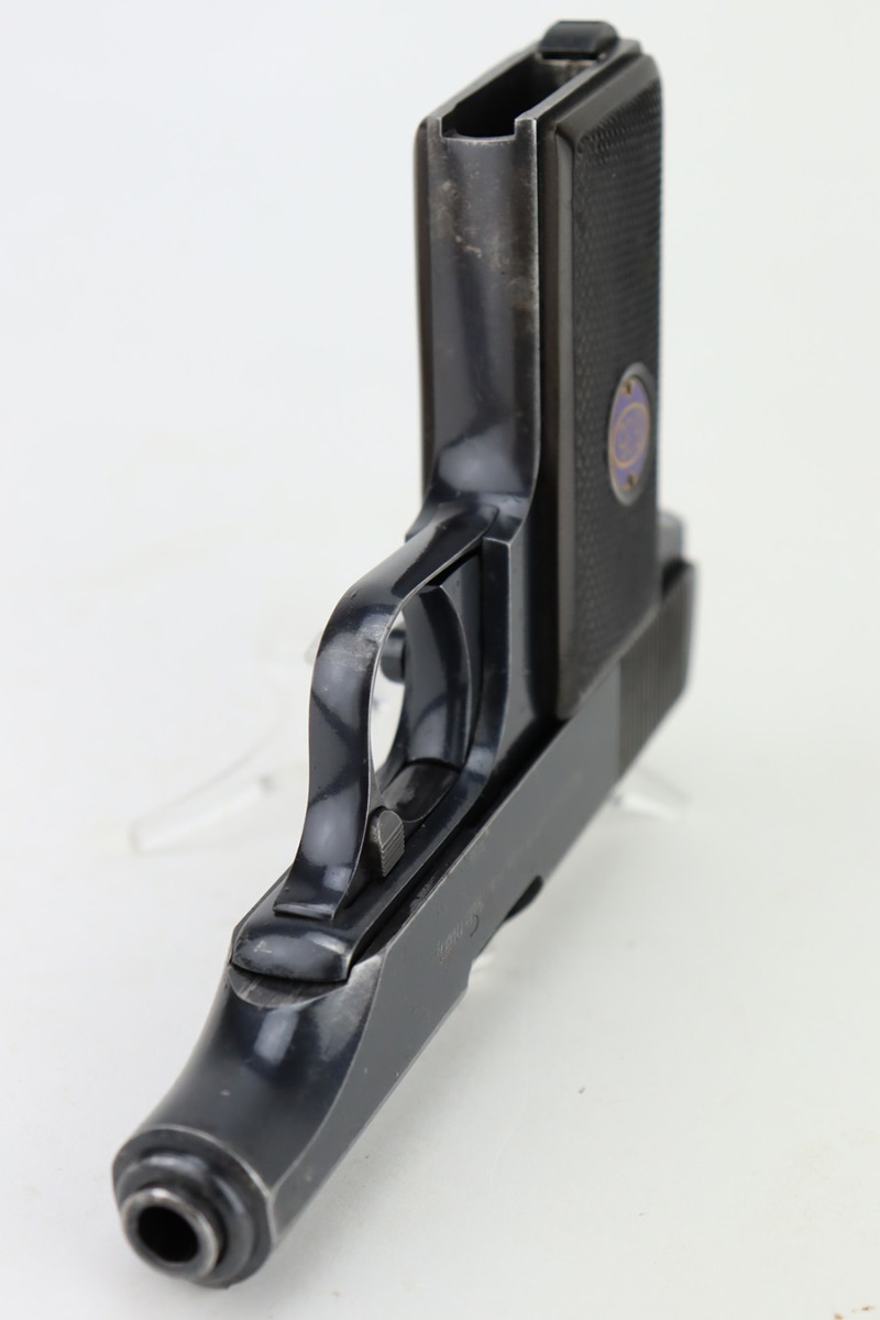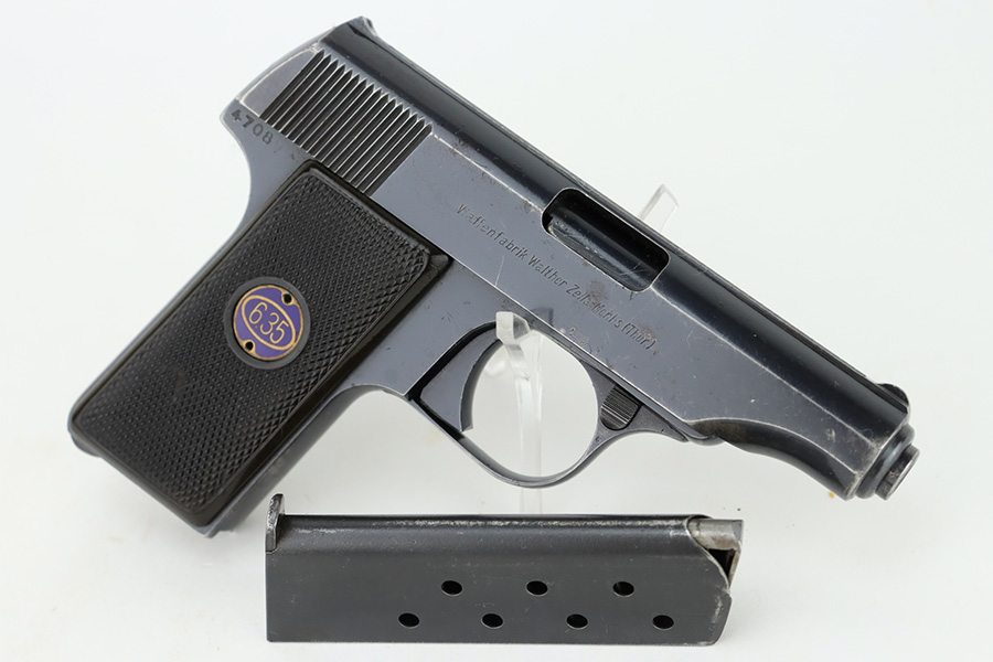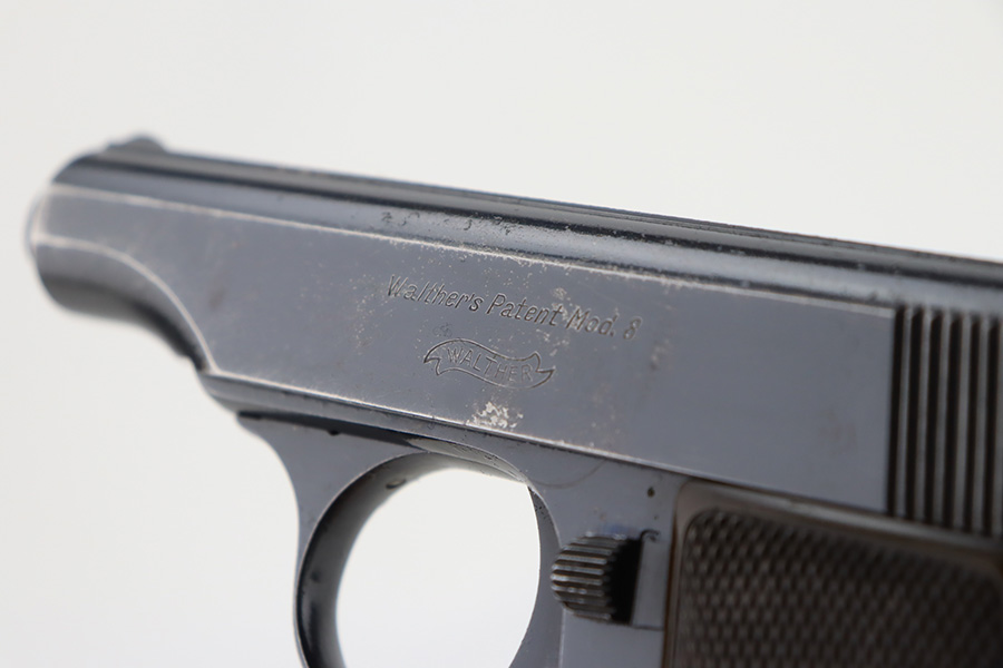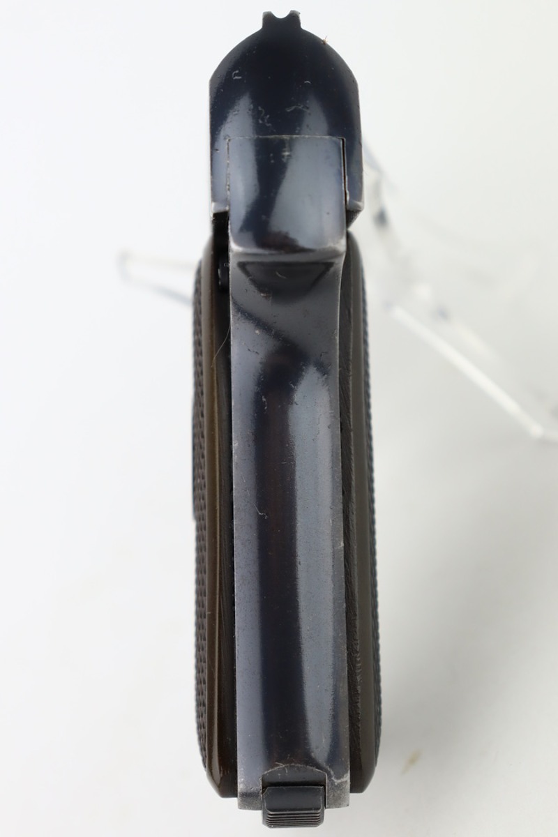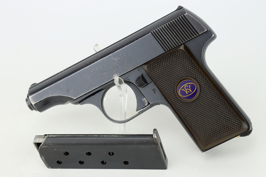 12/27/23 – This is a very nice Walther Model 8 sold in the commercial market in the 1920’s and chambered in 6.35mm. All matching and “Crown N” proofed. The original high polish finish rates about 93-94% with general high edge wear, some very light surface scratches here and there, and some very light freckling on the left side of the slide. Fitted with period-correct grips and comes with a Walther banner magazine. Excellent bore with strong rifling.