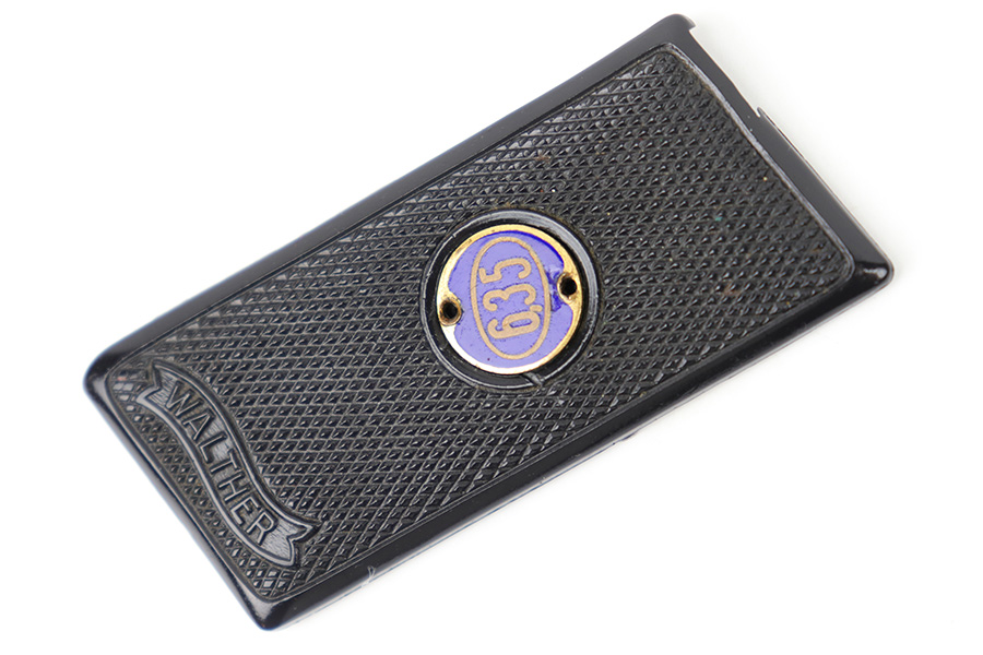 5/8/23 – This is an original pair of Walther model 8 pistol grips. The grips come complete with original screws / medallions as shown. No cracks or chips.