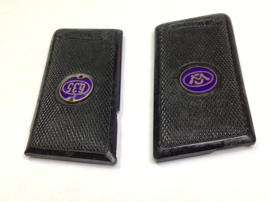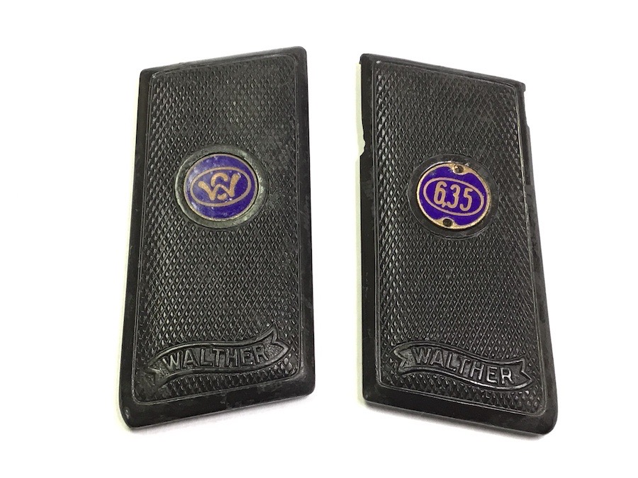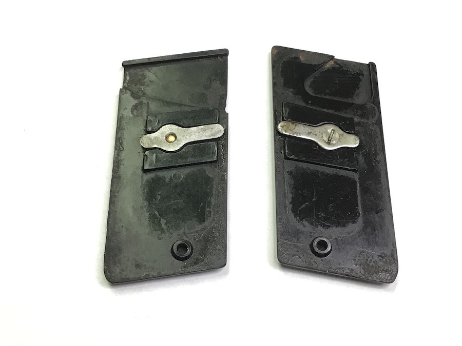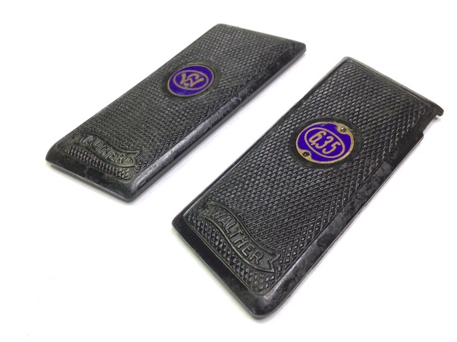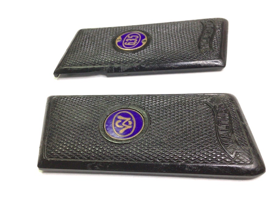 7/15/24 – This is an original pair of Walther model 8 grips from early/pre WW2. The bakelite grip panels are in great condition. They show minor wear and a small chip on the leading edge of the left panel. Priced accordingly.