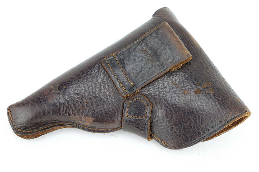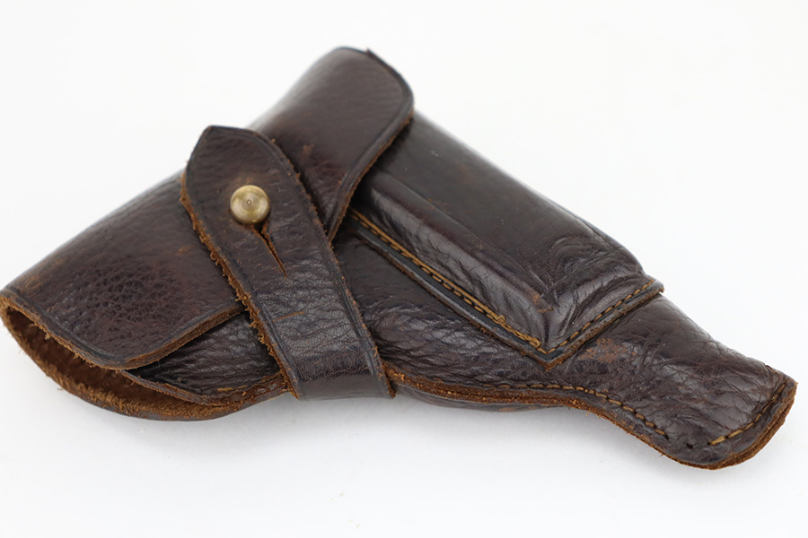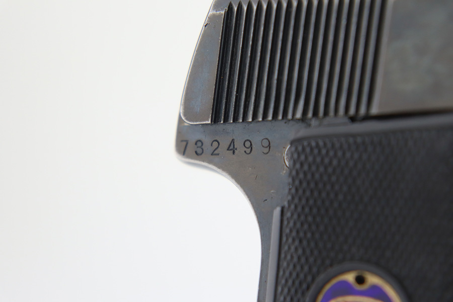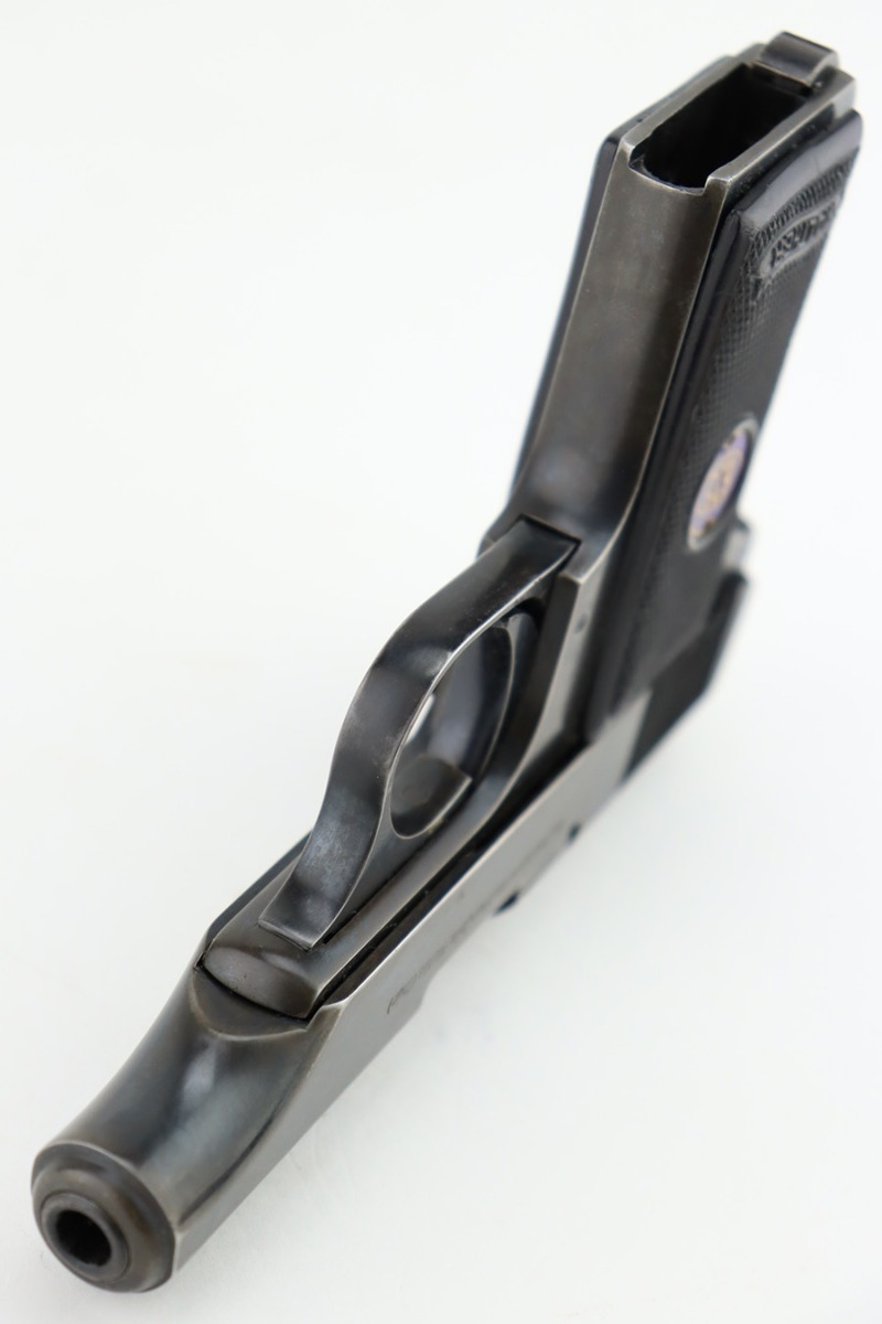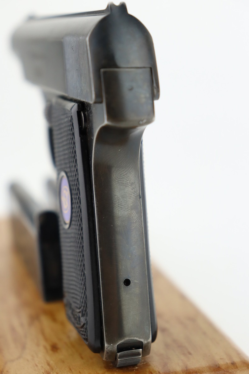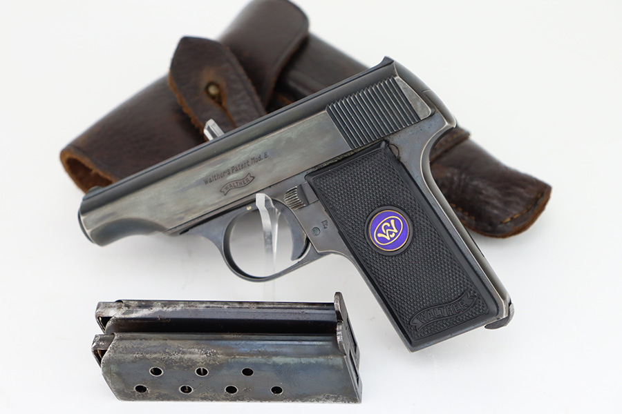 1/5/24 – This is a Walther Model 8 from the 1930’s. All matching and “Crown N” proofed. It comes as a rig with a nice leather holster and two proper “Walther” marked magazines. The gun’s bluing rates about 93-94% with general high edge wear and spotty brown patina visible under the finish throughout. Fitted with excellent period-correct grips. Minty bore.