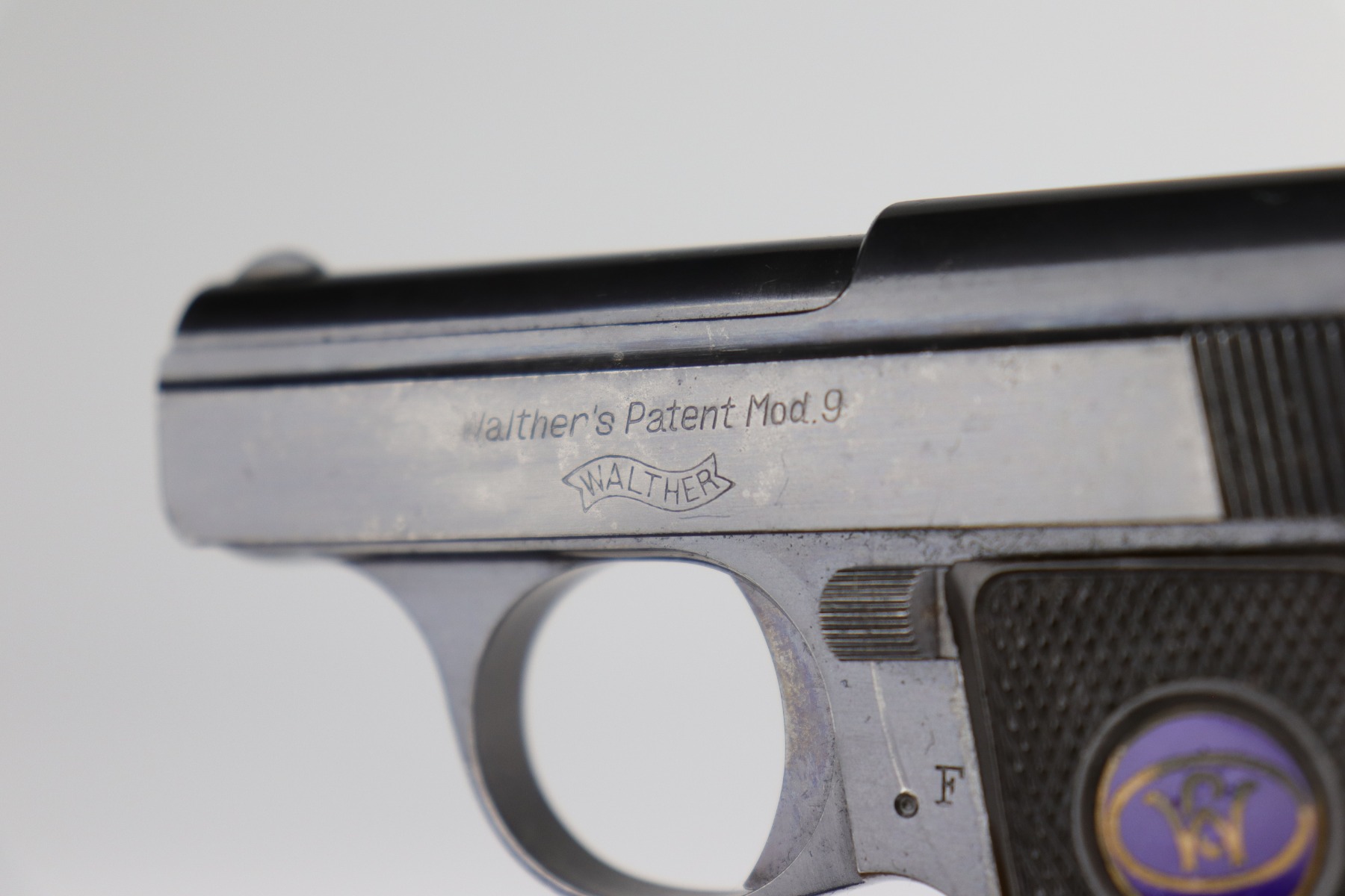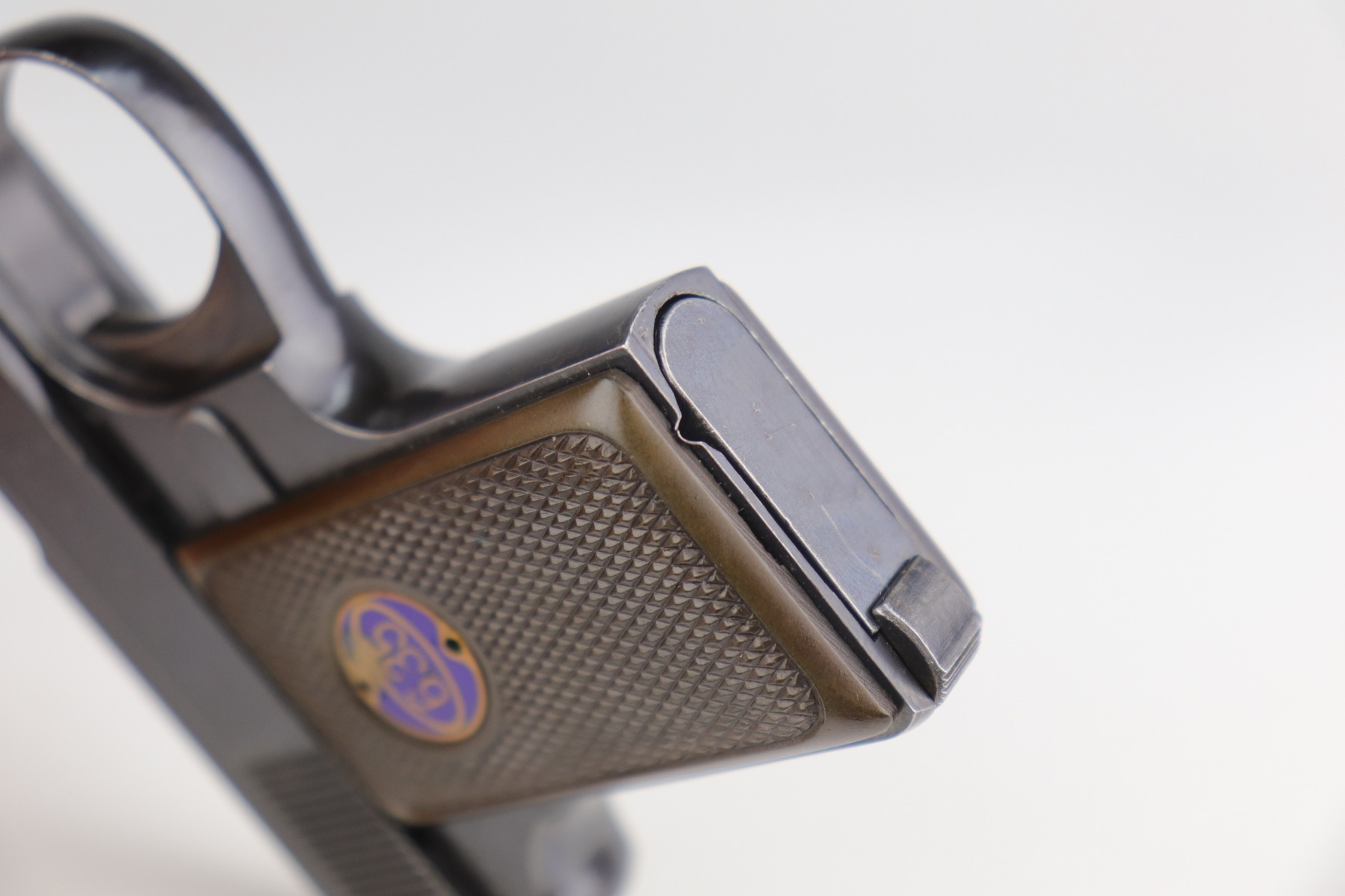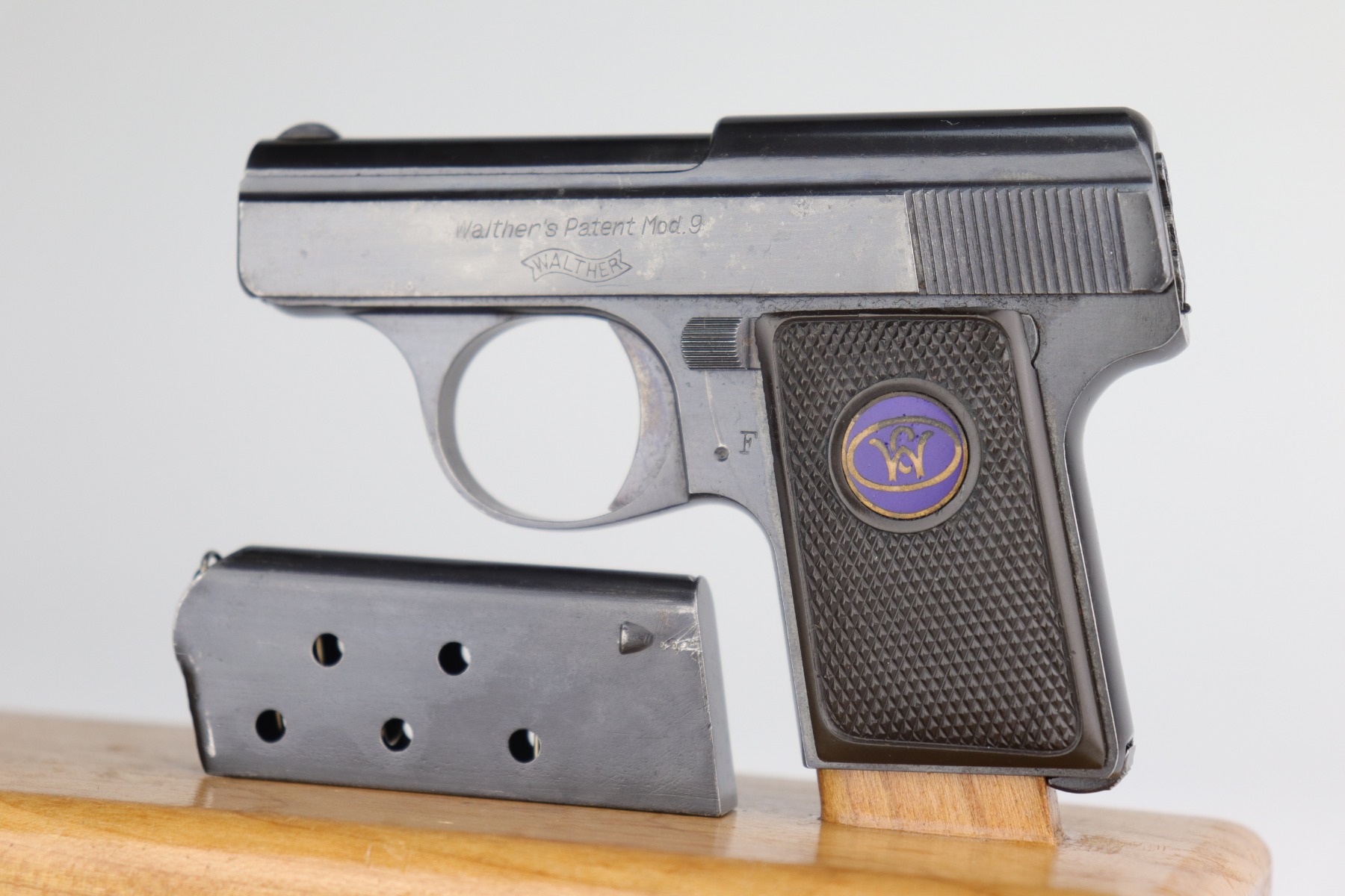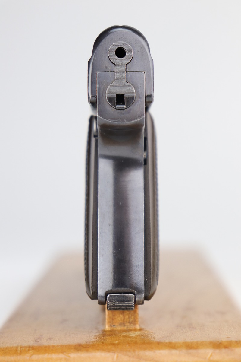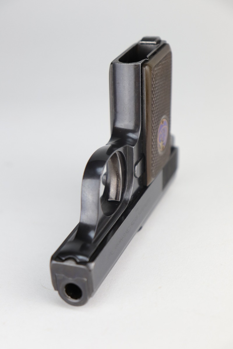 12/15/20 – This is a very nice example of a Walther Model 9. It is all correct and has the proper “Crown N” proofs. It has retained about 90% of its bluing. There is spotty wear on the left side of the slide and areas of tiny freckling on the right side of the slide. Comes with excellent grips and a correct magazine. There is one small ding on the bottom of the frame (see photo). The bore is excellent – shiny with strong rifling.