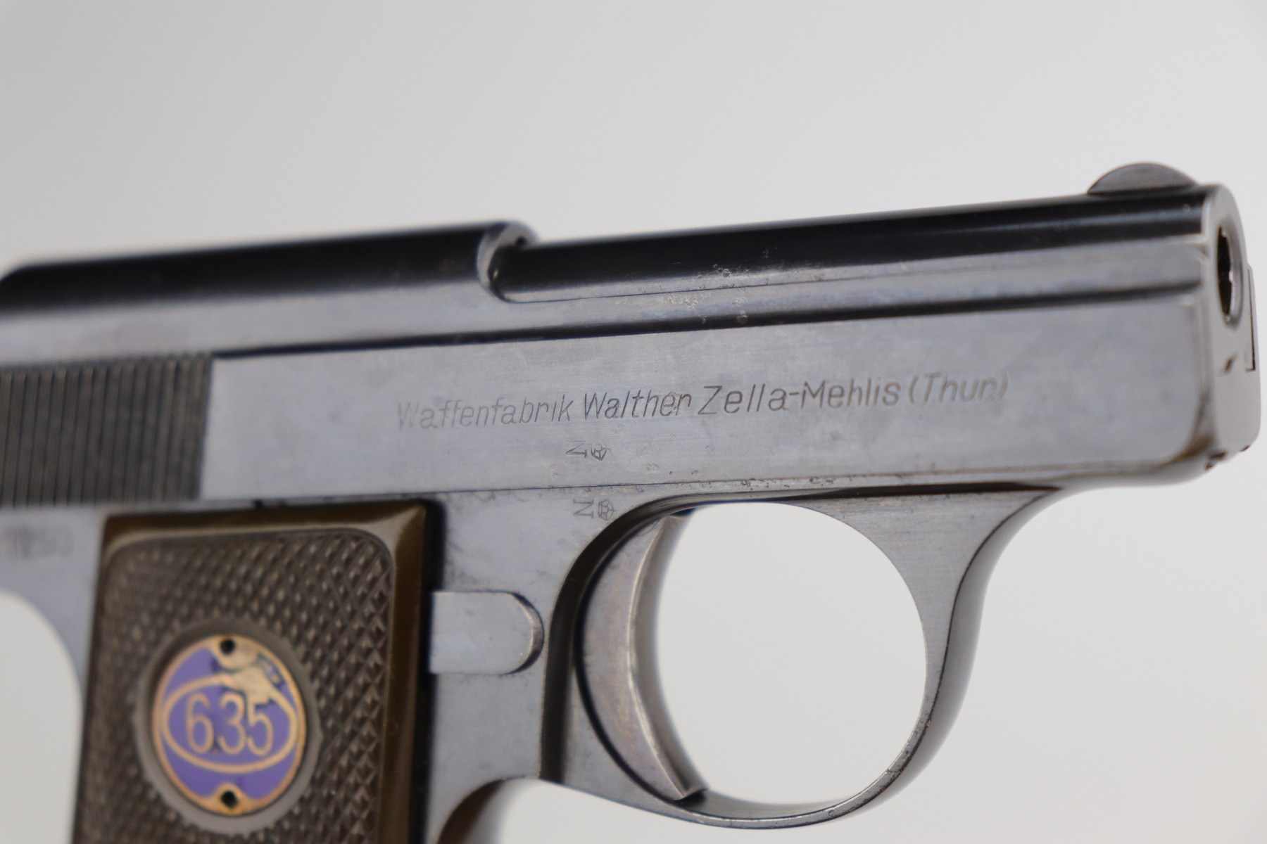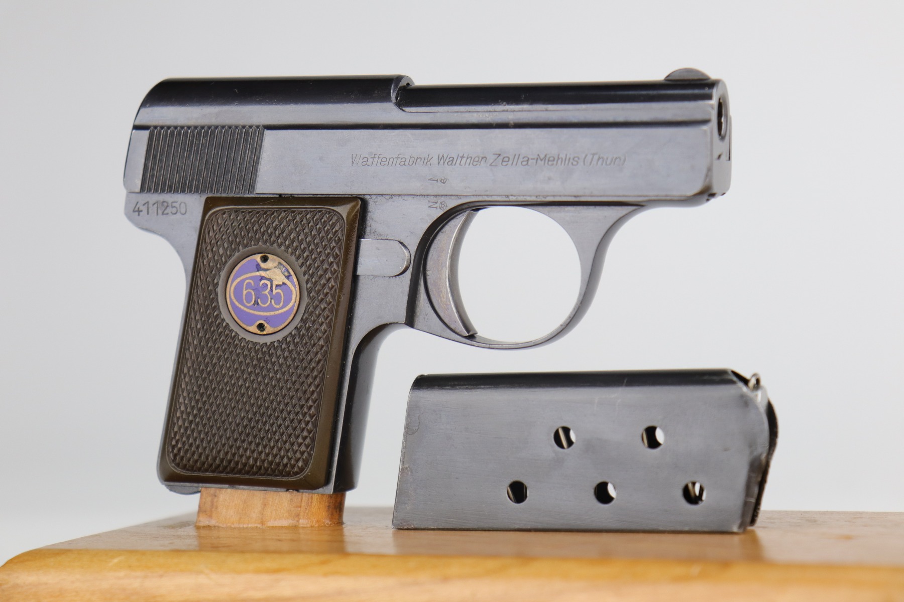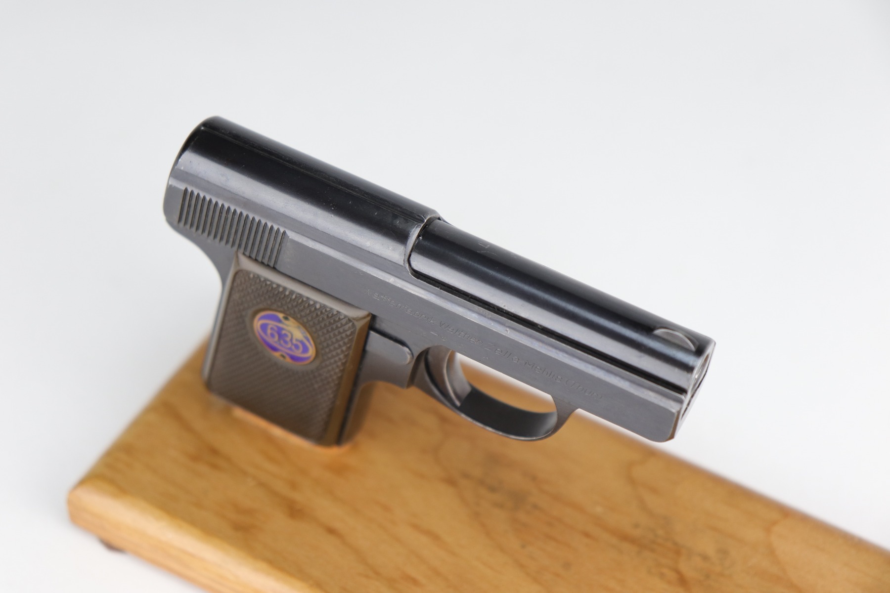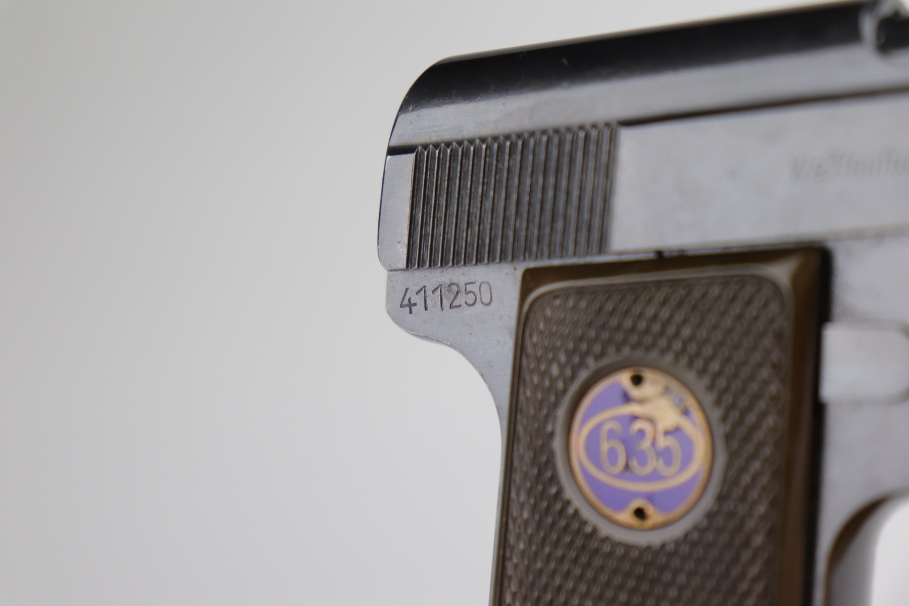 12/15/20 – This is a very nice example of a Walther Model 9. It is all correct and has the proper “Crown N” proofs. It has retained about 90% of its bluing. There is spotty wear on the left side of the slide and areas of tiny freckling on the right side of the slide. Comes with excellent grips and a correct magazine. There is one small ding on the bottom of the frame (see photo). The bore is excellent – shiny with strong rifling.